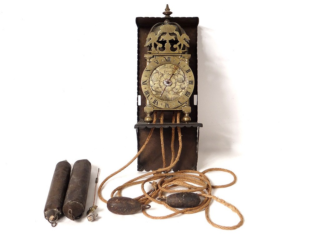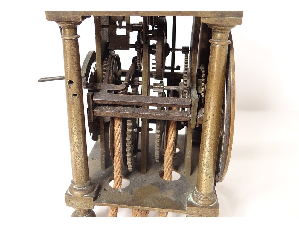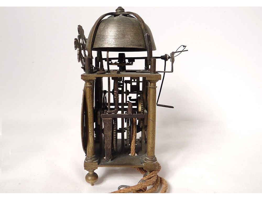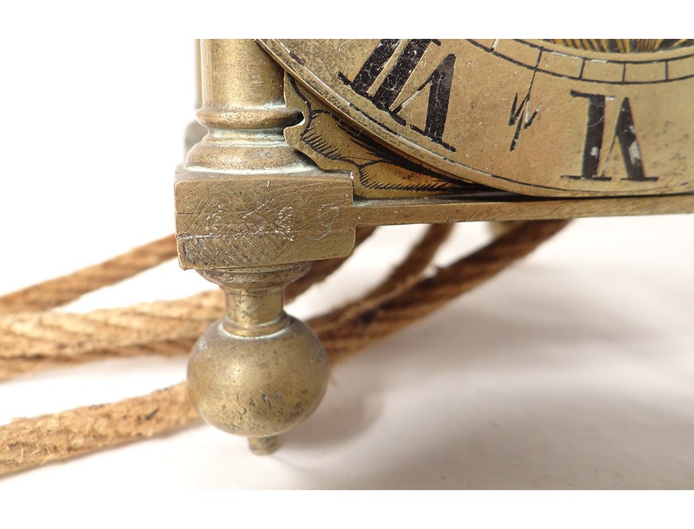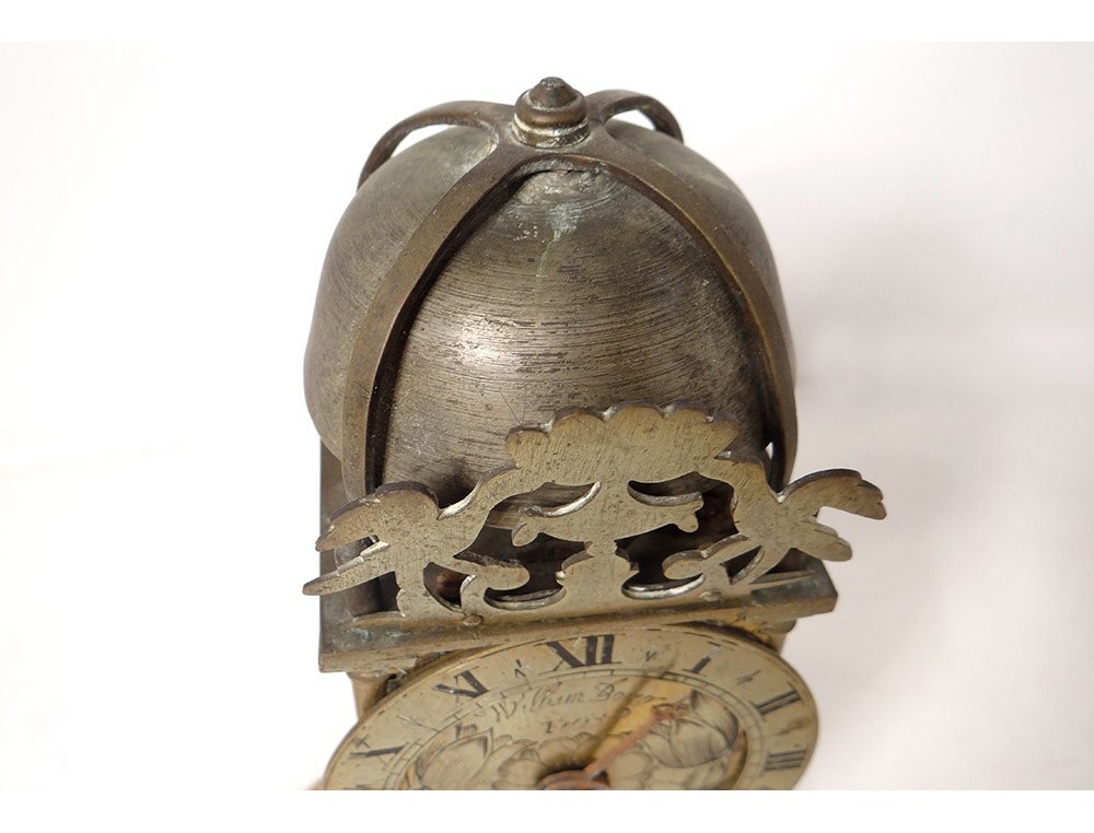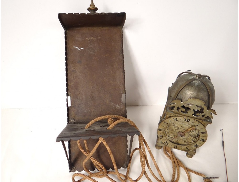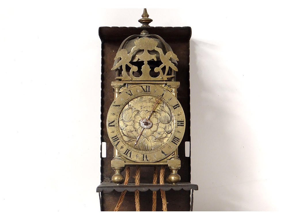 "Capucine" wall clock in polished iron, bronze and chiseled brass, double dial with Roman numerals, central dial decorated with flowers and signed "William Bower * fecit", uprights with balusters resting on feet balls, pediment openwork with foliage pattern, with its console iron wall, and its weight, dated 1626, Louis XIII early seventeenth century.