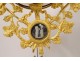 Directoire portico clock in white (and black) marble and finely chiseled gilt bronze ornamentation, decorated with two fluted columns surmounted by pine cones, above the dial (enamelled with Roman numerals) adorned with a vase of flowers, below the decorated dial vine branches surrounding a Wedgwood medallion, mascaron balance in the shape of a sun, from the late 18th century.