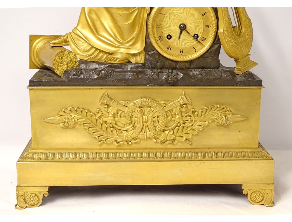 Gilt bronze clock representing a beautiful young woman "Madame de Staël" sitting on the dial (in guilloché bronze, with Roman numerals) holding a lyre and at her feet a fragment of a column, from the Restoration period in the early 19th century.