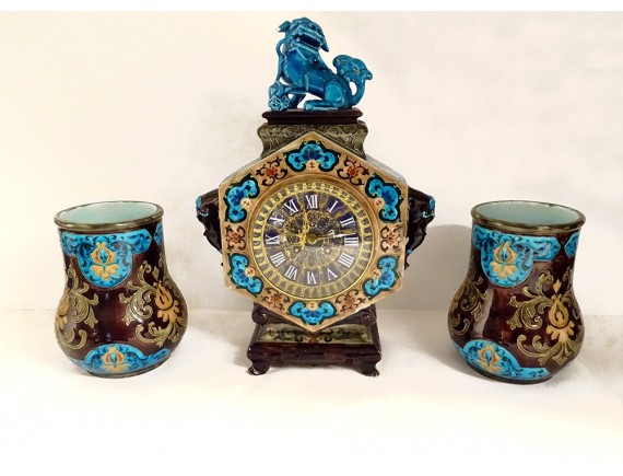 Mantelpiece set comprising a clock and two vases, in fine polychrome Bordeaux earthenware signed Jules Vieillard*, hexagonal-shaped clock surmounted by a Fô dog, on each side heads of elephants and herons, resting on a rectangular base , dial with Roman enameled numerals, vases with foliage motifs, from the late 19th century.