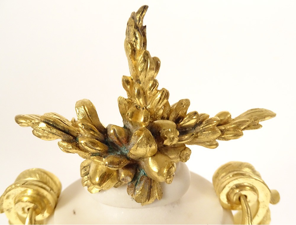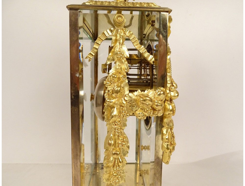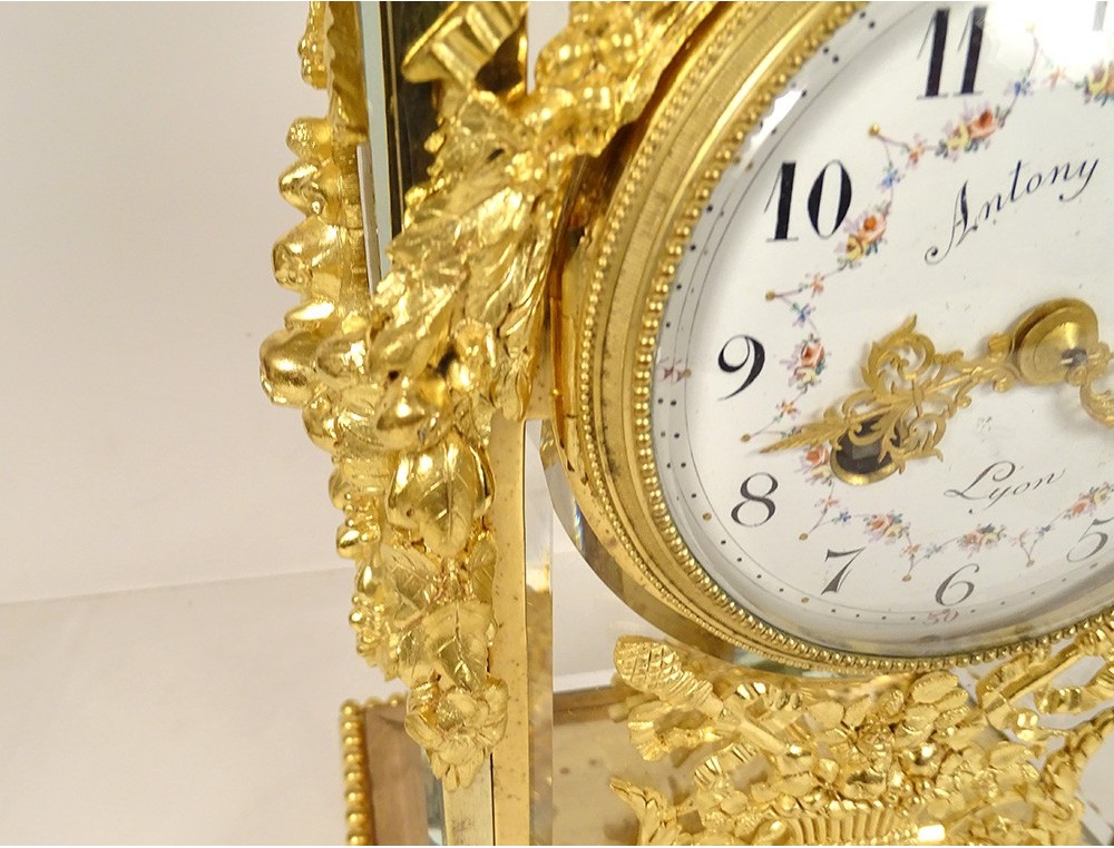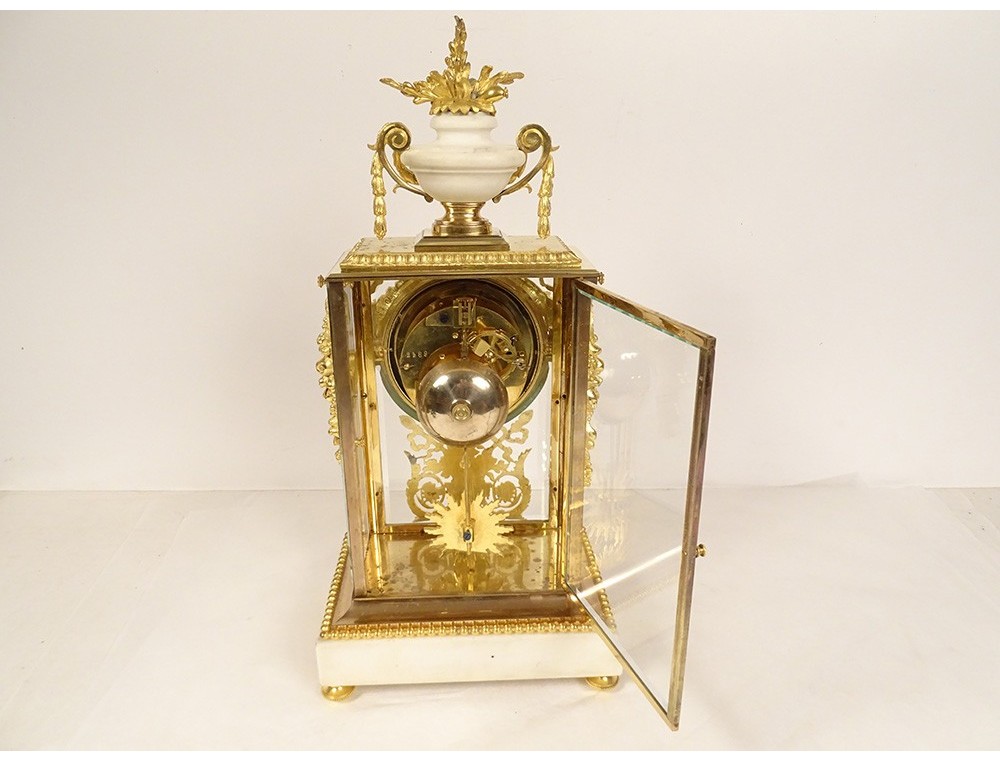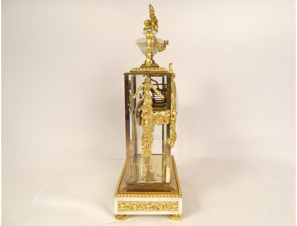 Louis XVI clock called "cage", in white marble and gilded bronze, decorated with a flowered cup at the top, plant and floral garlands, a knot and a fruit basket with scroll motifs, 4 spinning top feet, enameled dial signed Antony Bailly Lyon, beveled windows, pendulum in the shape of a sunburst, from the Napoleon III 19th century period.