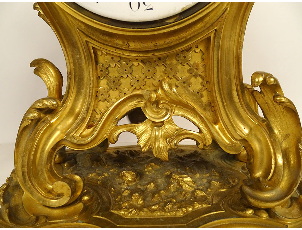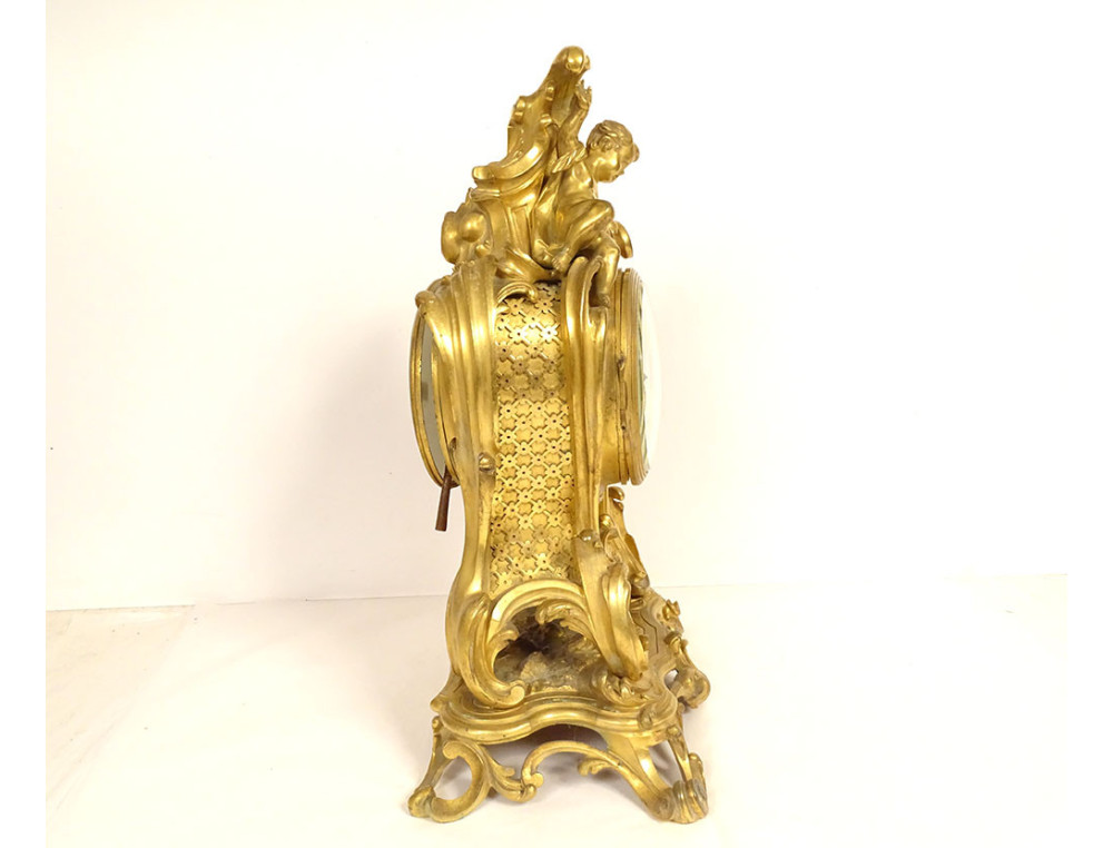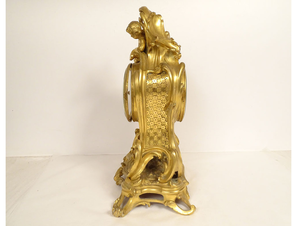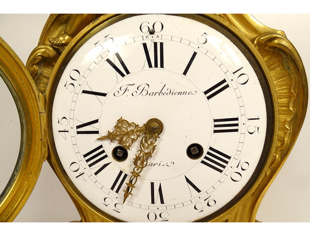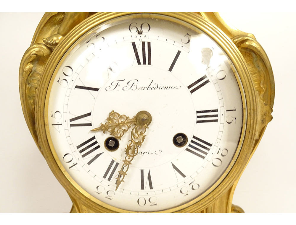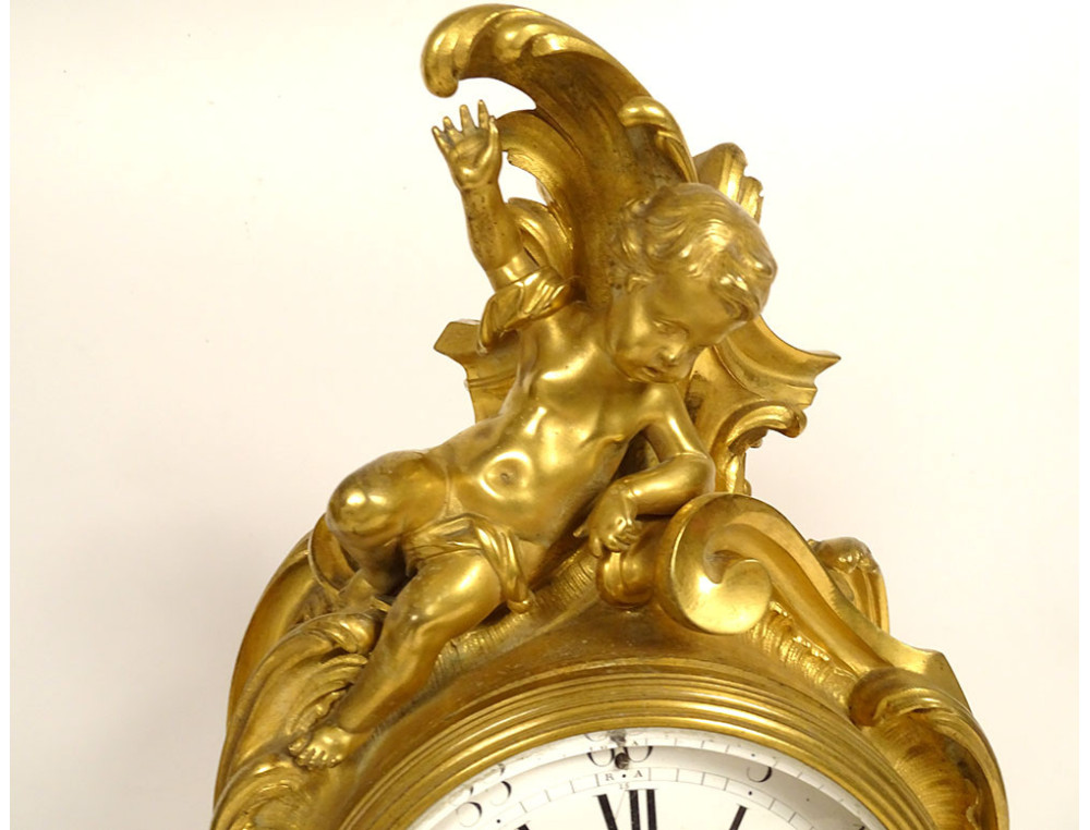 Small Louis XV cartel clock in finely chiseled gilt bronze, decorated with a reclining cherub at the top, body and base decorated with foliate motifs, sides decorated with a trellis of flowers, enamelled dial with Roman numerals signed F. Barbedienne* in Paris, Napoleon III period, 19th century.