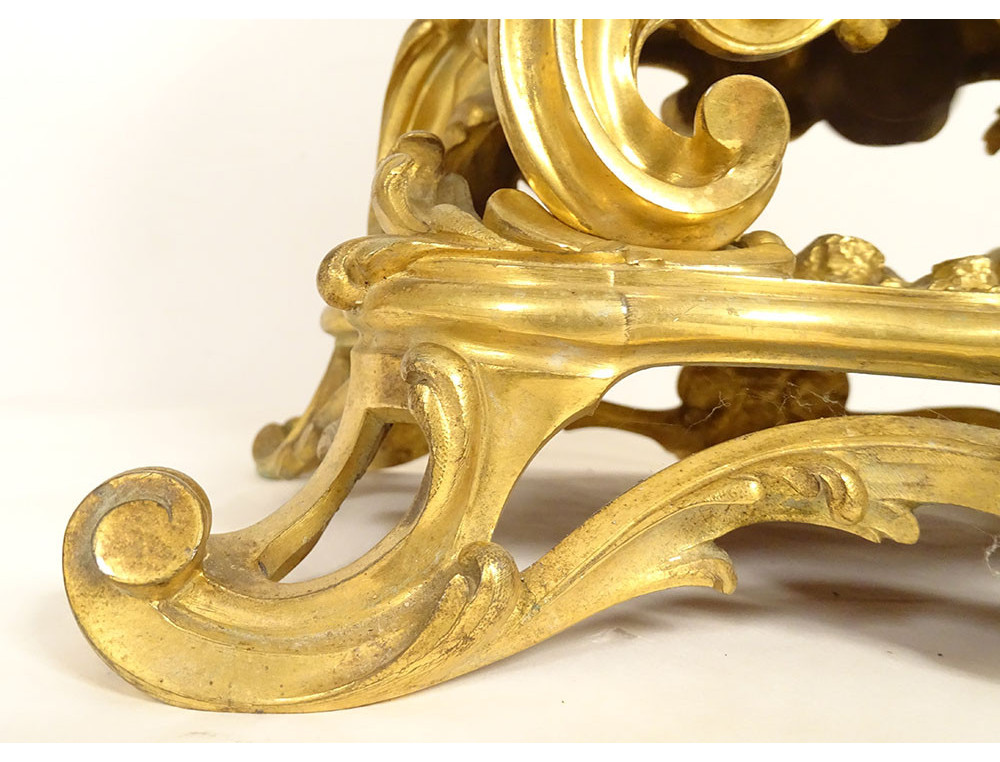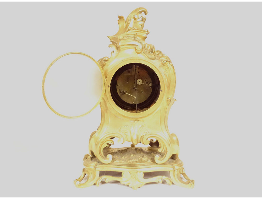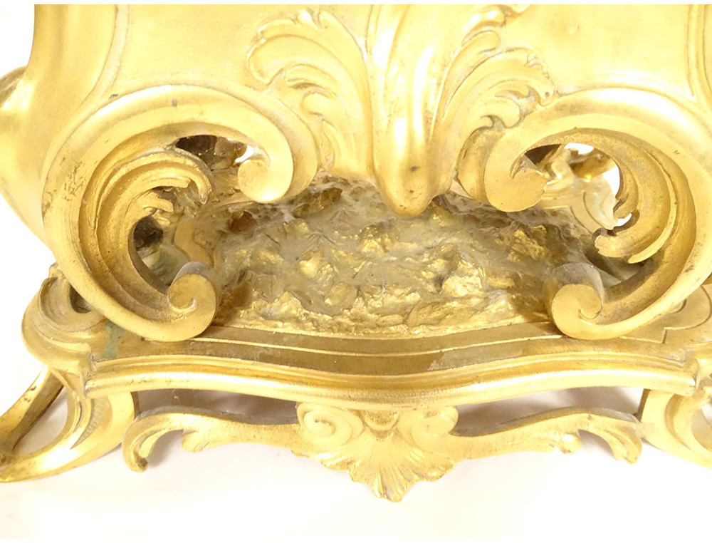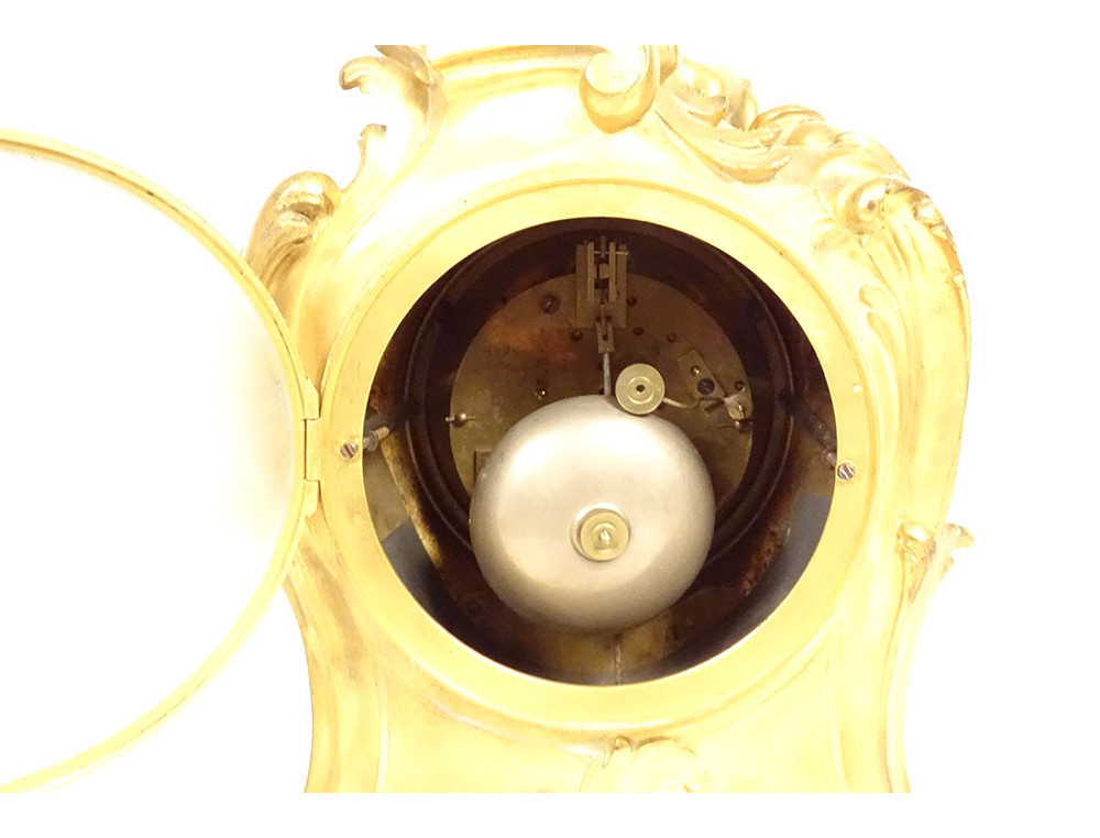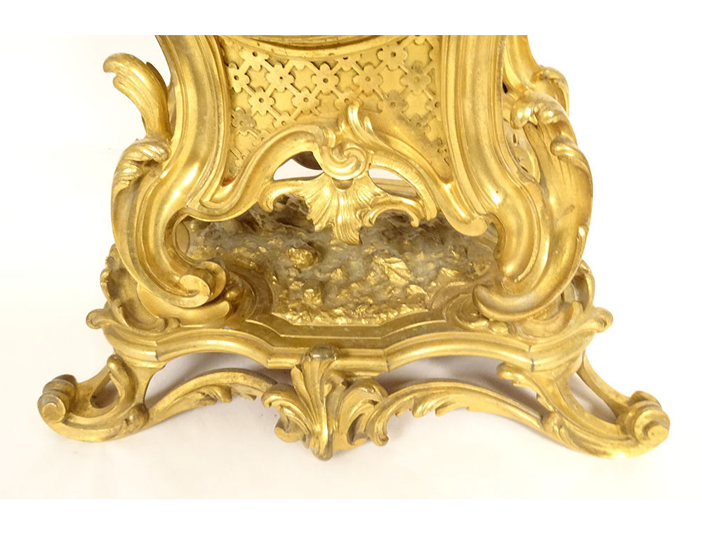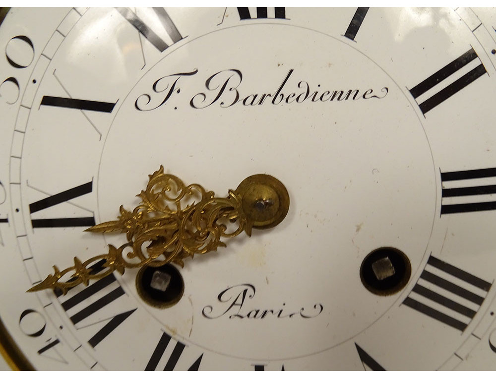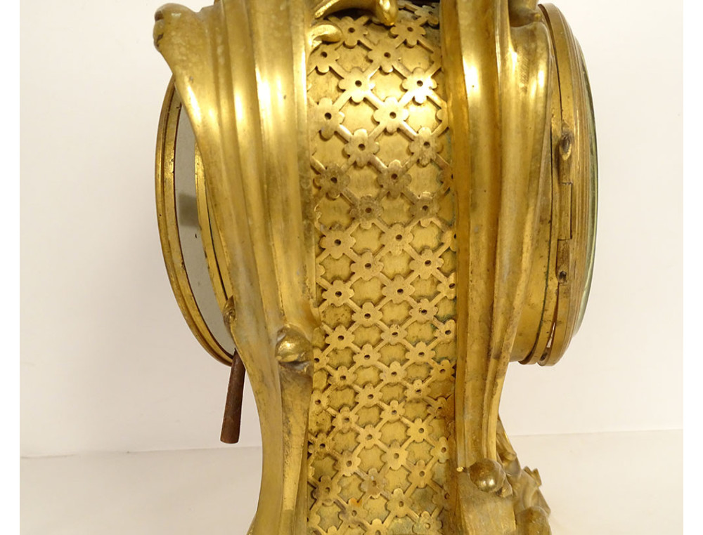 Small Louis XV cartel clock in finely chiseled gilt bronze, decorated with a reclining cherub at the top, body and base decorated with foliate motifs, sides decorated with a trellis of flowers, enamelled dial with Roman numerals signed F. Barbedienne* in Paris, Napoleon III period, 19th century.