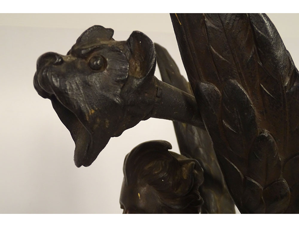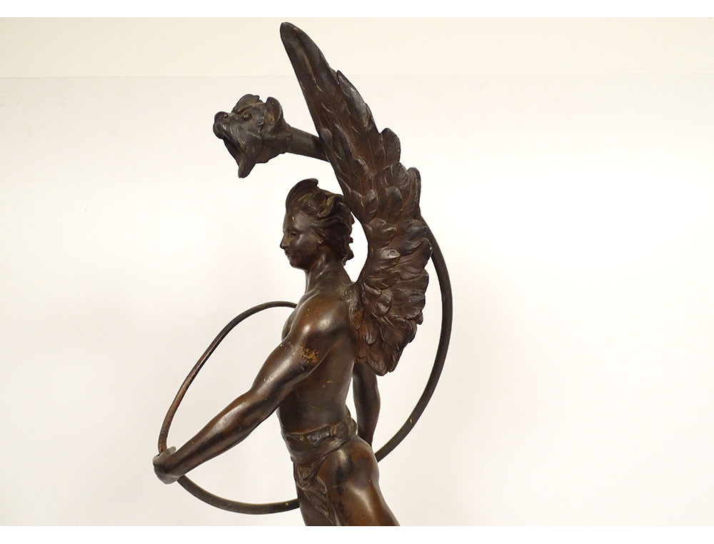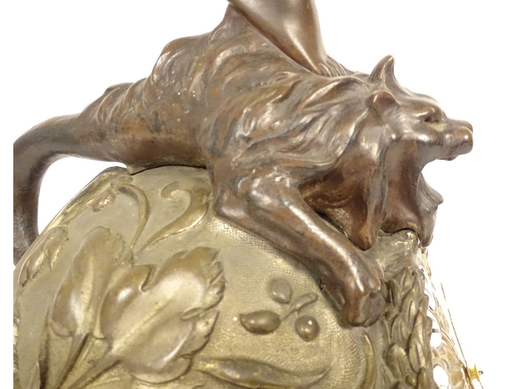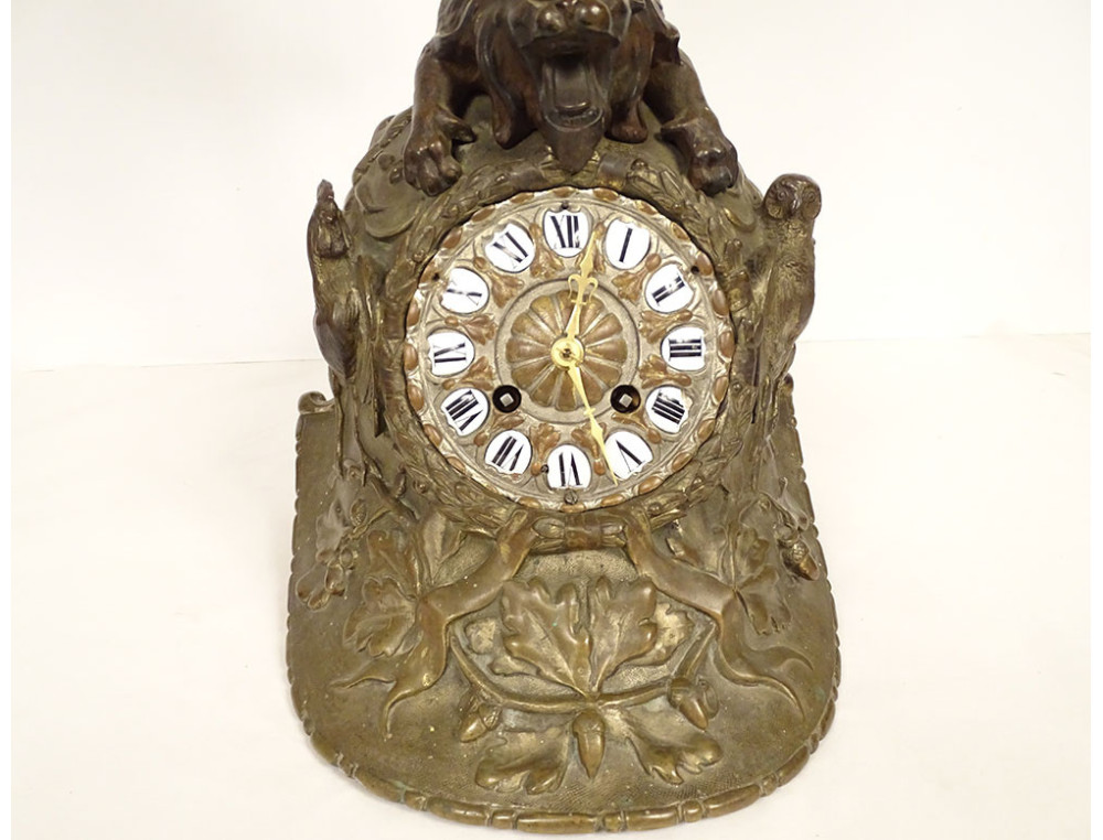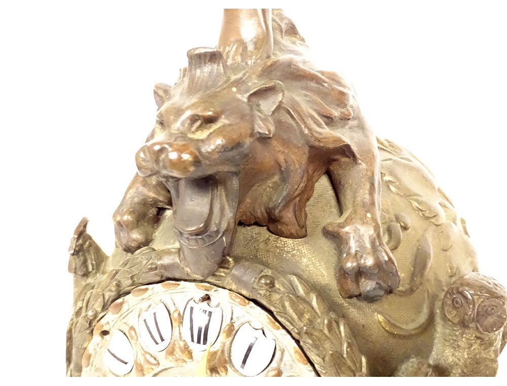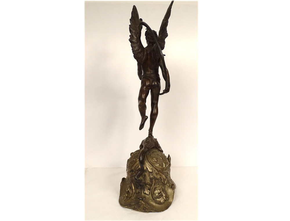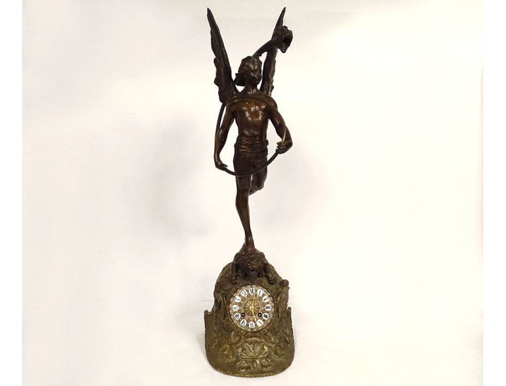 Rare large bronze clock with two patinas (brown and gold) representing an angel holding a horn with an animal head, the Archangel Saint Michael standing on the dragon (symbol of the Victory of Good over Evil), the latter lying on the clock in the shape of a helmet with rich decoration of oak leaves, and a rooster and an owl on either side of the dial, signed Rivière, 19th century.
