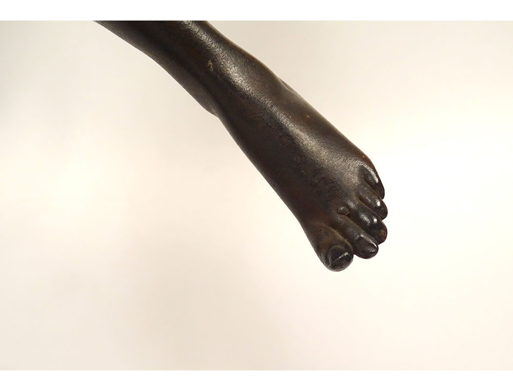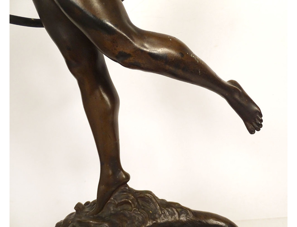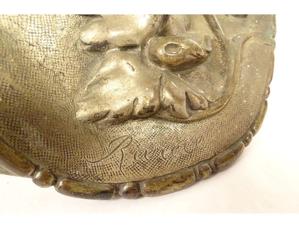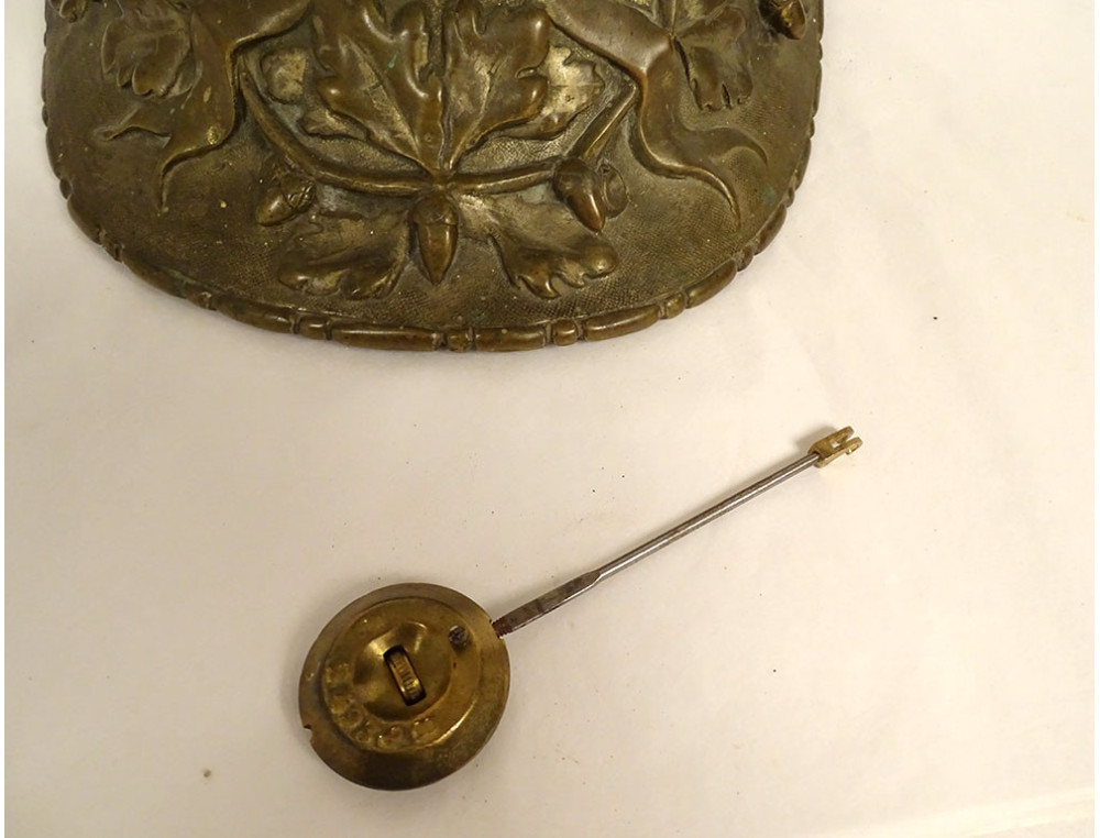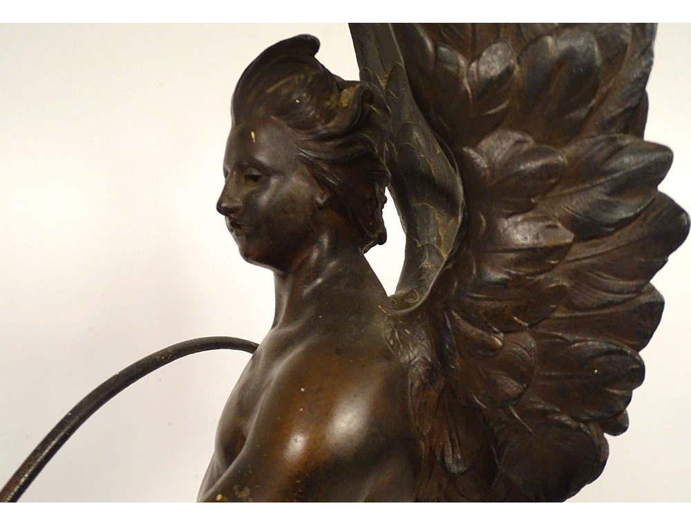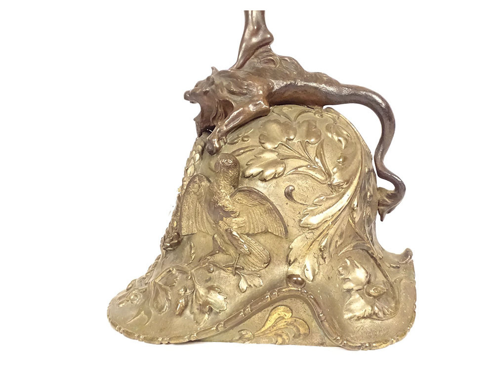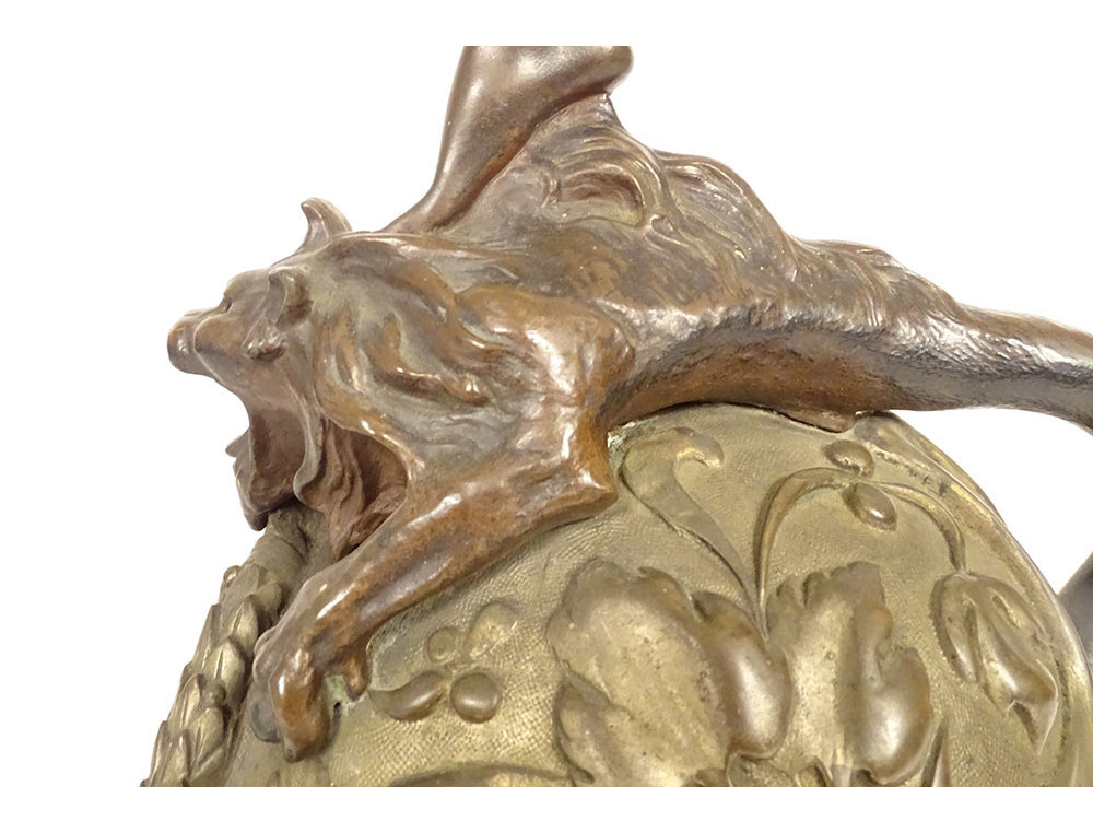 Rare large bronze clock with two patinas (brown and gold) representing an angel holding a horn with an animal head, the Archangel Saint Michael standing on the dragon (symbol of the Victory of Good over Evil), the latter lying on the clock in the shape of a helmet with rich decoration of oak leaves, and a rooster and an owl on either side of the dial, signed Rivière, 19th century.