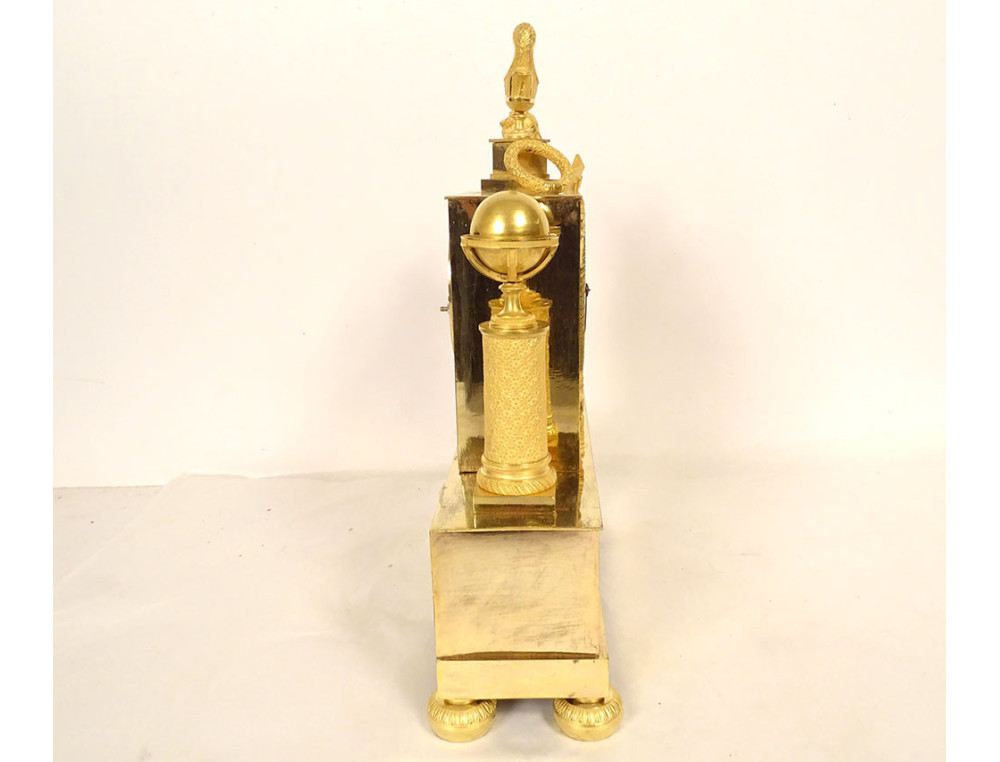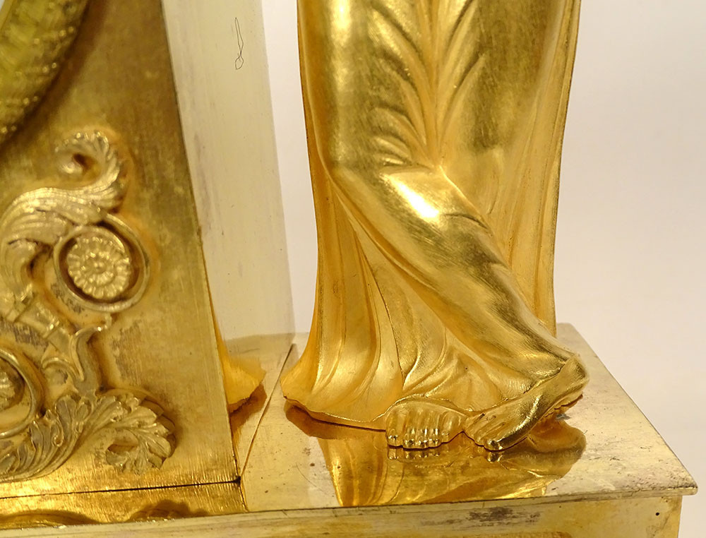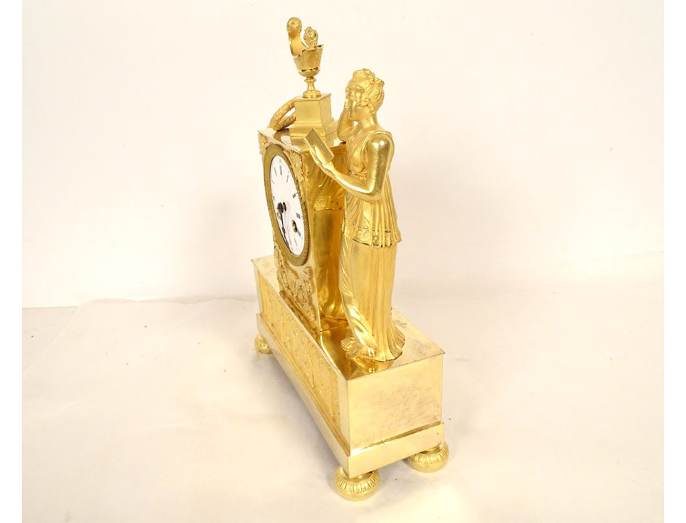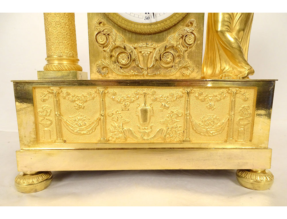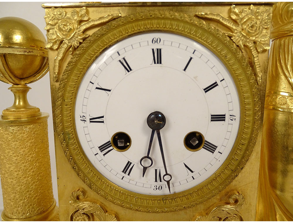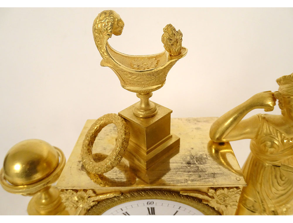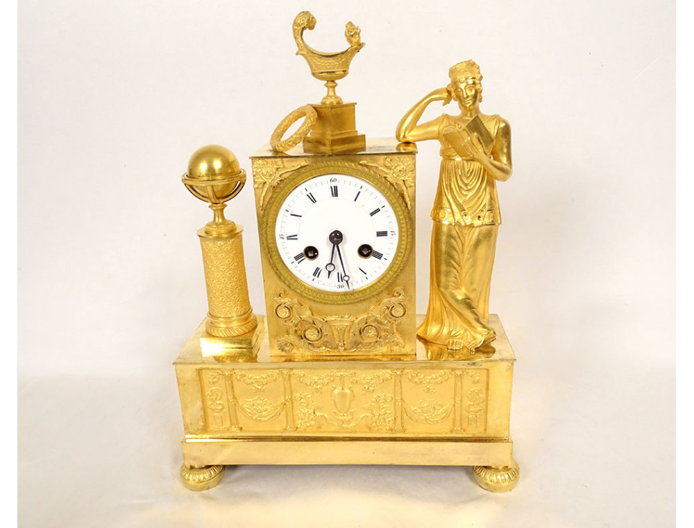 Empire clock in gilt bronze entirely chased, representing the Allegory of Knowledge, Wisdom and Science in the person of Urania (Muse of Astronomy) standing reading a book leaning on the dial on which are placed an oil lamp and a crown, on the other side a terrestrial globe, base decorated with palmettes, cornucopias and florets, from the Restoration period 19th century.