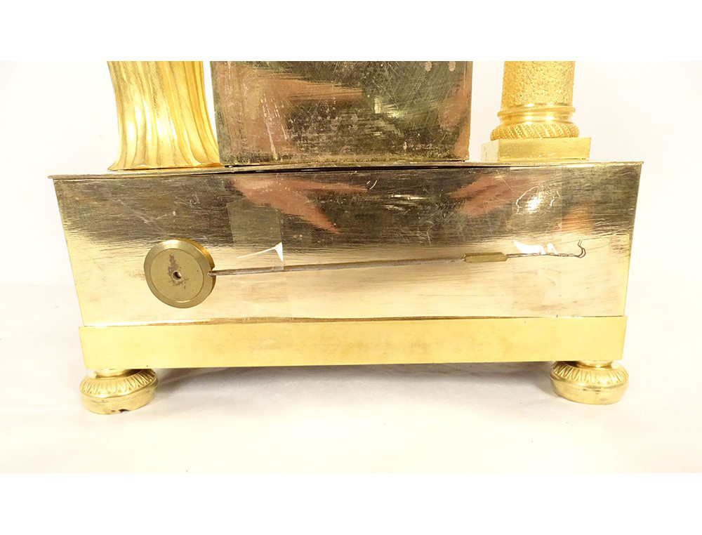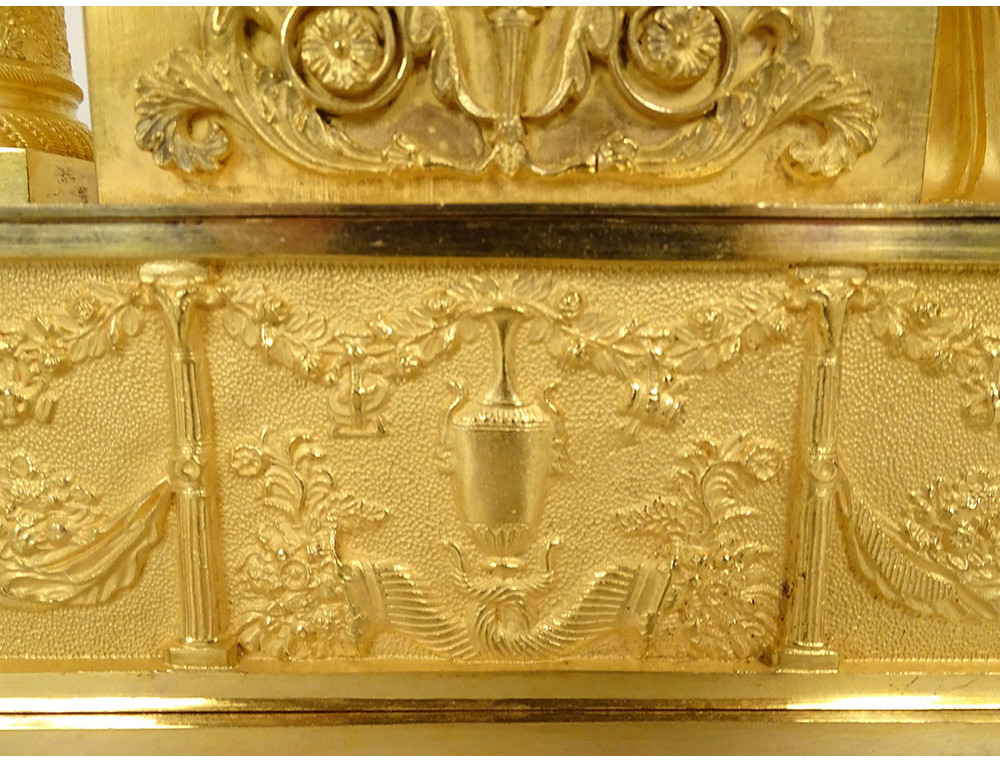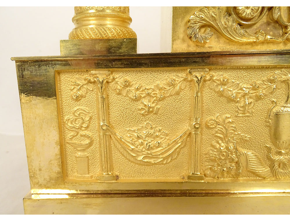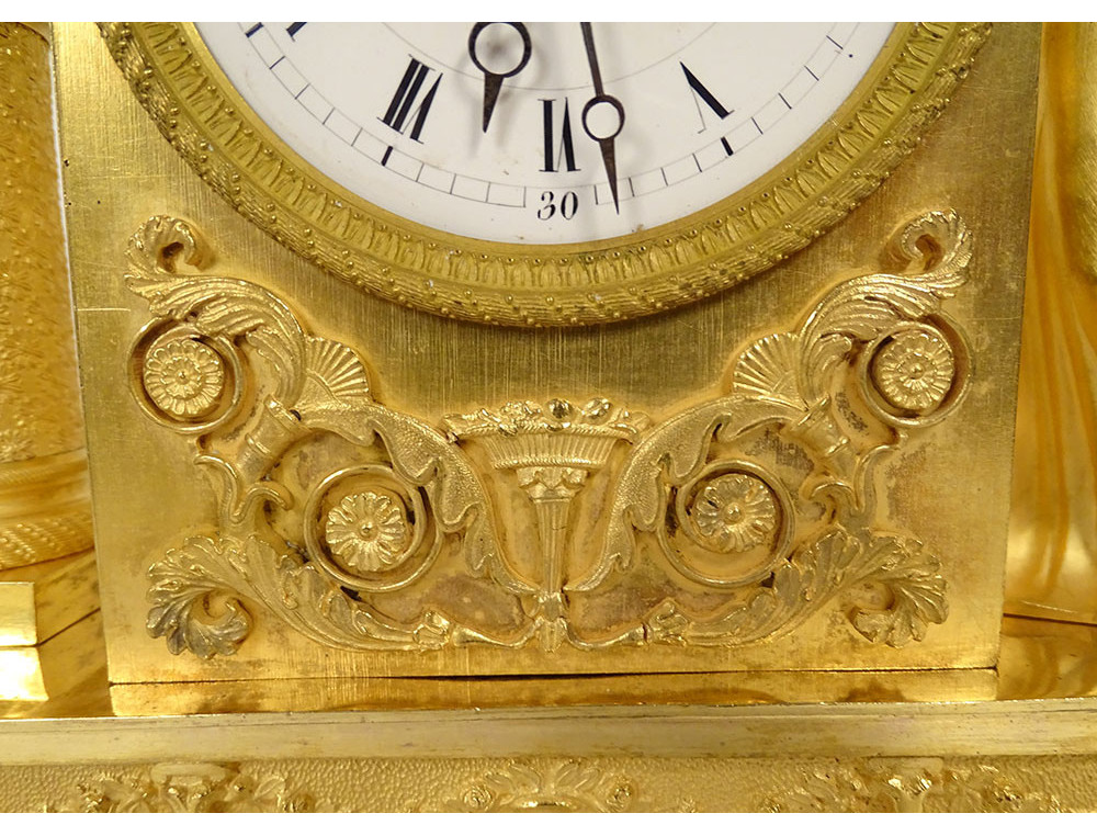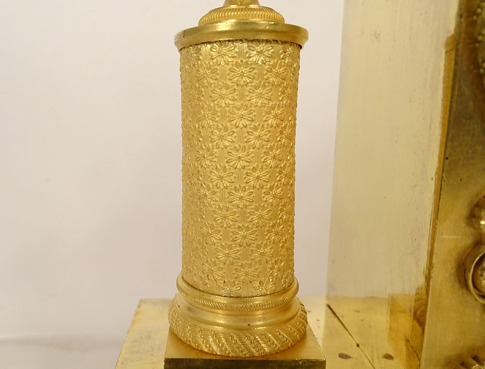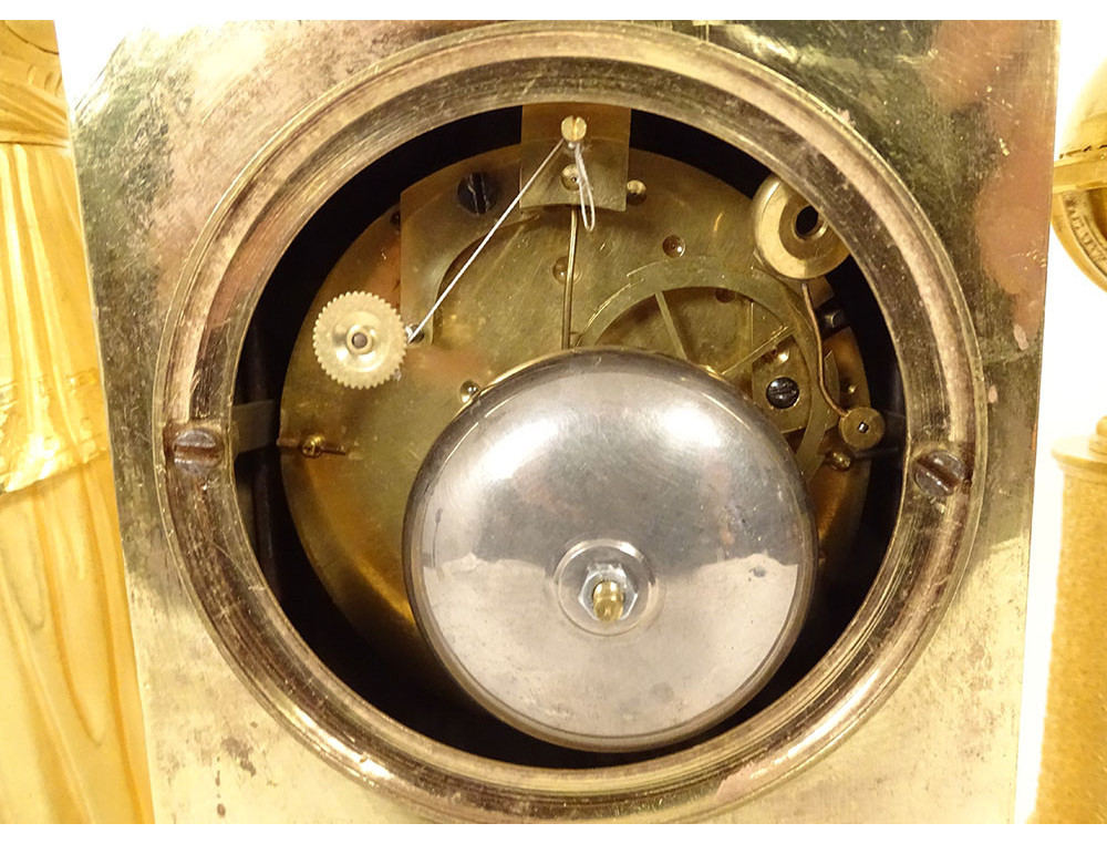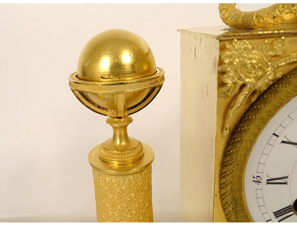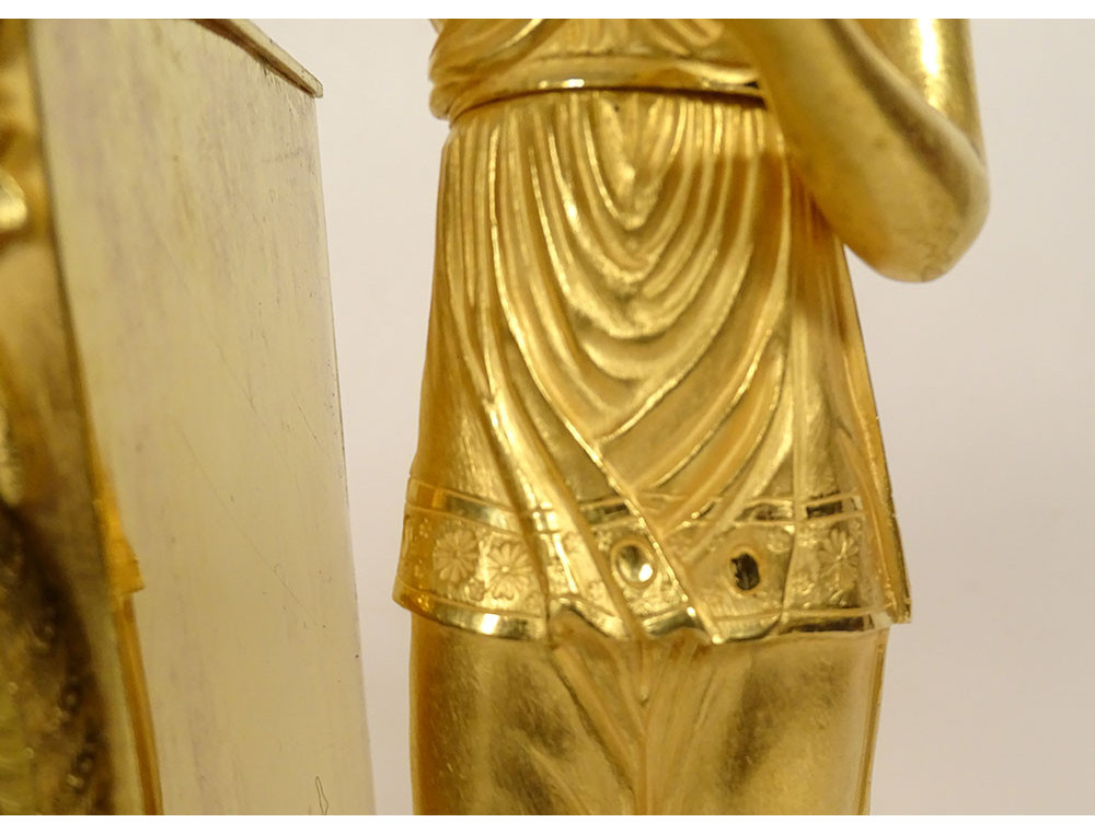 Empire clock in gilt bronze entirely chased, representing the Allegory of Knowledge, Wisdom and Science in the person of Urania (Muse of Astronomy) standing reading a book leaning on the dial on which are placed an oil lamp and a crown, on the other side a terrestrial globe, base decorated with palmettes, cornucopias and florets, from the Restoration period 19th century.