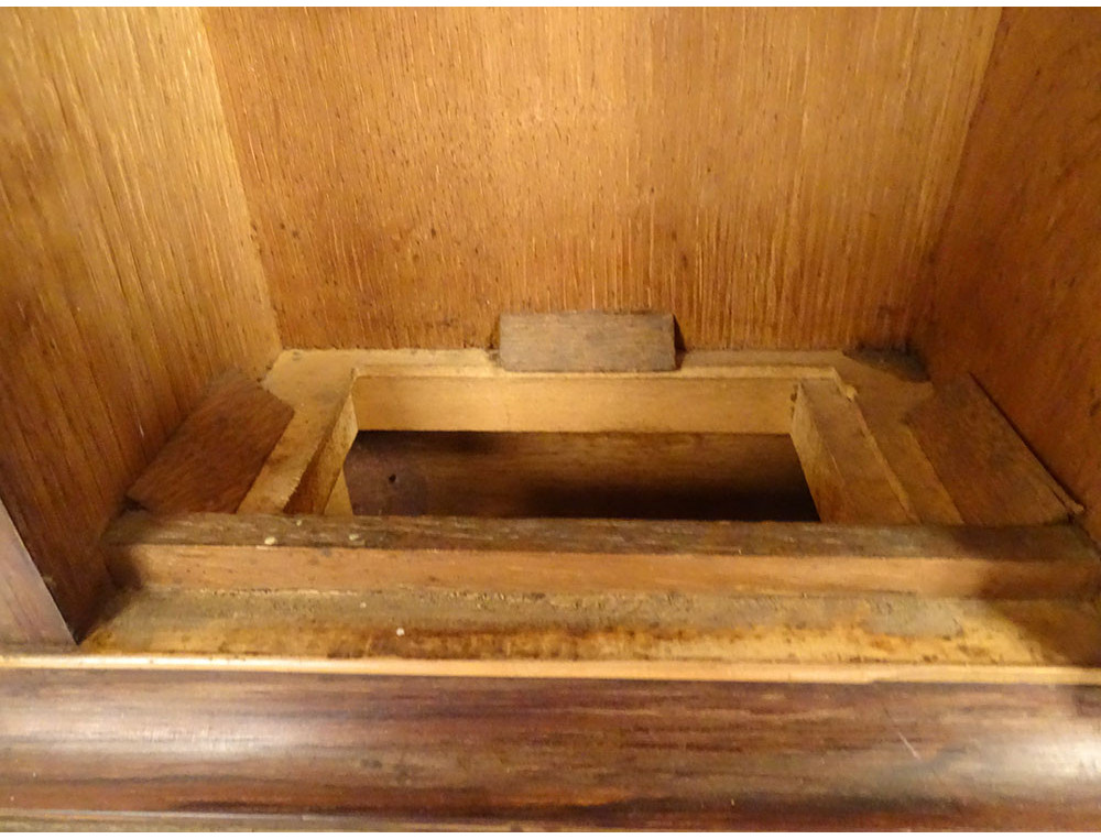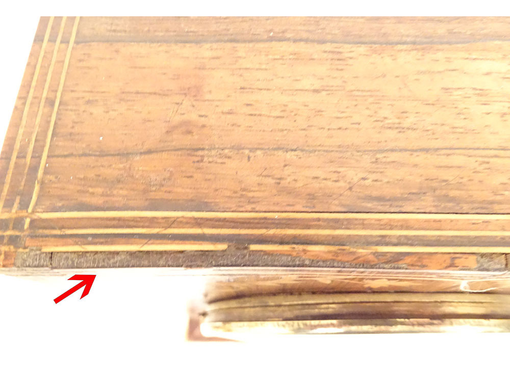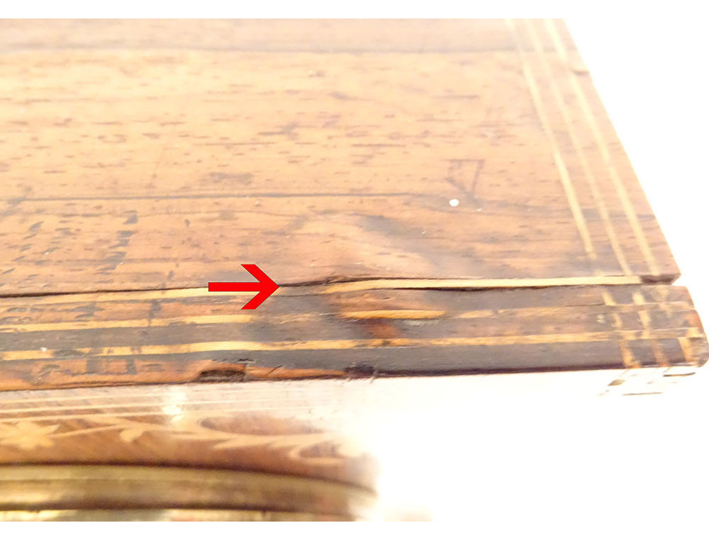 Note: some minor damage and missing marquetry, some slightly warped areas (on the top), some scratches on the wood and signs of wear from age, see photos.