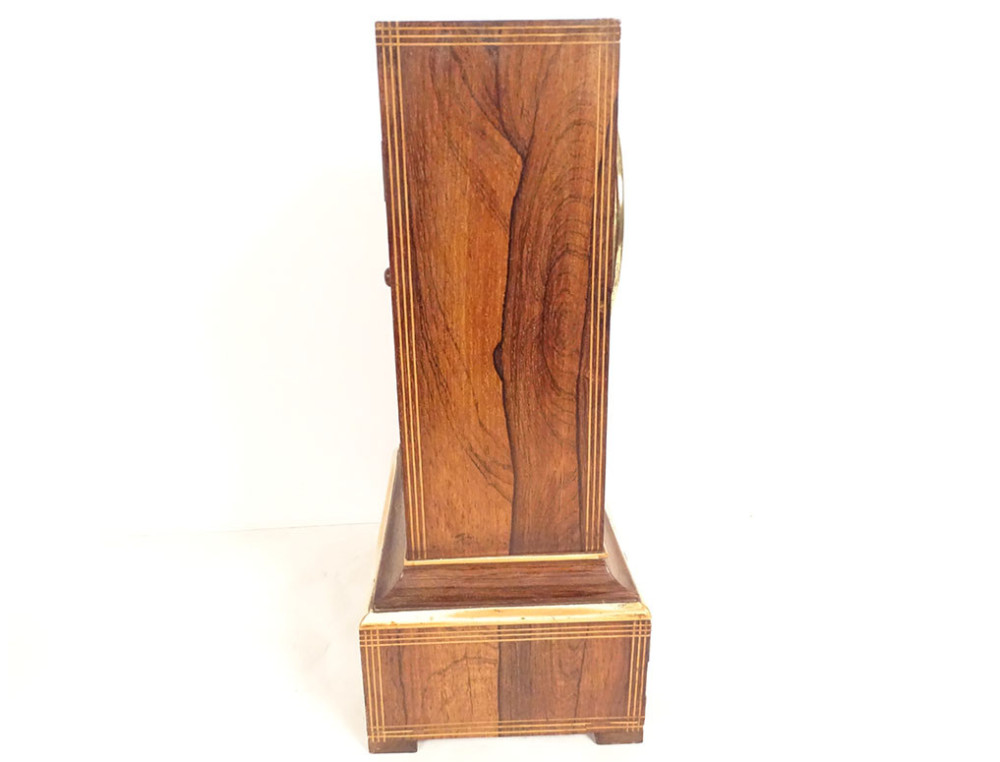 Charles X mantel clock in rosewood marquetry and light wood stringing, decorated with flowers and leafy scrolls, Roman numeral dial, chiseled bronze rim, 19th century.