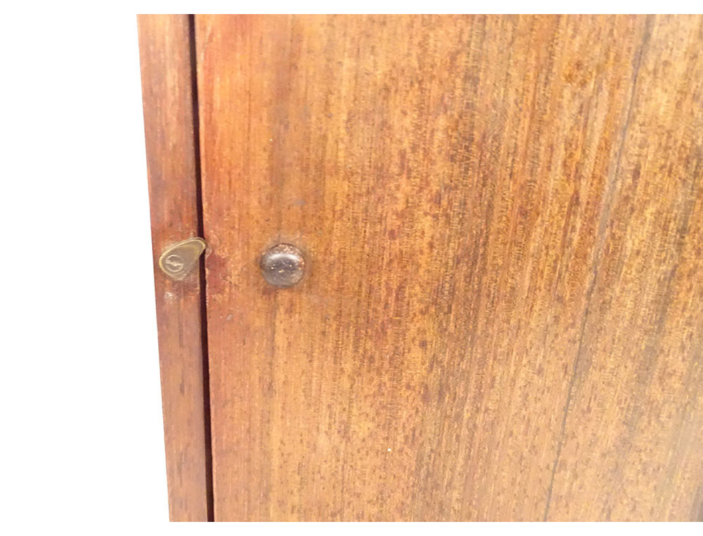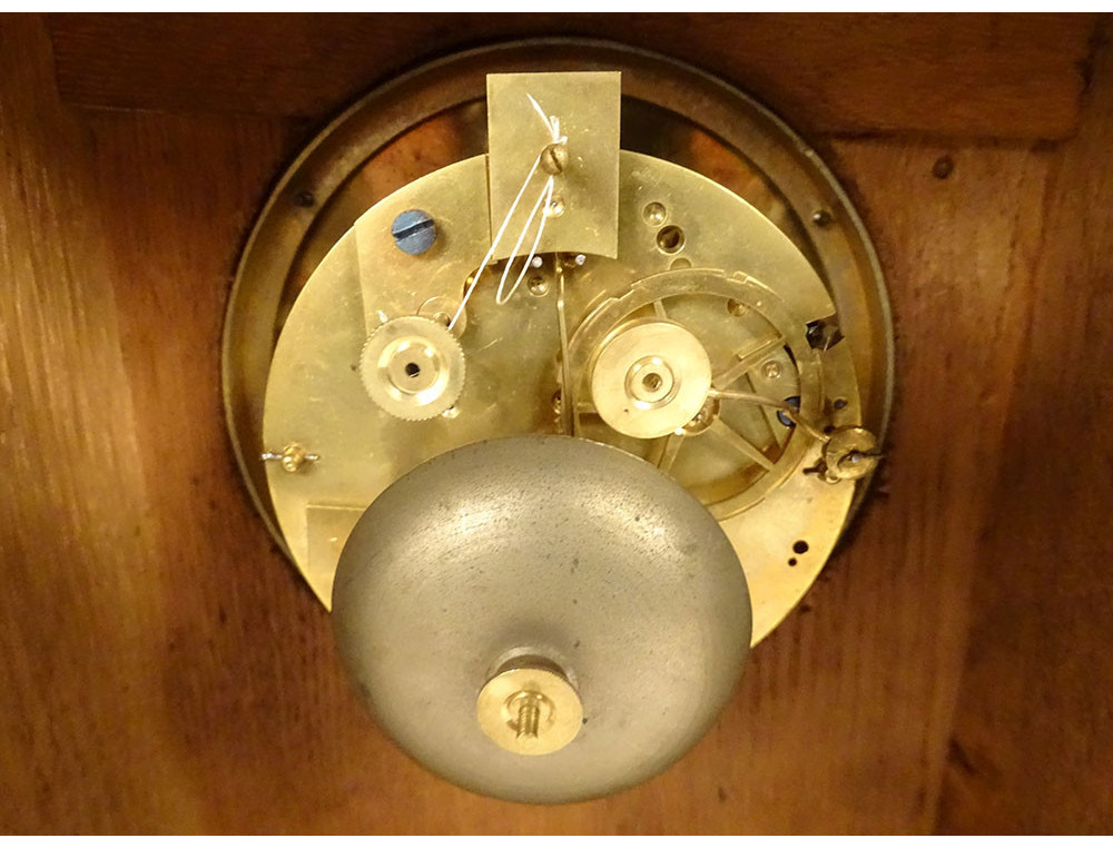 This clock is in good overall condition. The wire-driven movement is working and has been serviced. We have the pendulum but not the key.