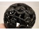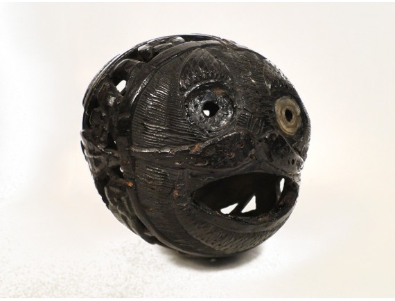 Rare coconut carved and perforated, serving as a piggy bank, decorated with an eagle with outstretched wings, flanked by two characters, as well as flowers and leaves, convict labor or marine *, of XIXth century.