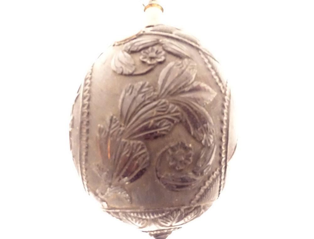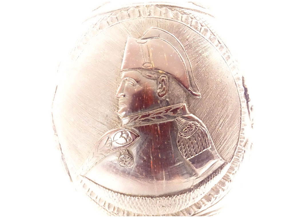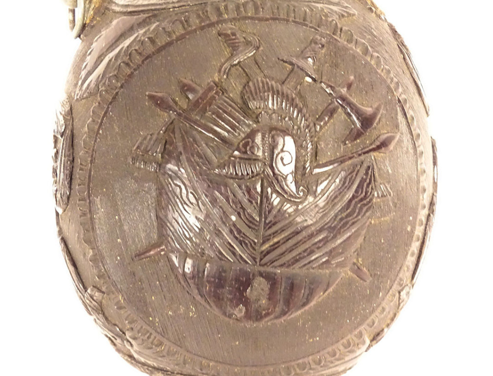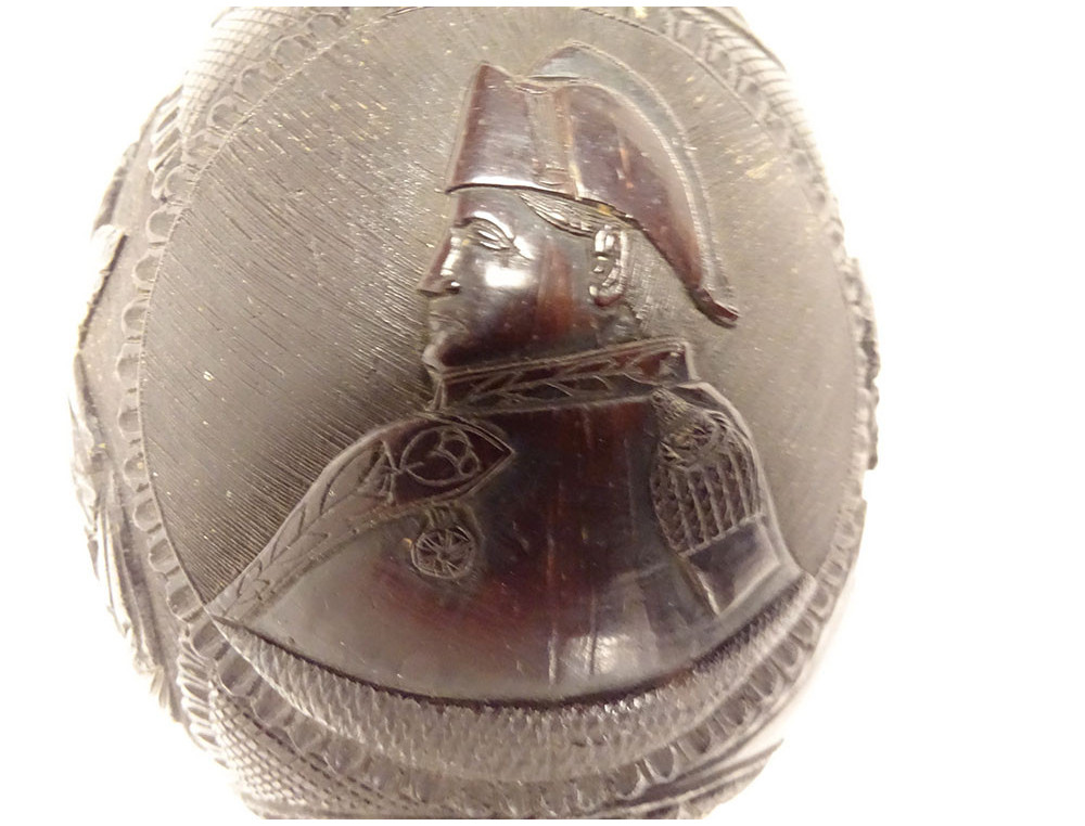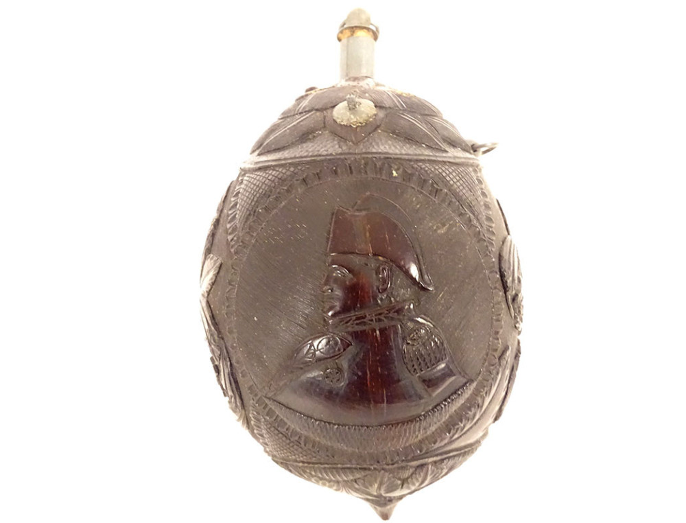 Carved coconut powder flask, decorated on one side with the profile portrait of Emperor Napoleon I; on the other with attributes of war: helmet, sword, axe, standards..., as well as a plant motif, the work of a sailor or convict, from the 19th century.
