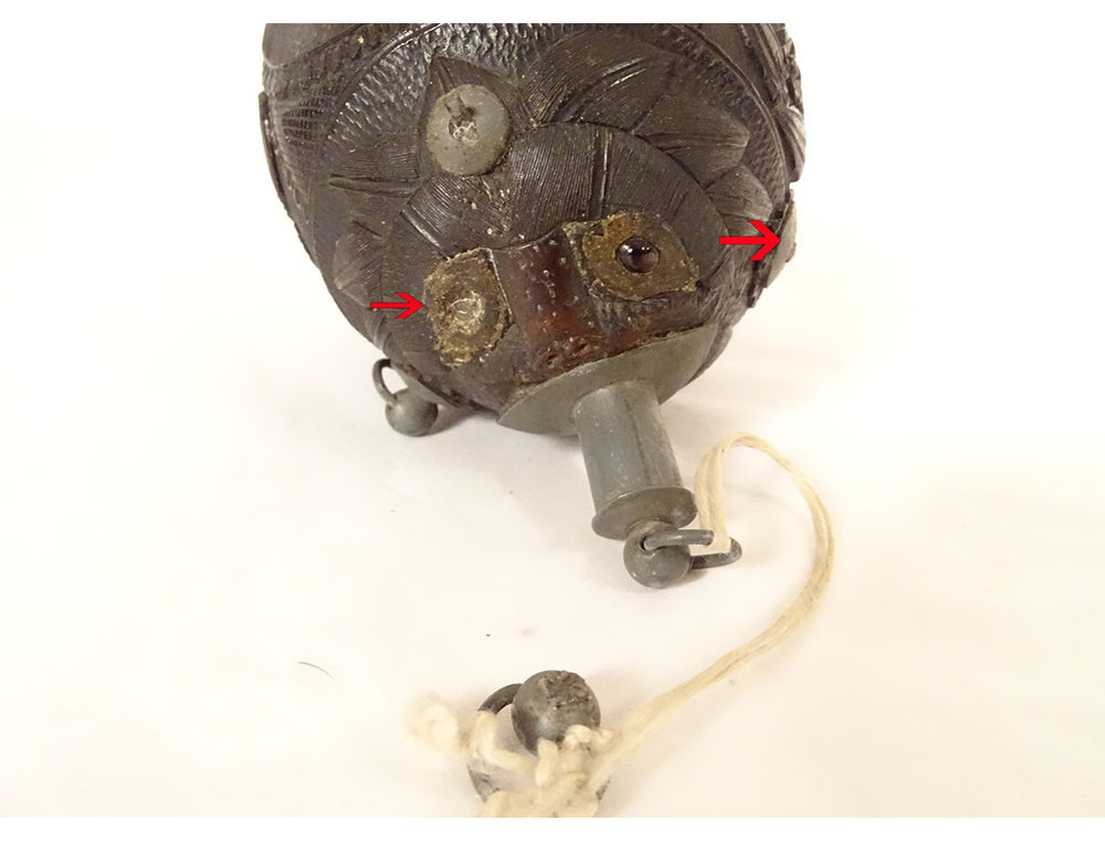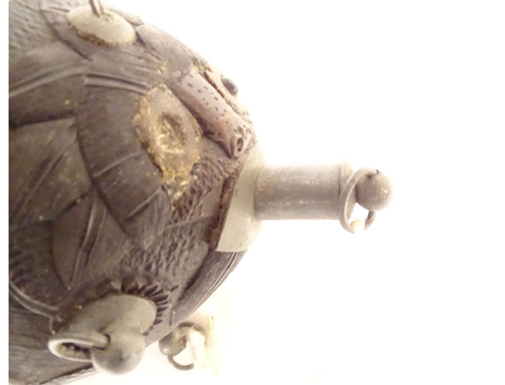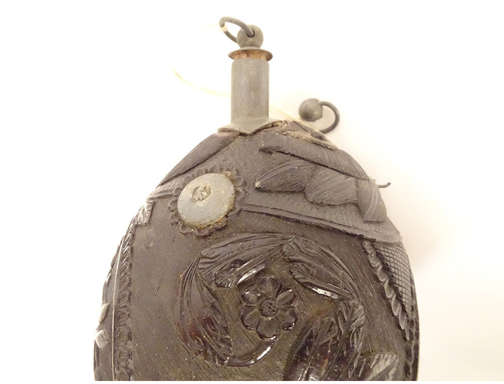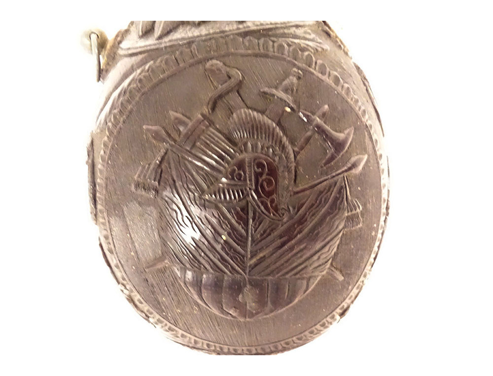 Powder flask, coconut shell, Napoleon profile, war attributes, helmet, 19th century