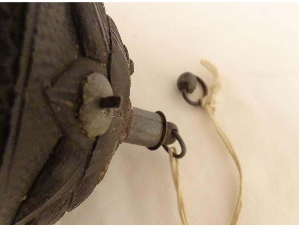 This powder flask is in good overall condition. The tip is shaped like the head of a grotesque figure.