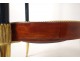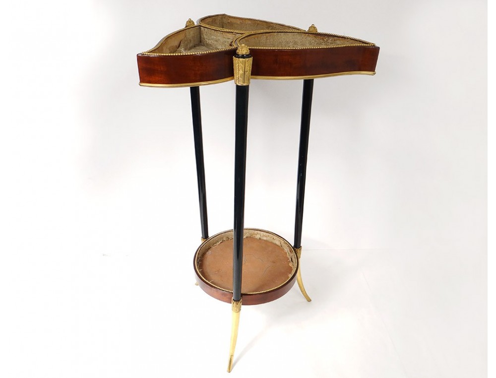 Small so-called knitting table or storage compartment * in mahogany veneer, bowl tray with three compartments in the shape of a mouchette, resting on a tripod base in blackened wood, round crotch shelf, ornaments and beaded friezes in gilded bronze, d ' Napoleon III nineteenth century.