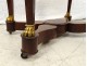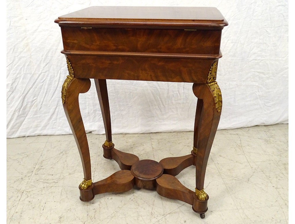 Worker or work table in flamed mahogany and gilt bronze ornamentation, opening with a belt drawer revealing a small leather writing desk; inside small compartments with a candle holder and a needle cushion on each side as well as a mirror, resting on four feet adorned with palmettes, foliage and terminated by claw feet, from the 19th century Restoration period.