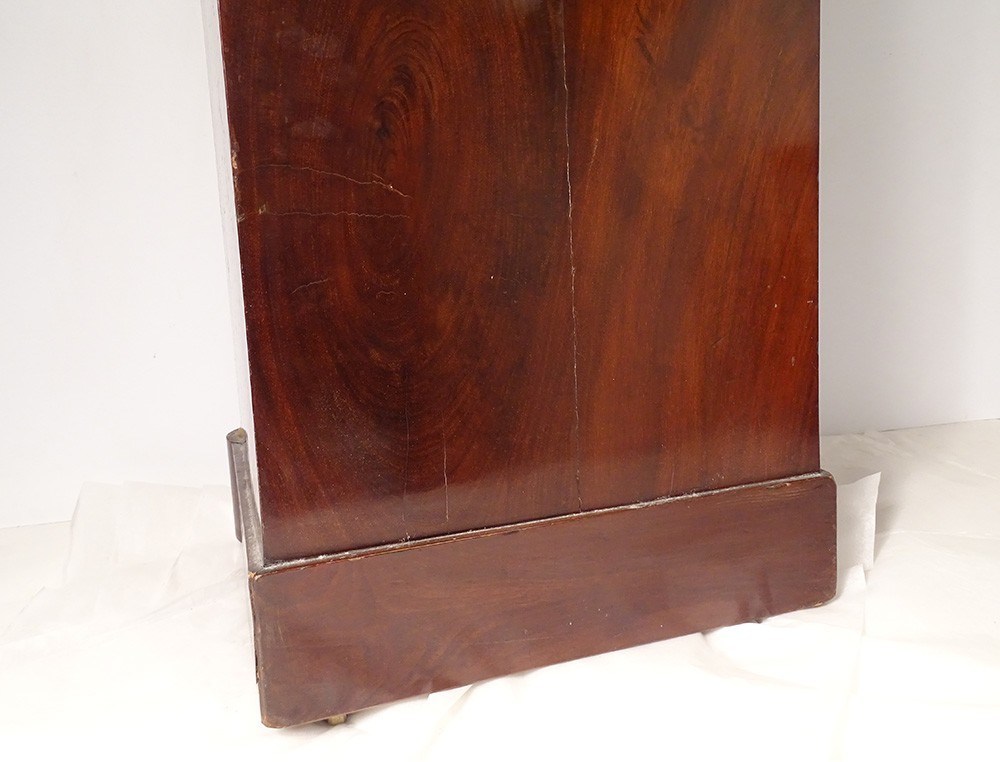 A note: the door is split (restored), accidents and traces of restorations on the veneer, some stains and dirt on the marble top, the right column moves a little at the bottom, wear of time, see photos (see arrows red).
