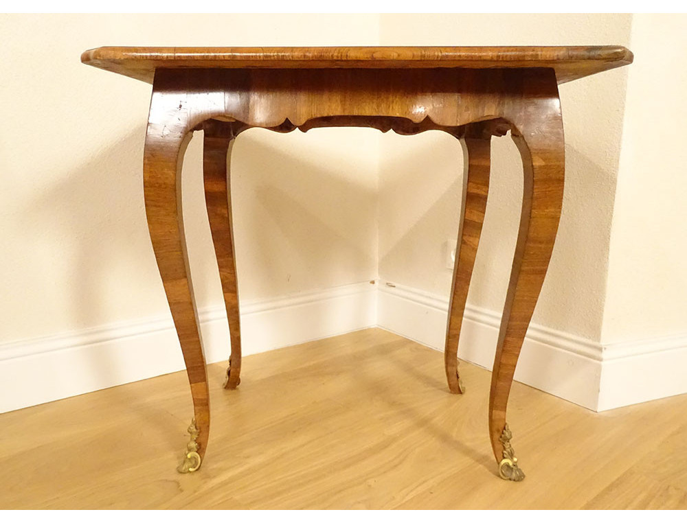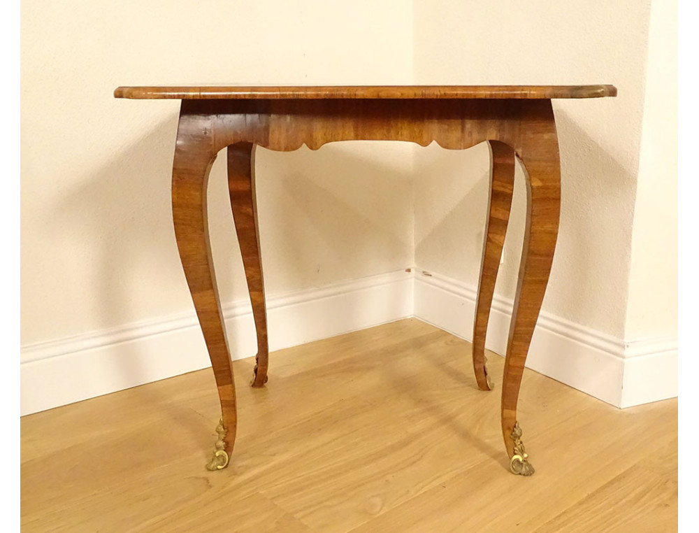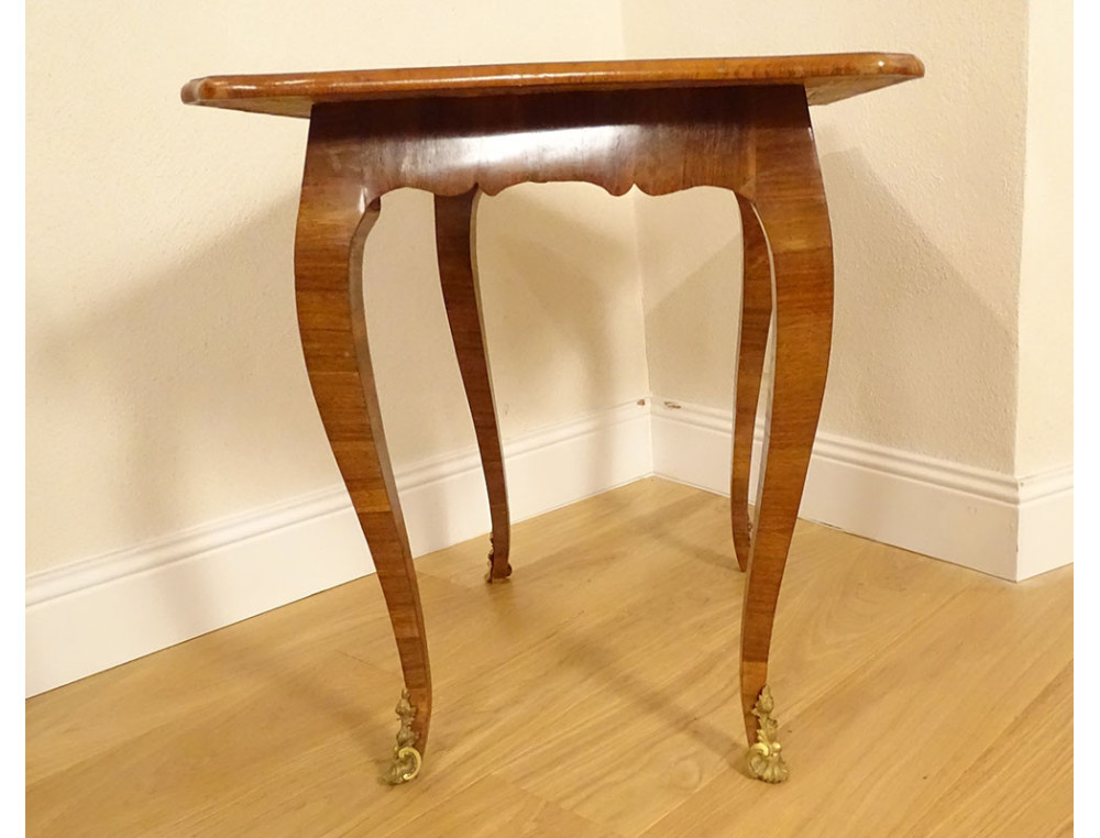 Small Louis XV parlor table in walnut veneer and various wood veneers, decorated in marquetry with frames and small flowers at the corners on the top, resting on four cabriole legs, gilt bronze sabots chased with stylized shells, made in the style of the Hache* cabinetmakers, from the 18th century.