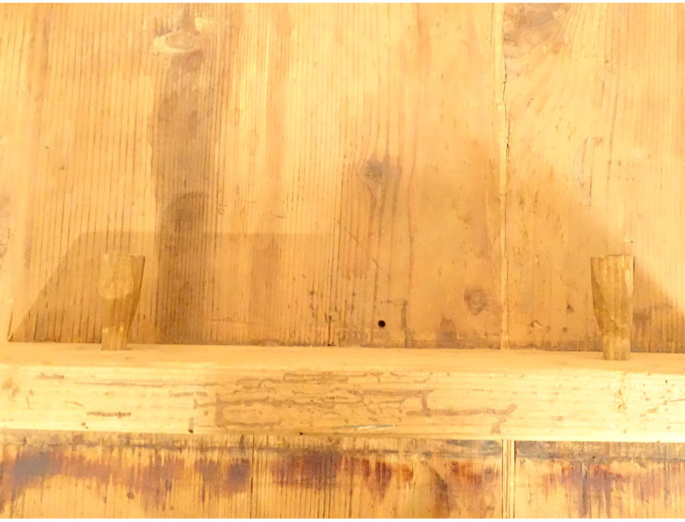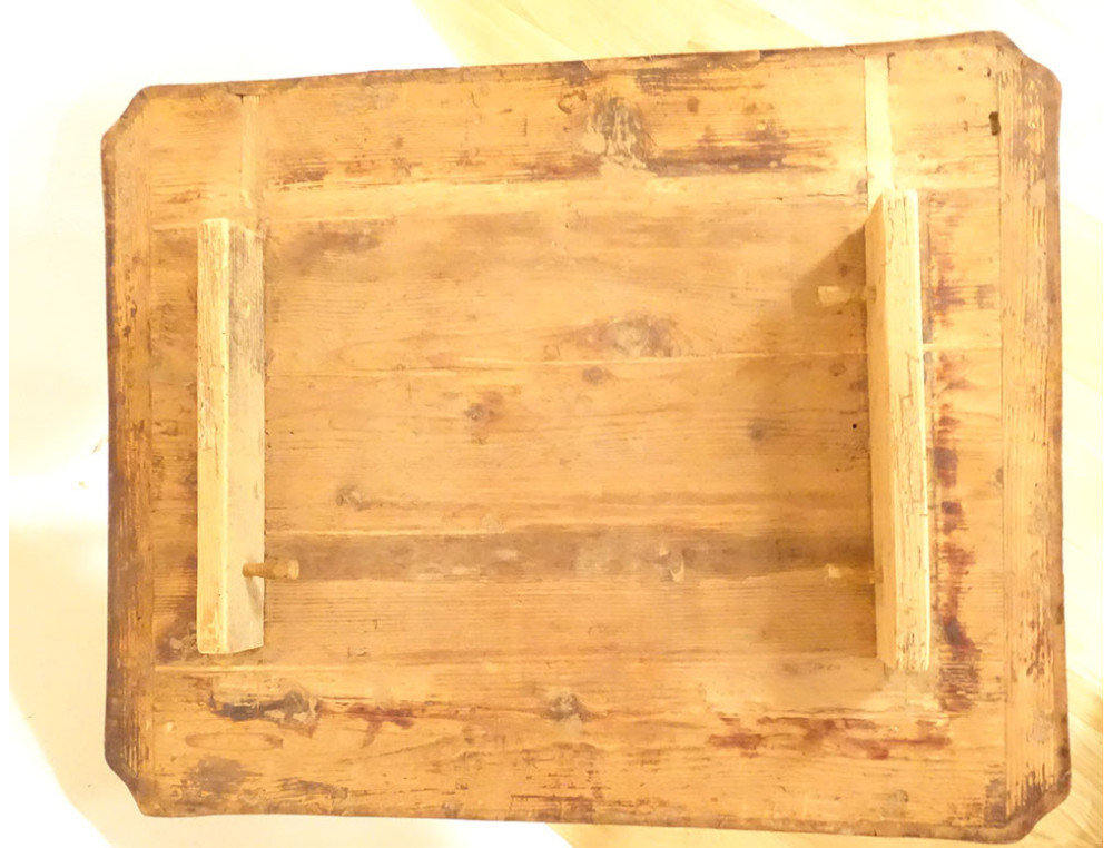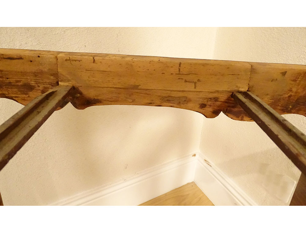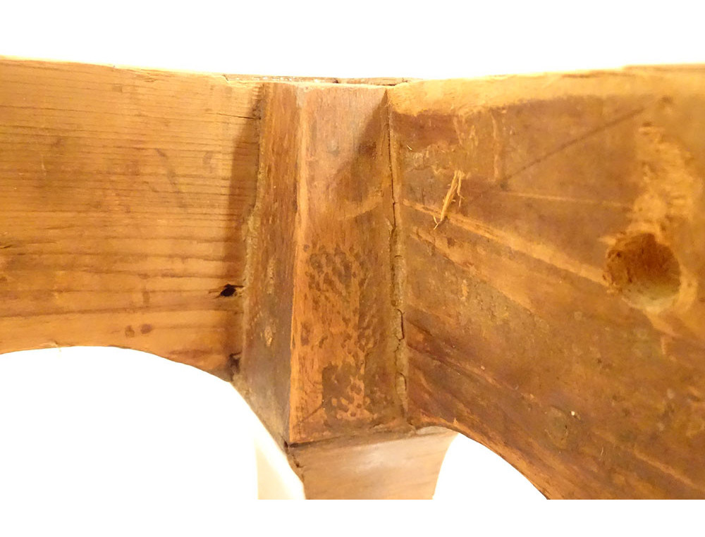 This table is in good overall condition. The tabletop is removable and held in place by large dowels. There are traces of drawer slides and a former drawer that has been removed.