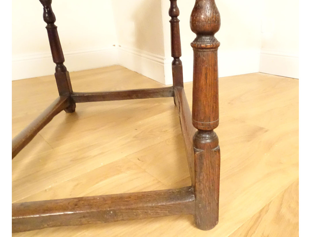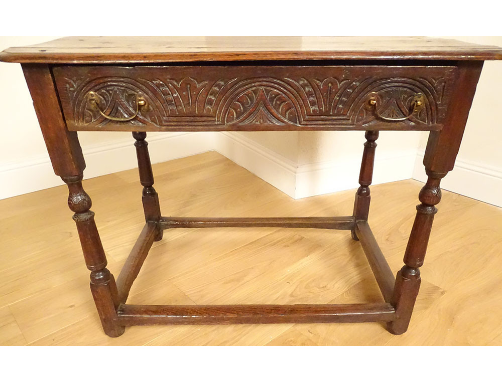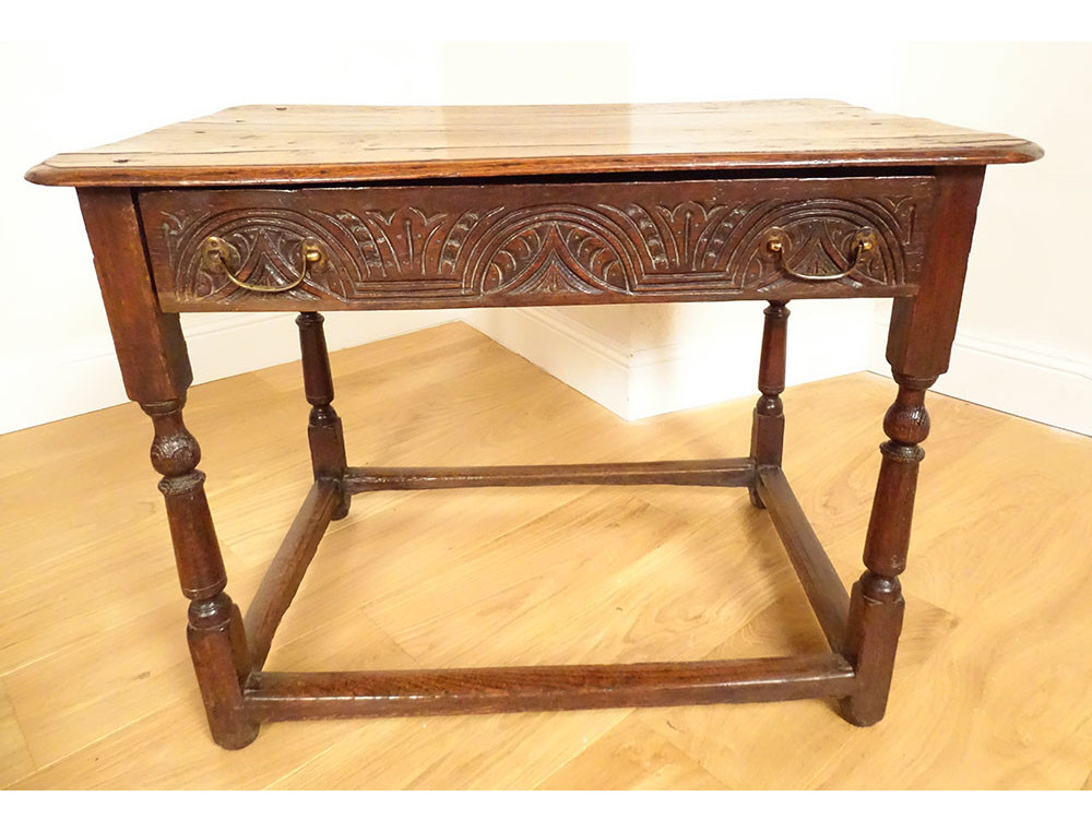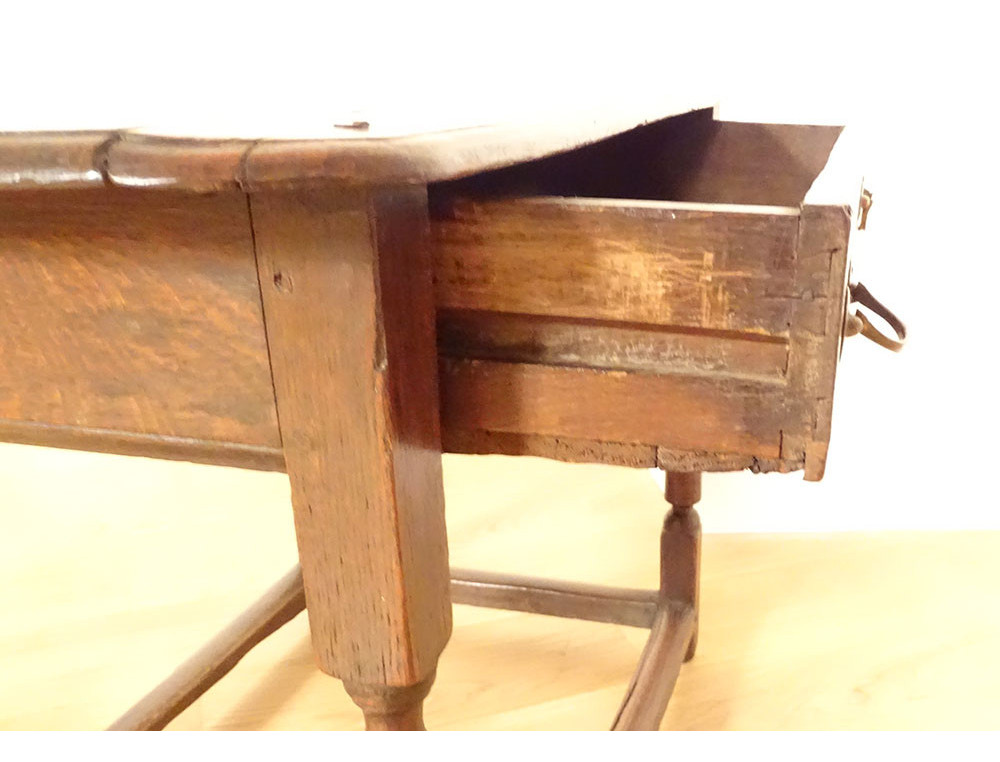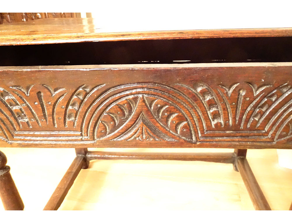 Small Louis XIII carved oak table, opening to a drawer in the front decorated with a stylized plant motif, resting on four turned legs with rectangular crossbars, most certainly of English origin, from the High Period of the 17th century.