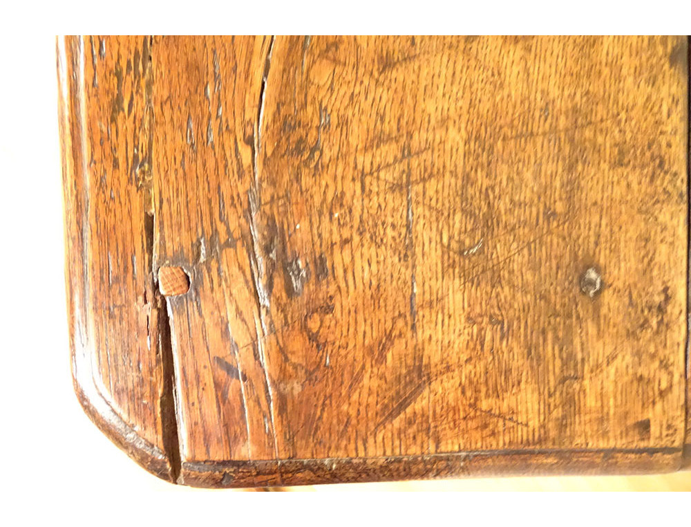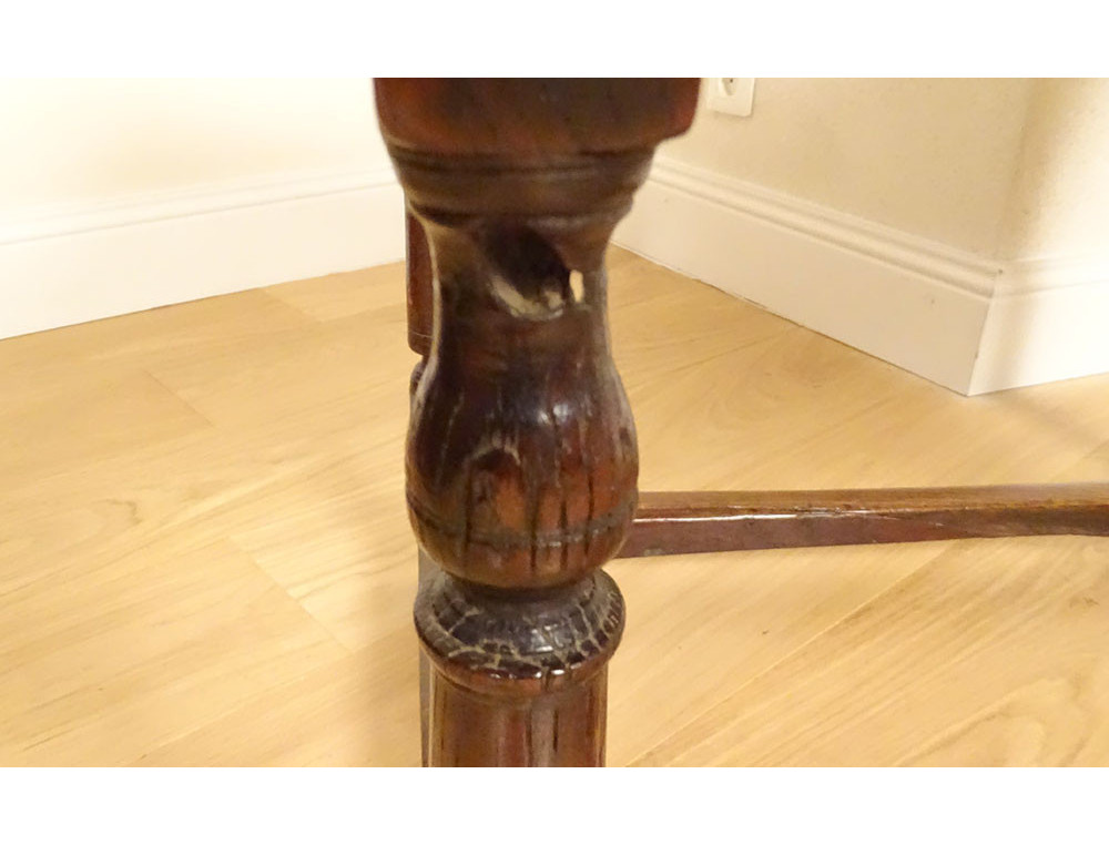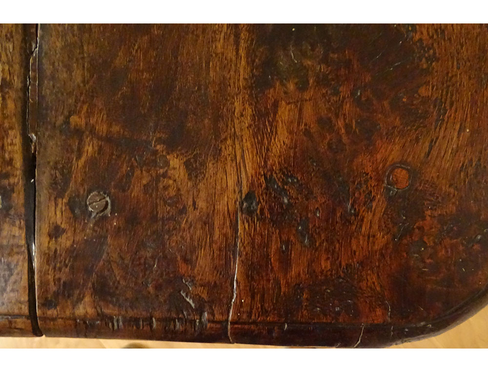 Please note: cracks on the tabletop, some damage and restorations to the wood, wear and tear from age, see photos.