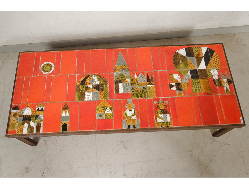 Superb rectangular coffee table signed by Roger Capron *, ceramic and metal, decorated with oriental characters, monuments and two birds near a tree, vintage twentieth century.