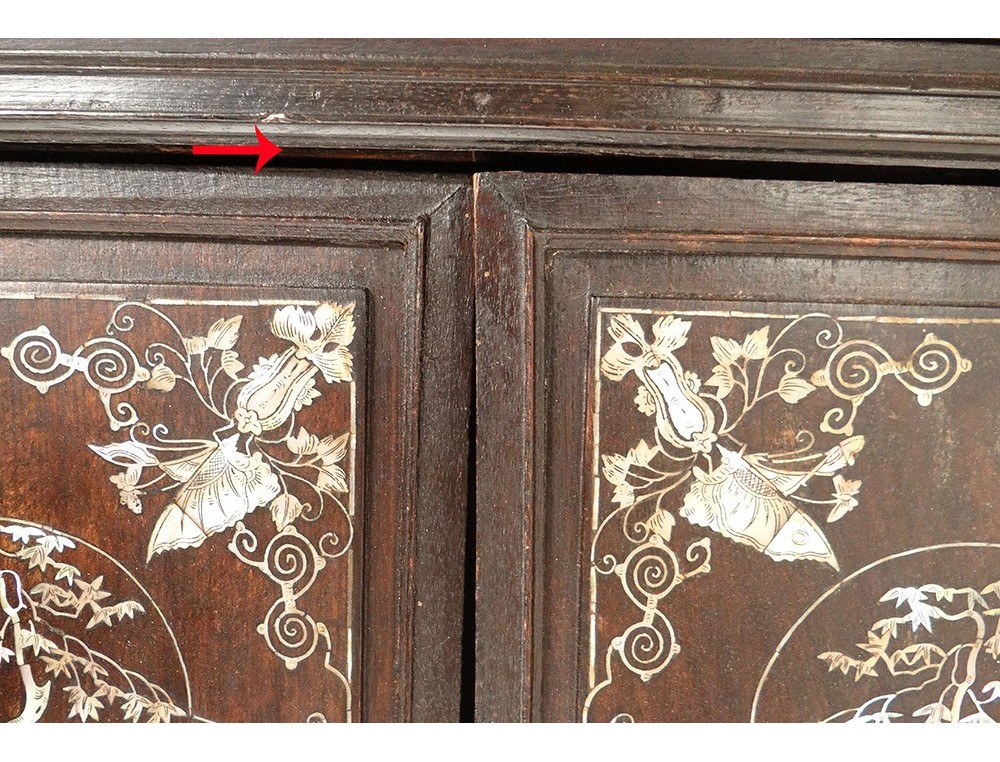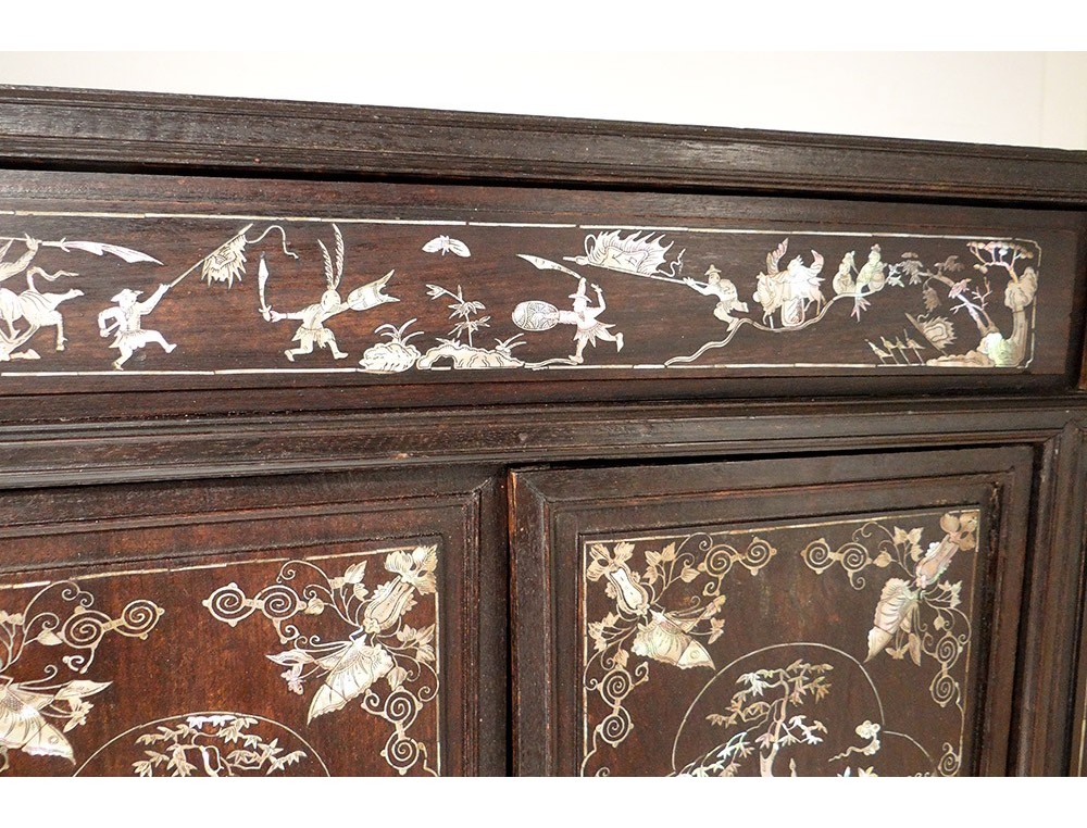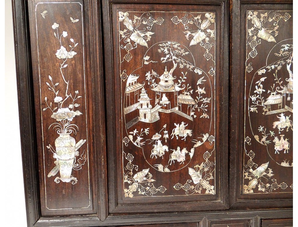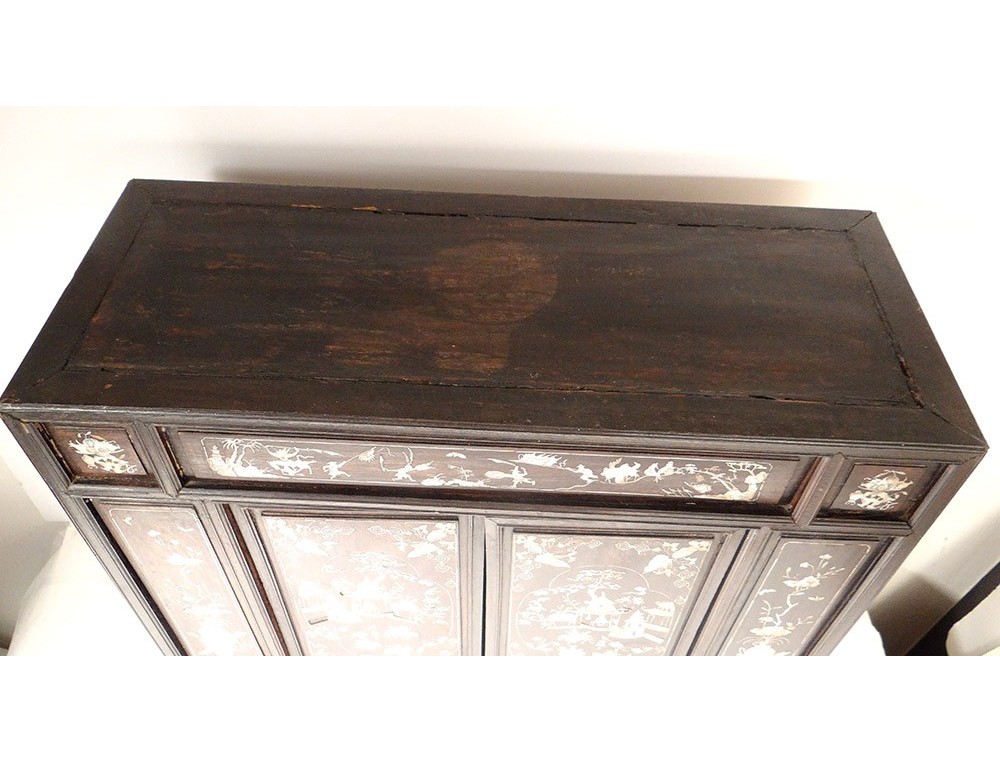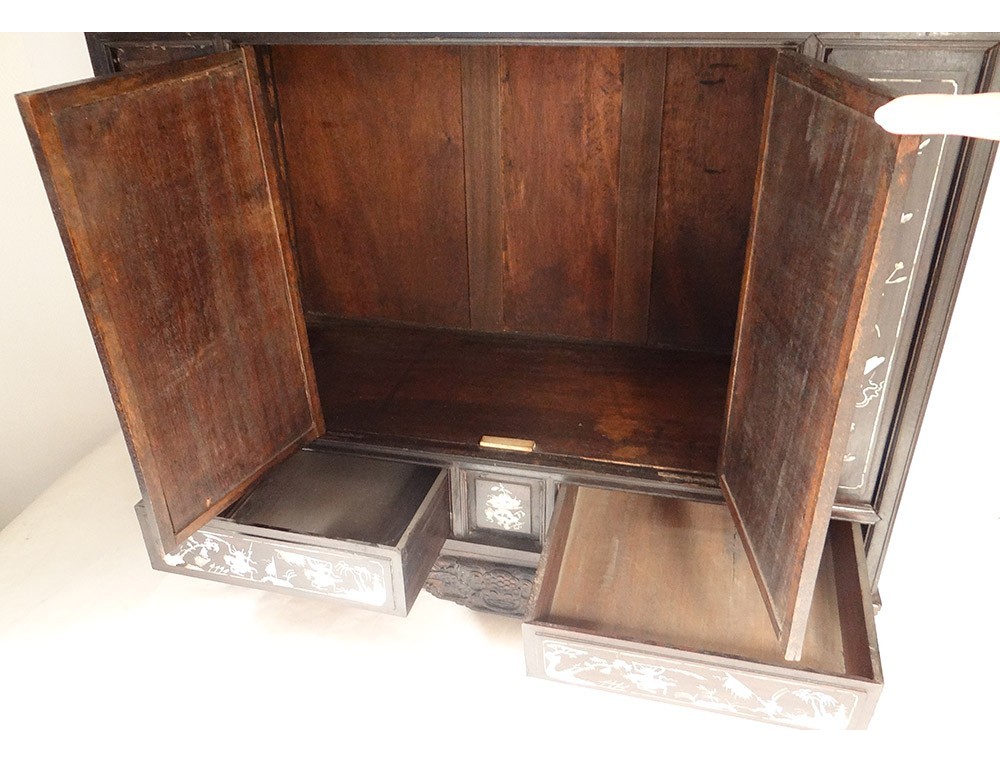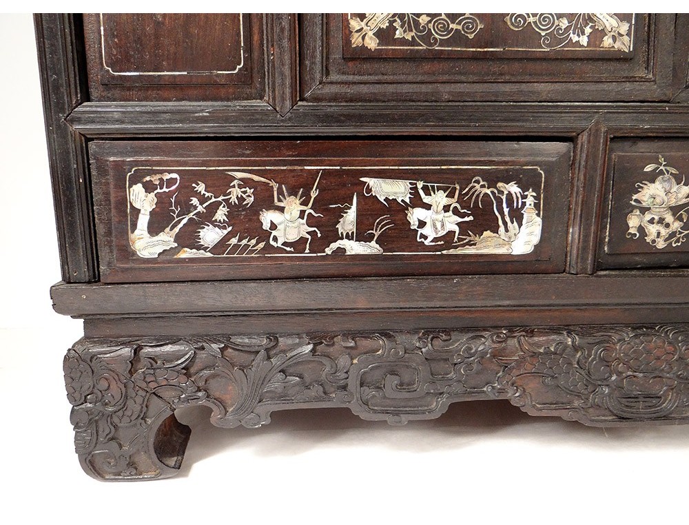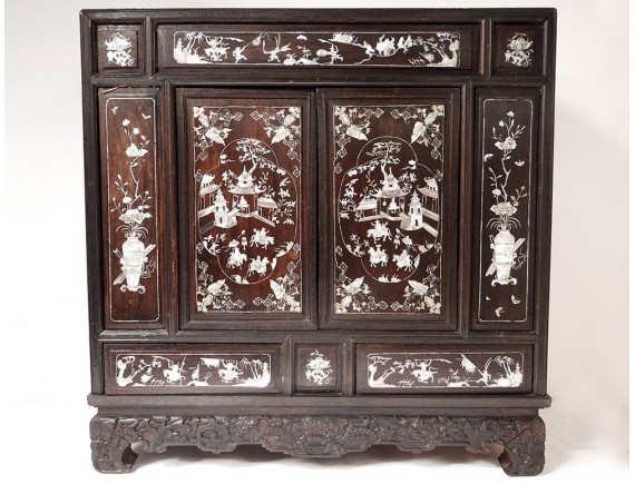 Small furniture or carved wooden cabinet and mother-of-pearl inlays, opening with two leaves in the middle and 2 drawers in the bottom, decorated with animated scenes of riders and characters in pagodas, as well as butterflies, flower vases in vegetal motifs, dragon stylized below, Indochinese or Vietnamese work, XIXth century.