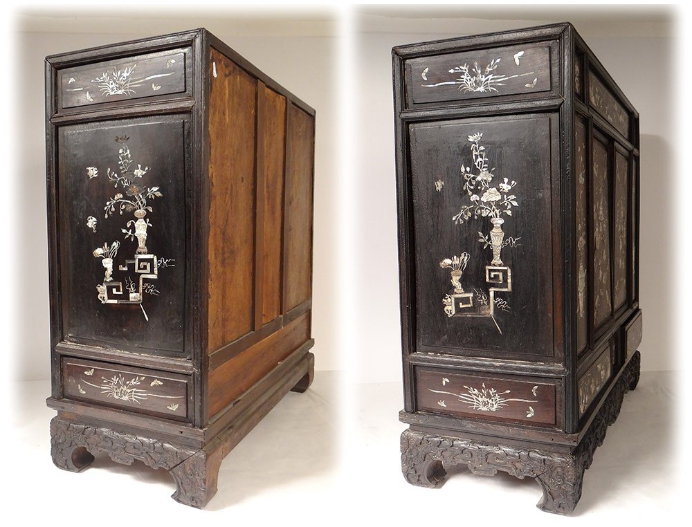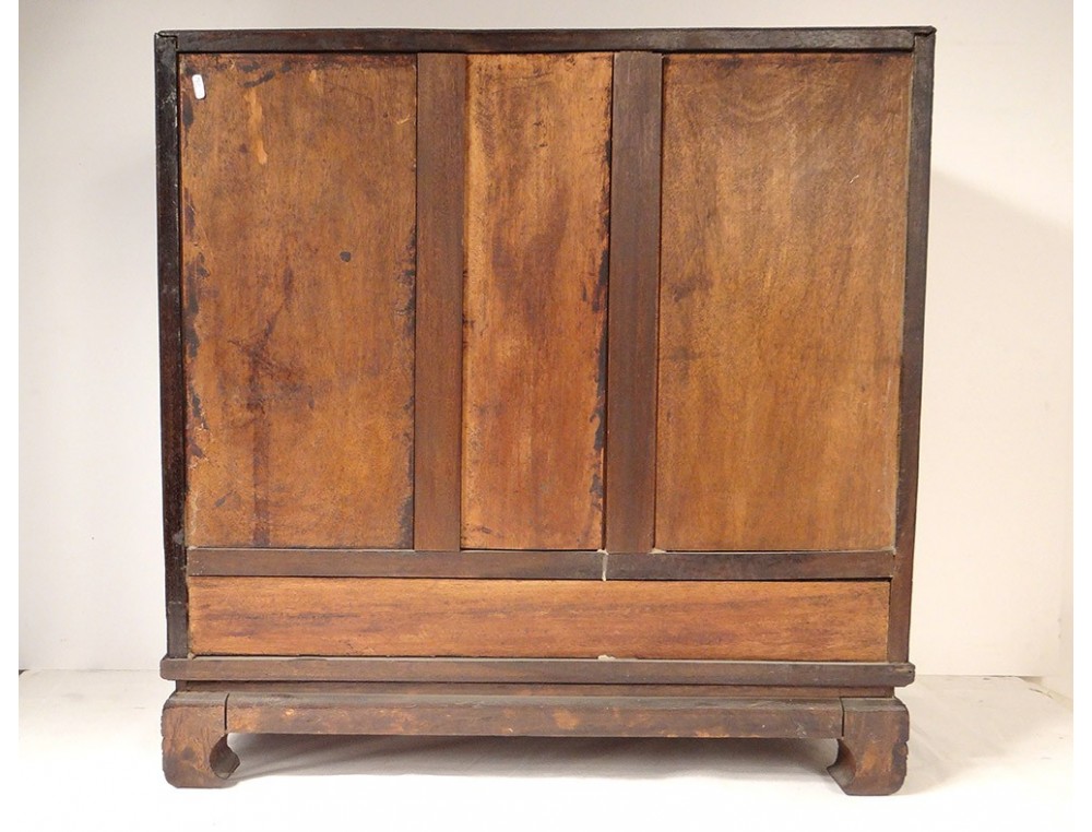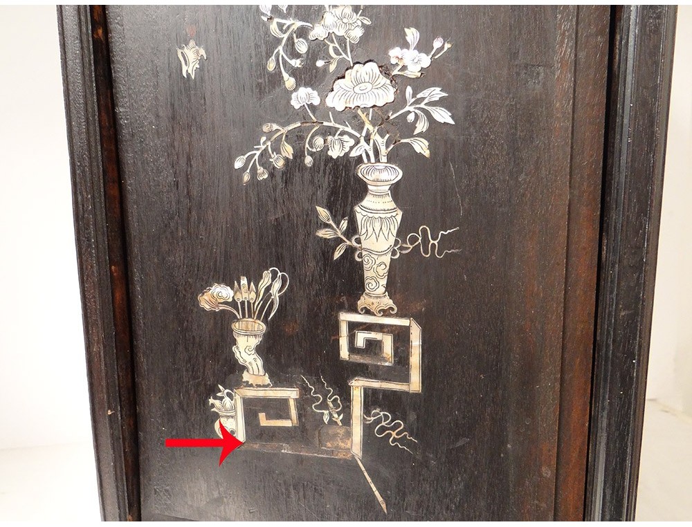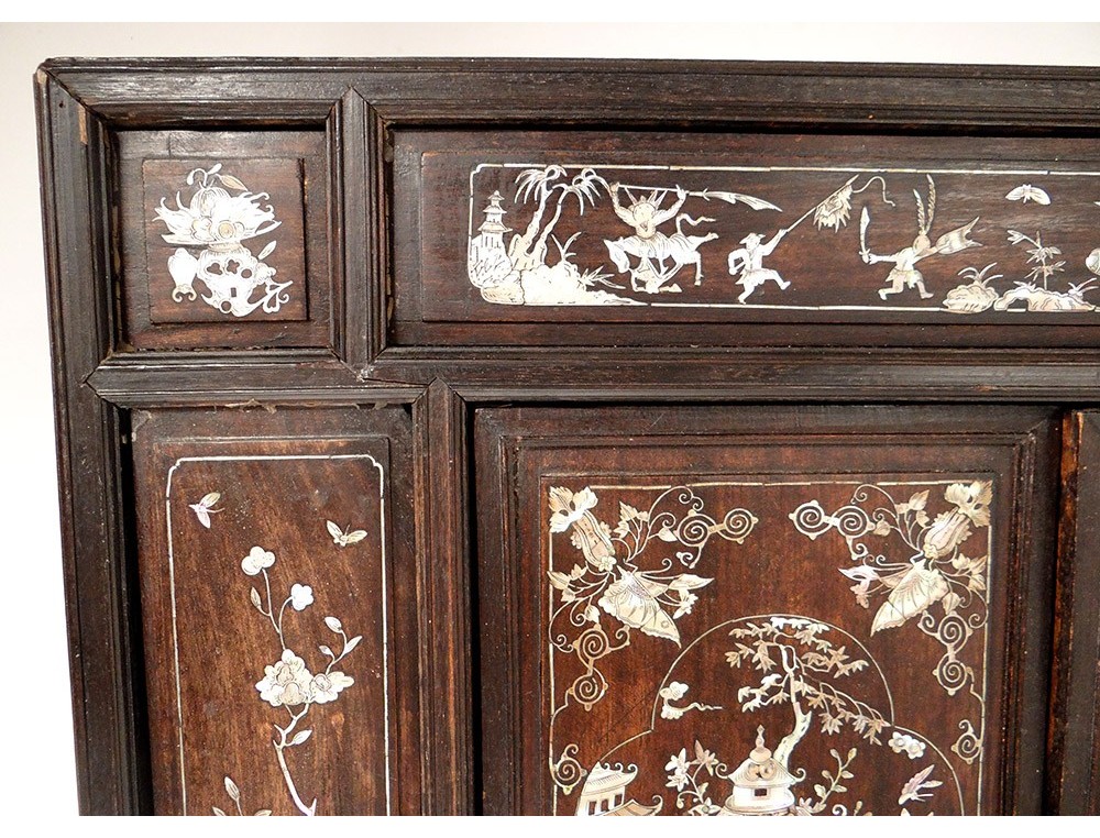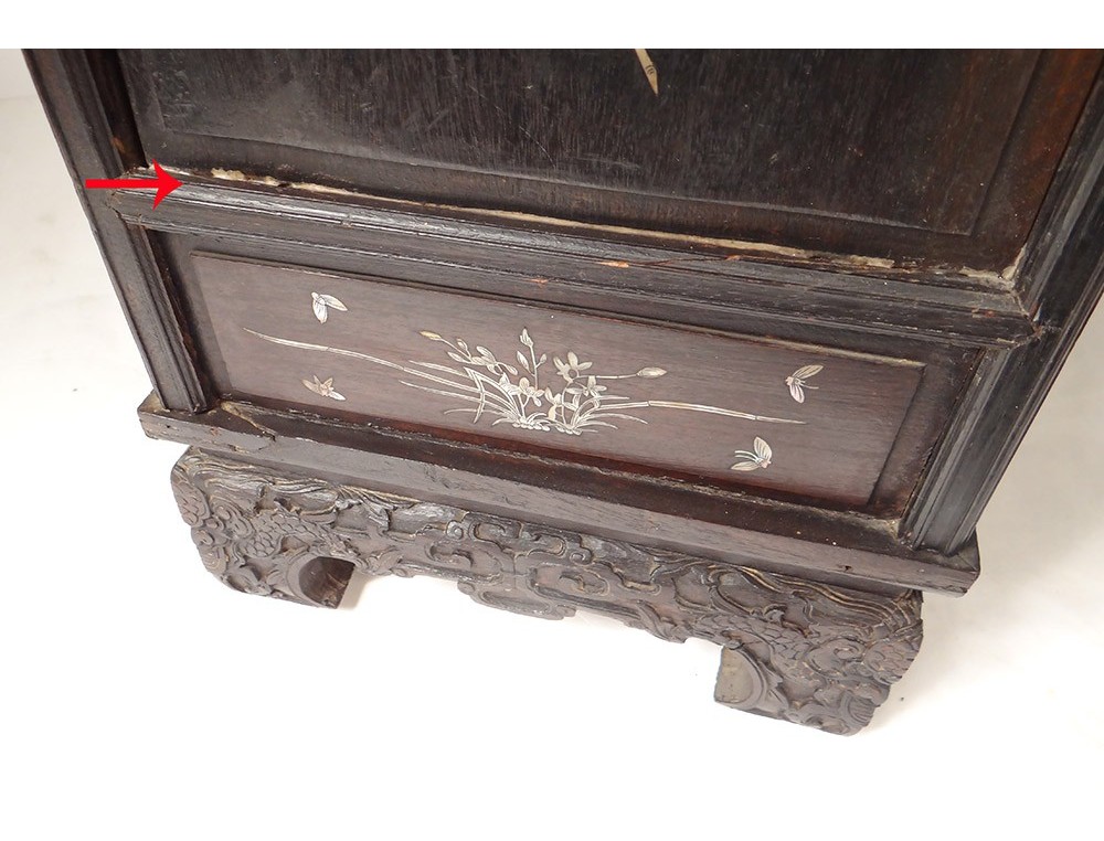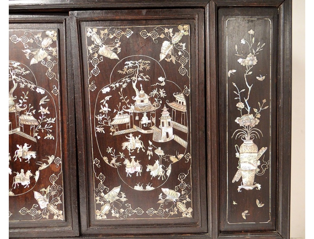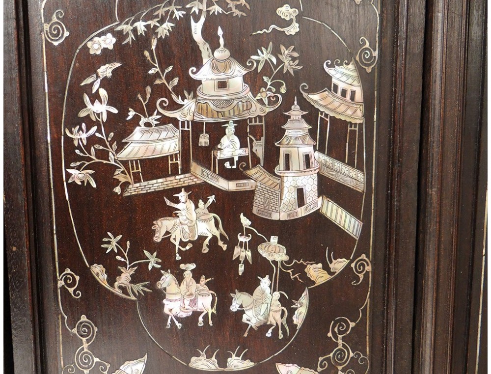 Small furniture cabinet wood mother of pearl characters pagodas Vietnam Indochina nineteenth