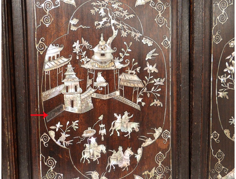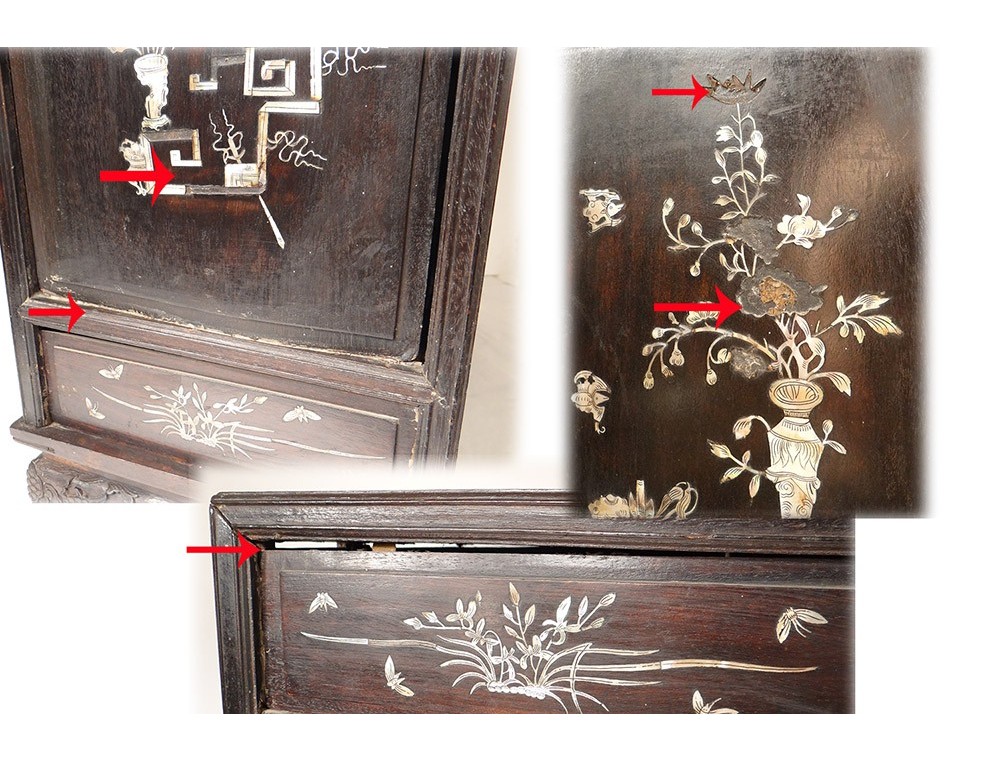 A note: the front doors are quite straight, traces of repairs (glue) in some places at the panels, slits and stain on the upper plate, some lack of mother of pearl on the sets, wear of time, well watch the photos (see red arrows).