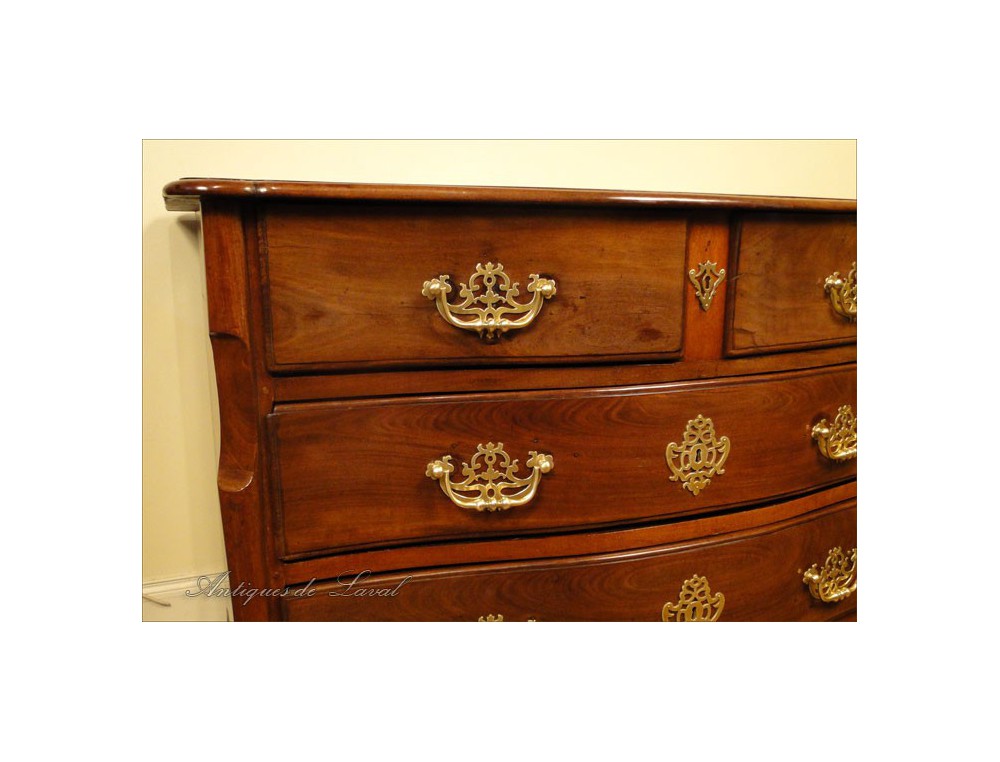 It has soberly structured lines, that is to say a slightly curved front and three rows of drawers, the sides, however, remain flat. The absence of carvings and moldings highlights the beauty of mahogany. This chest of drawers is never covered with a marble top, but with a mahogany top with a largely overhanging frame. The bronze fittings contribute to the elegance of the lines.