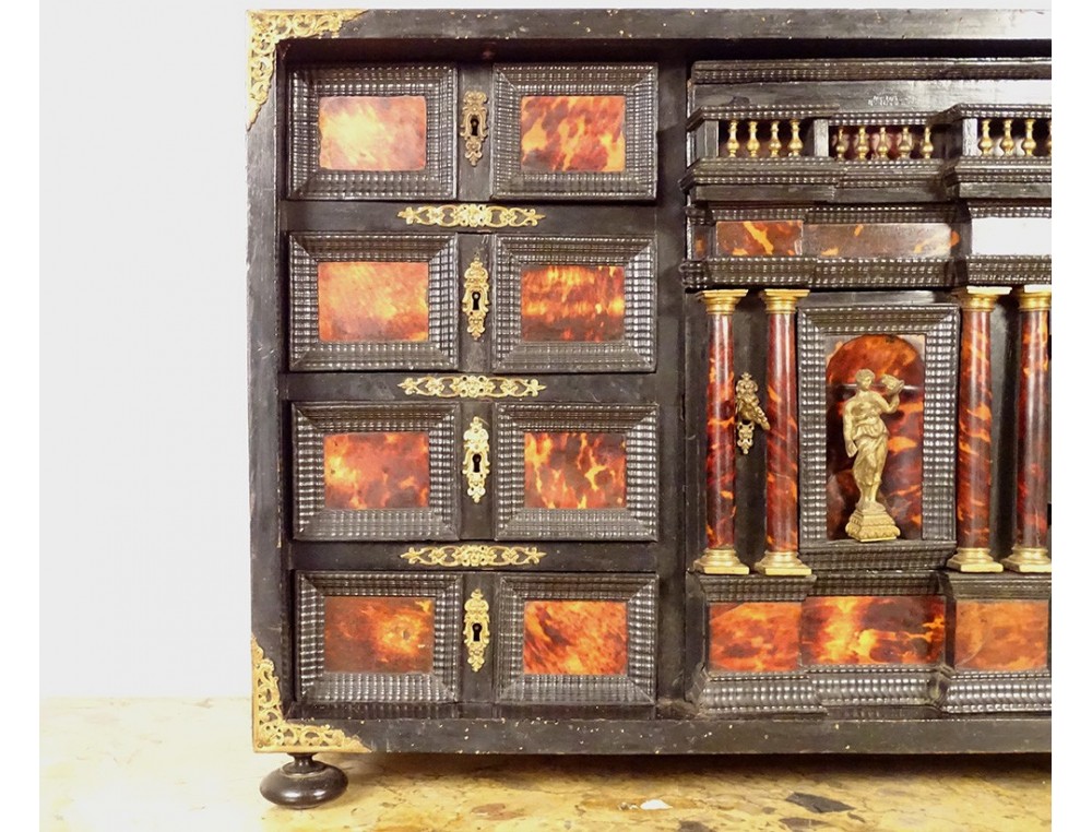 Rare Italian cabinet in architectural style, in blackened wood and marbled tortoiseshell reserves, opening with 10 drawers framing a door with 4 columns decorated with a gilded bronze statuette representing a vestal woman and revealing two small drawers, with secret drawers inside, origin Italy (Naples?), from the late 17th-early 18th centuries.