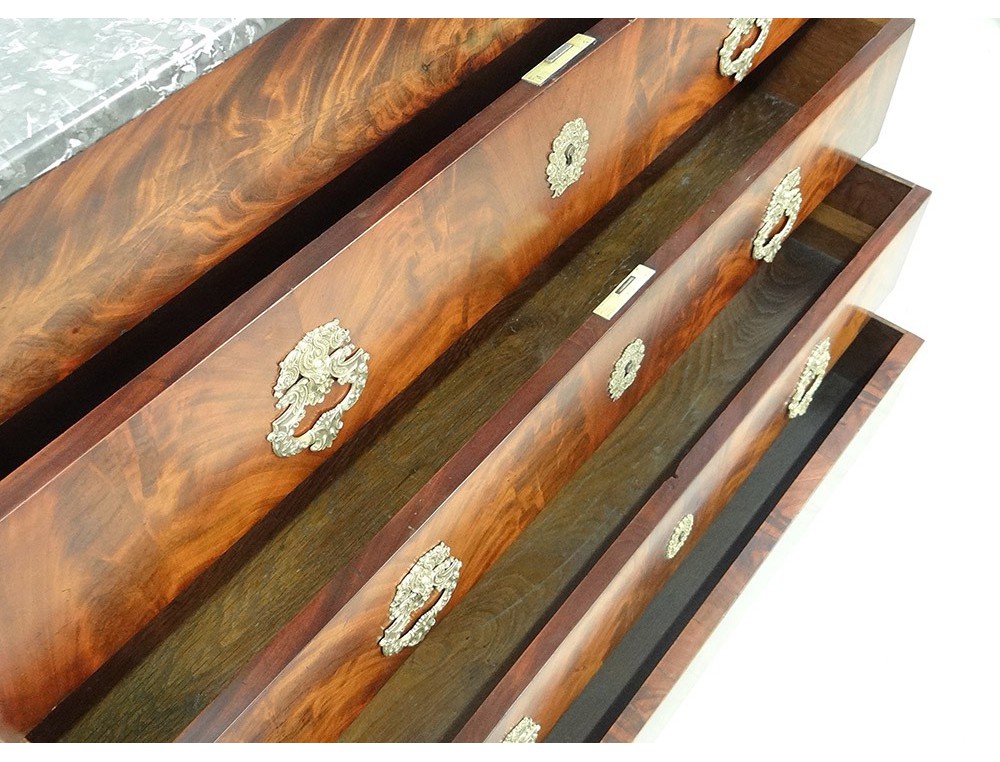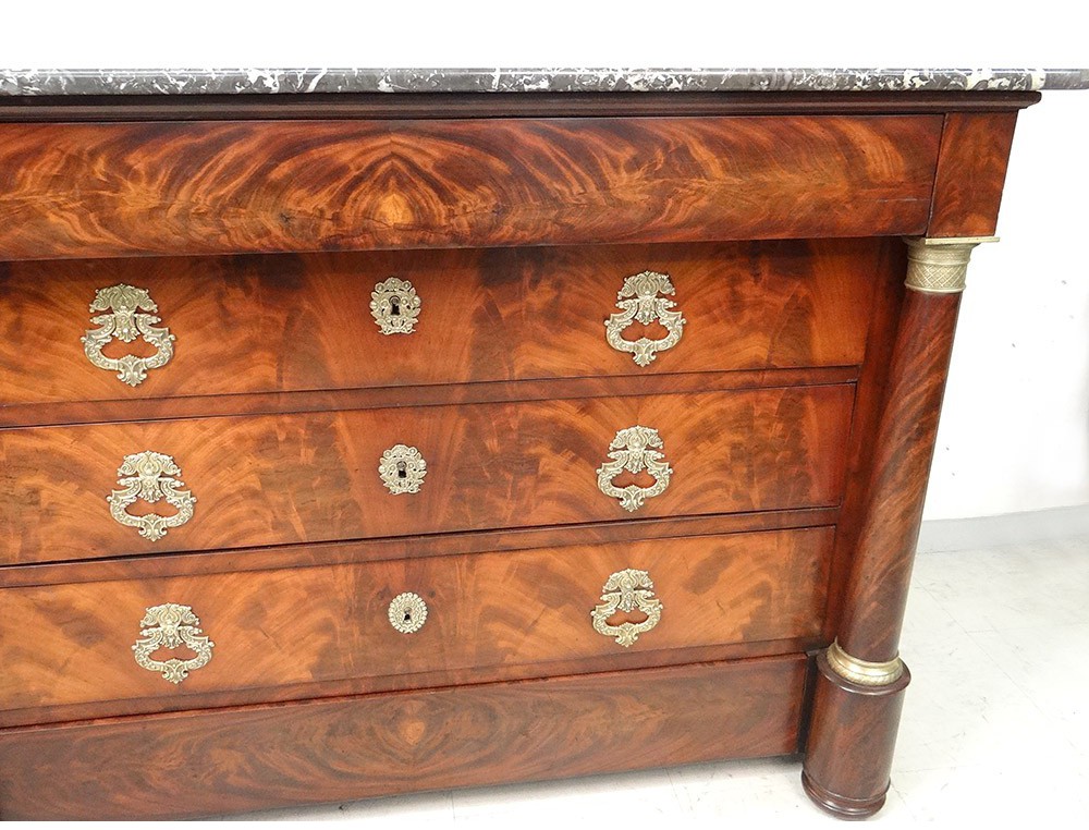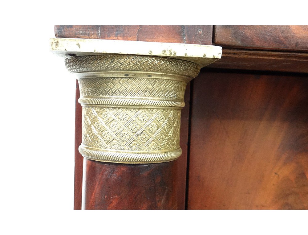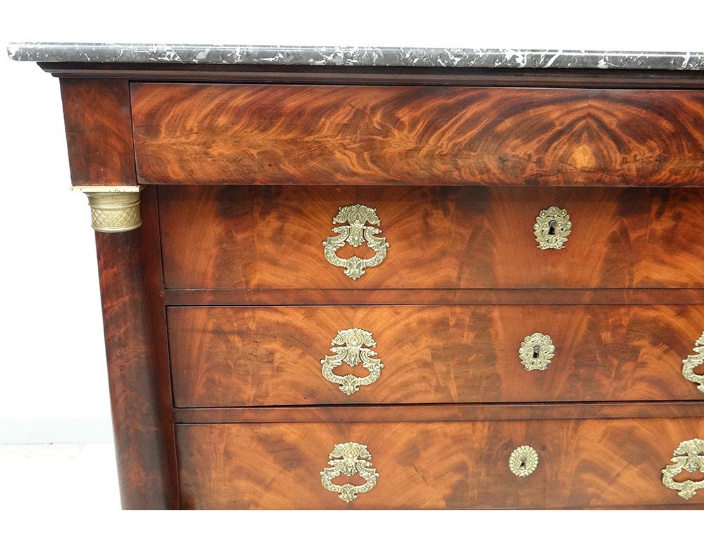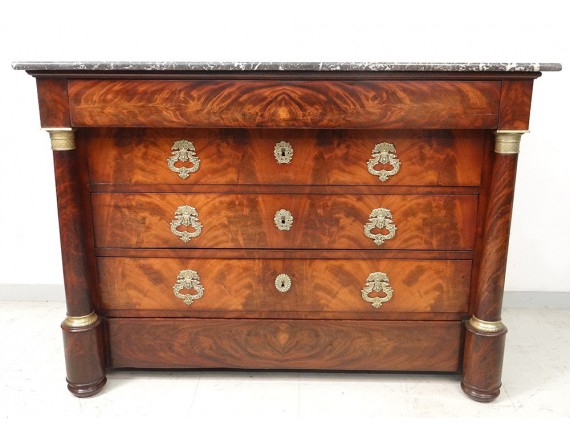 Mahogany veneer flamed Cuba convenient to spare half-columns, opening with five rows of drawers (one-hook belt), ornamentation finely chiseled gilt bronze, gray marble top, First Empire period early nineteenth century .