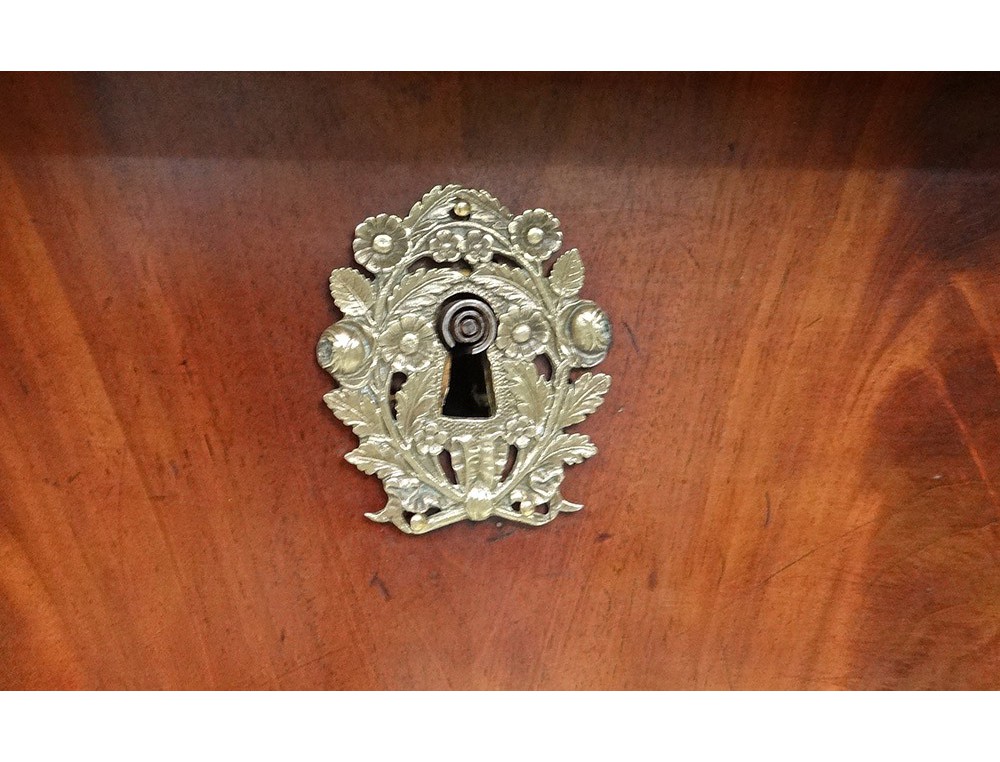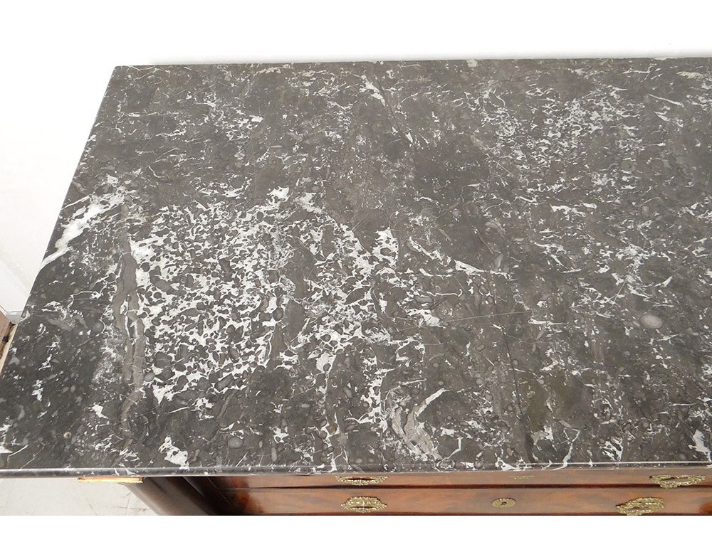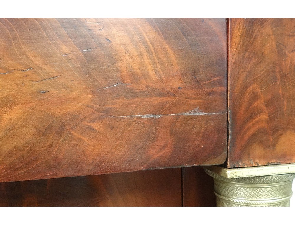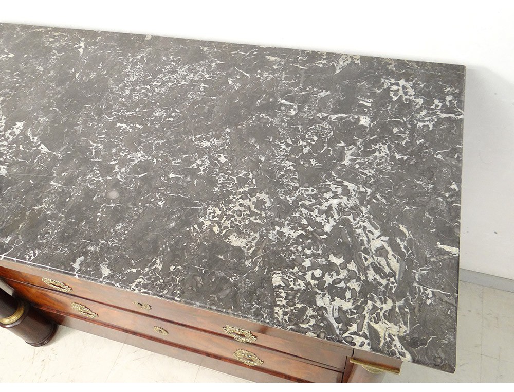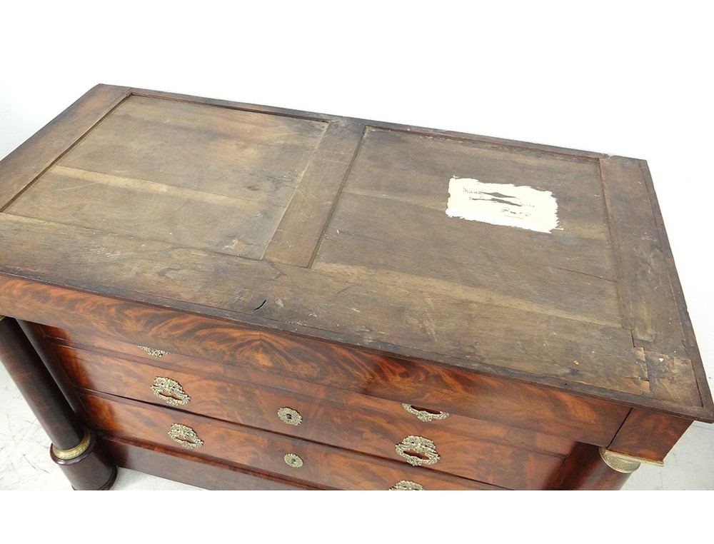Mahogany veneer flamed Cuba convenient to spare half-columns, opening with five rows of drawers (one-hook belt), ornamentation finely chiseled gilt bronze, gray marble top, First Empire period early nineteenth century .