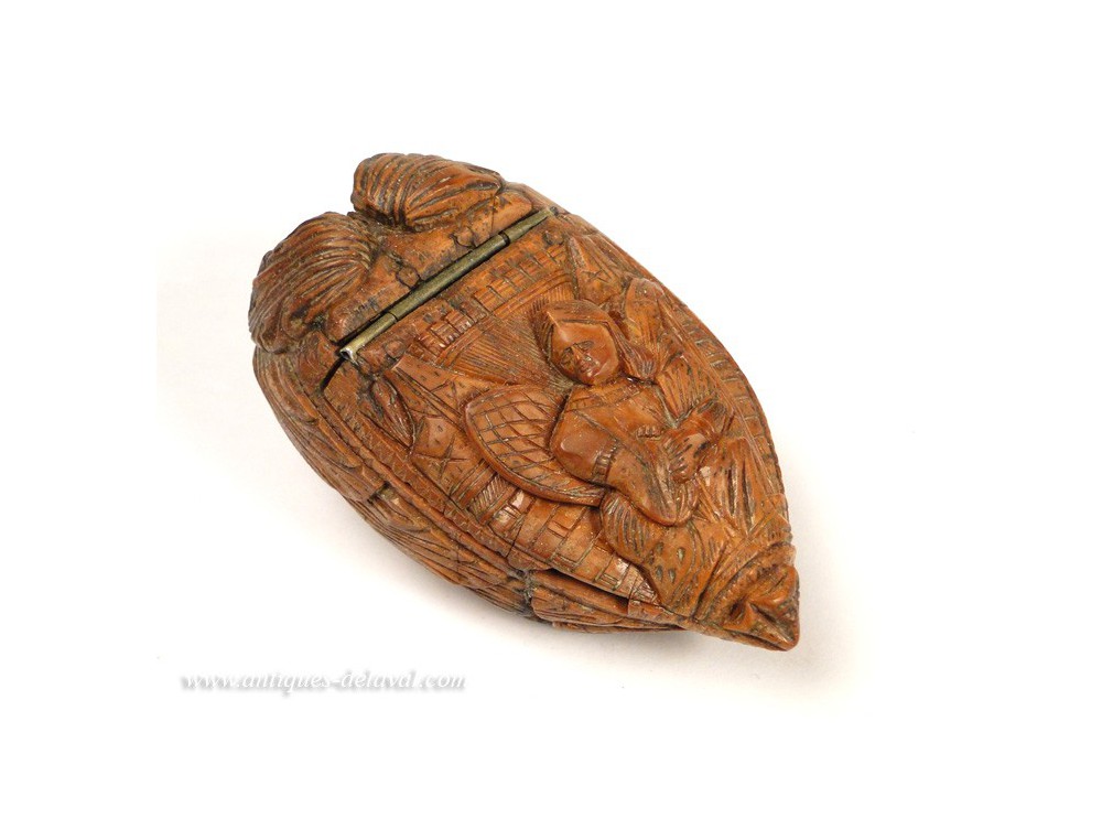 Snuffbox finely carved tagua, slipper-shaped, decorated with a woman playing the harp, marine work or convict * of XIXth century.