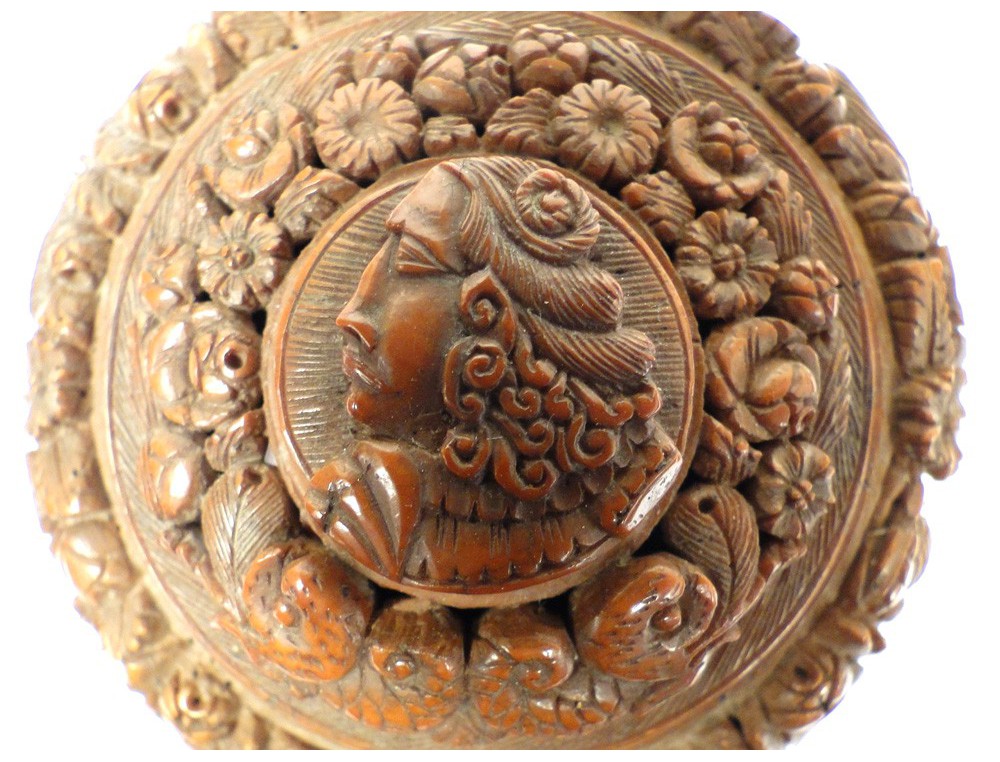 Round box corozo finely carved, decorated with a profile portrait of character on the cover, certainly a king, and rich garlands, working sailor or convict * of XIXth century.