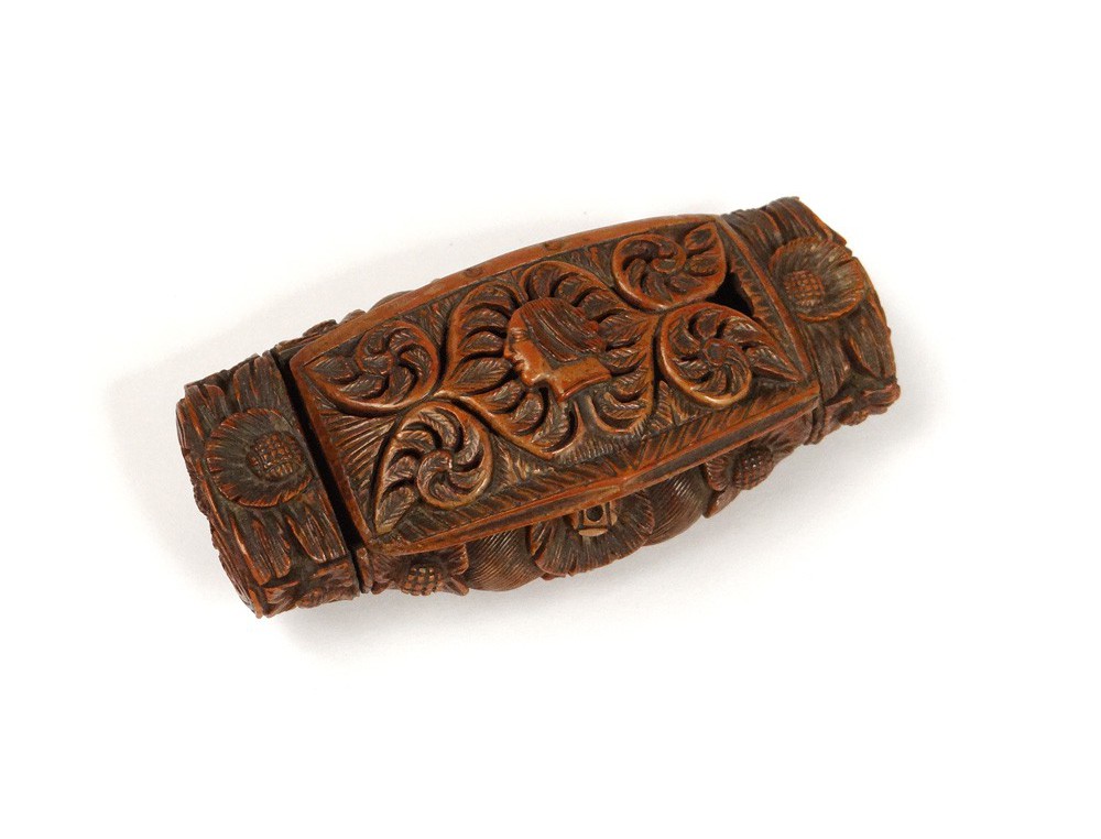 Very nice tagua snuff finely carved, decorated with portraits of the profile as well as flowers and foliage, work sailor or convict * of XIXth century.