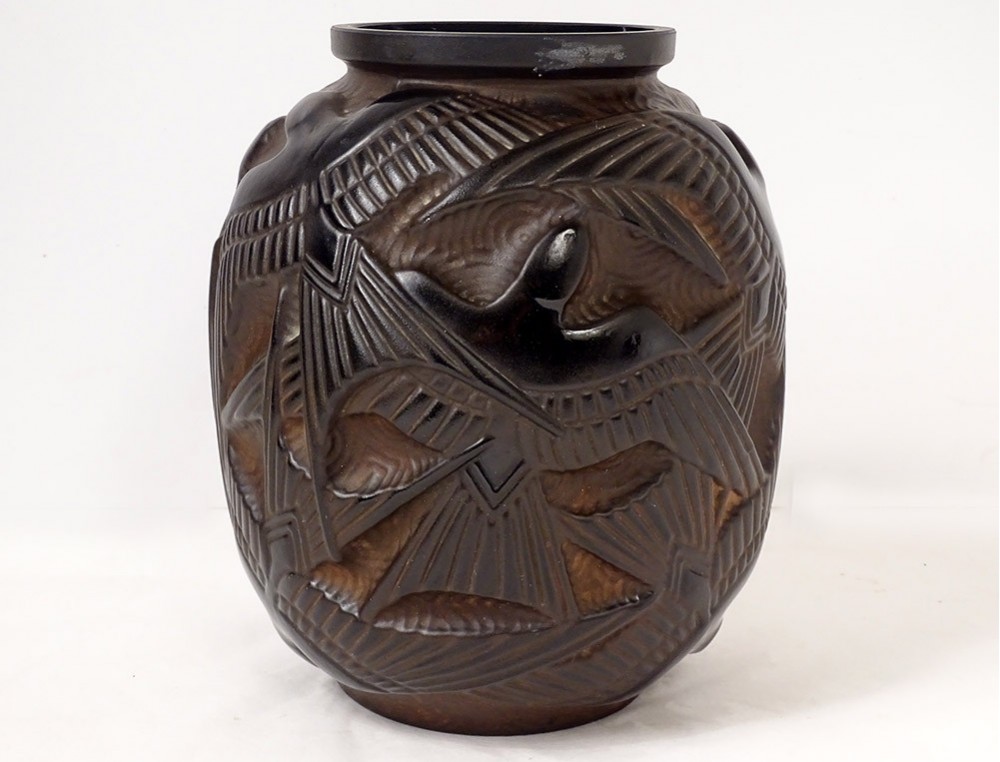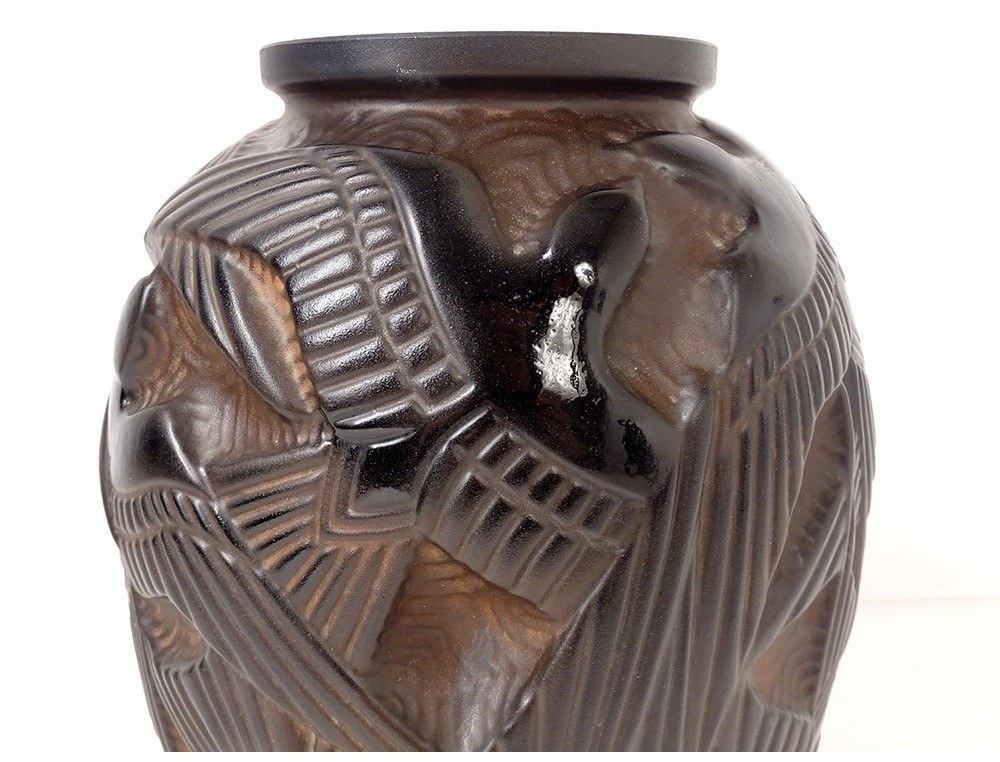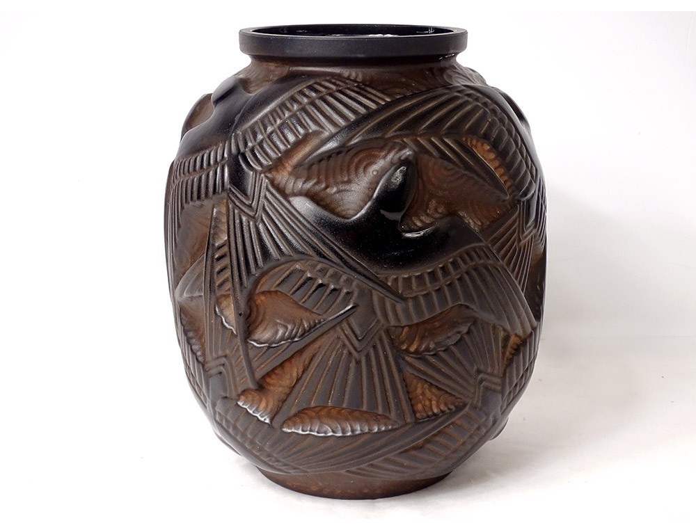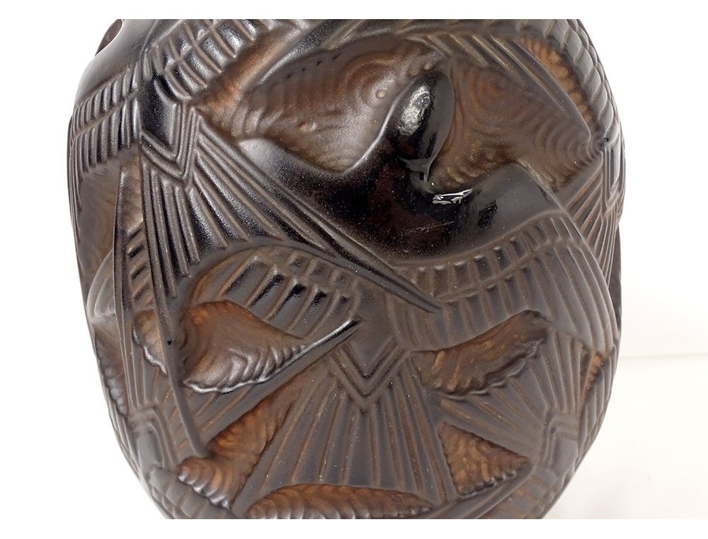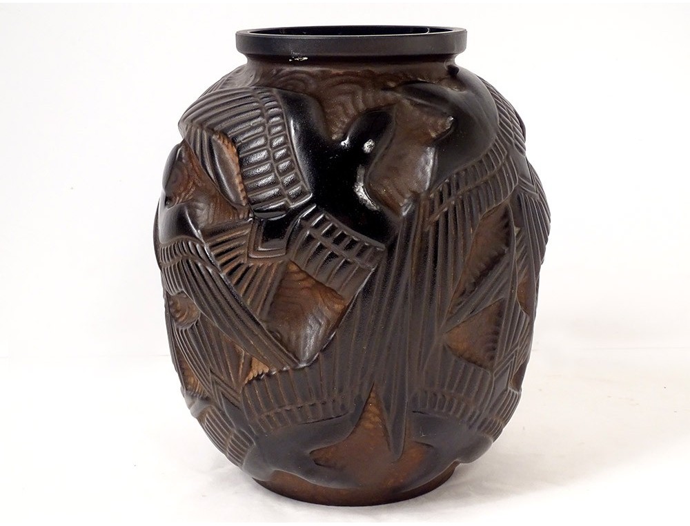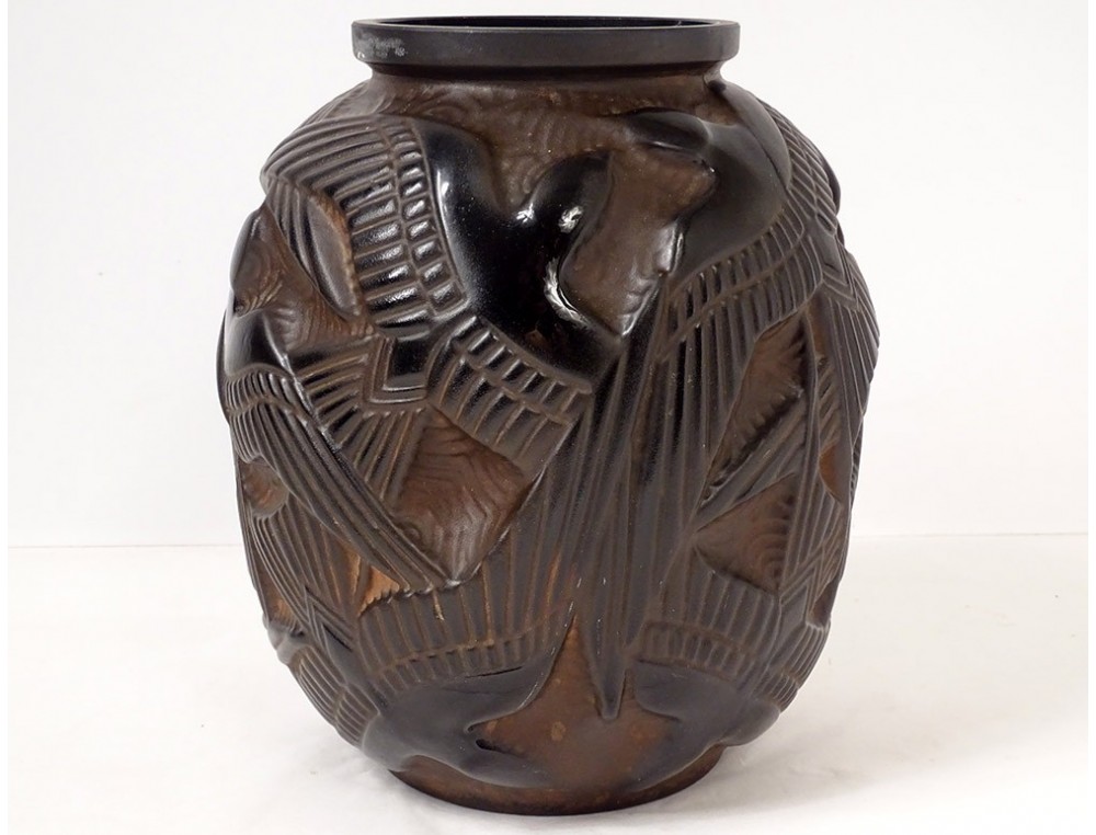 Large Pierre d'Avesn * vase in black pressed glass with brown patina, Hirondelles model, Art Deco period, 20th century.