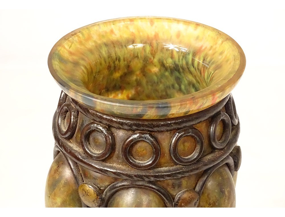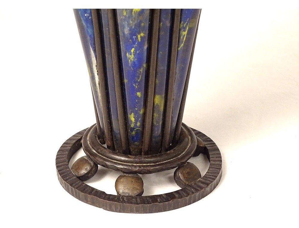 Blown glass vase forming a gadrooned baluster urn hot included in a wrought iron frame, signed A. Delatte * Nancy, Art Deco period early twentieth century.