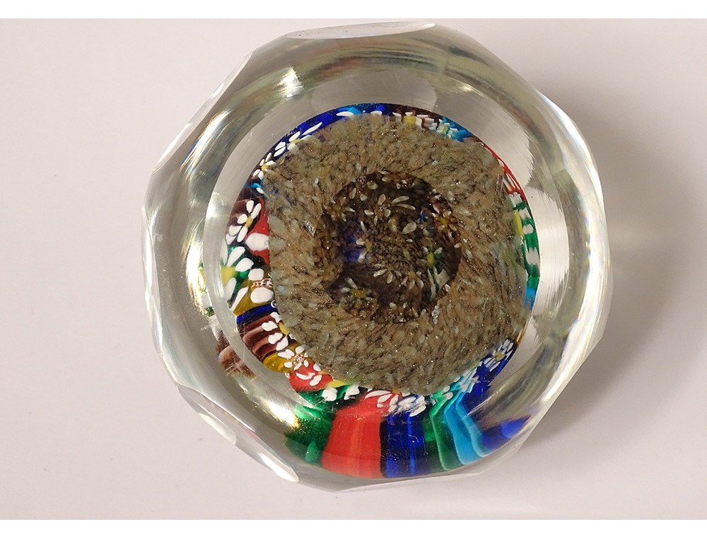 Sulfide or paperweight in cut crystal (perhaps Clichy or Baccarat?), with millefiori decoration of colored flowers, from the early 20th century.
