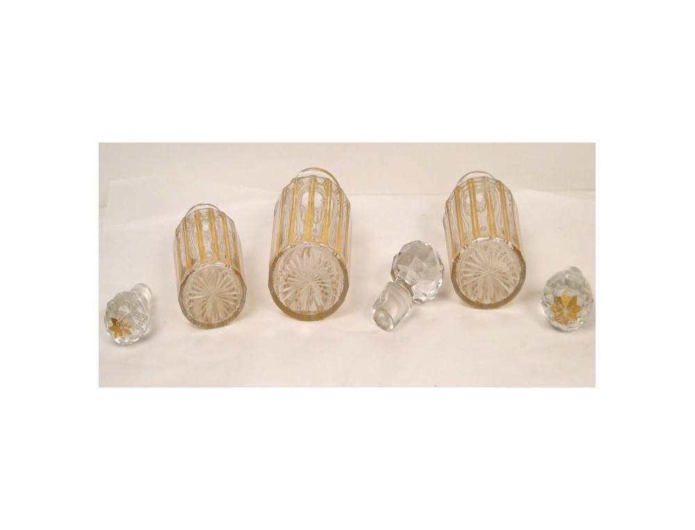 This kit is in good condition. Elements are not signed. A report: the gilding is slightly worn (some gaps in places), burst on the neck and the stopper of a decanter (the largest), use scratches, see photos.