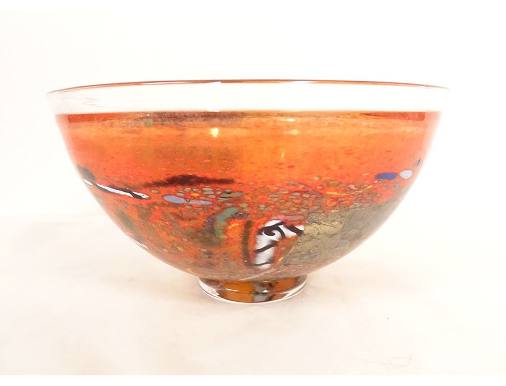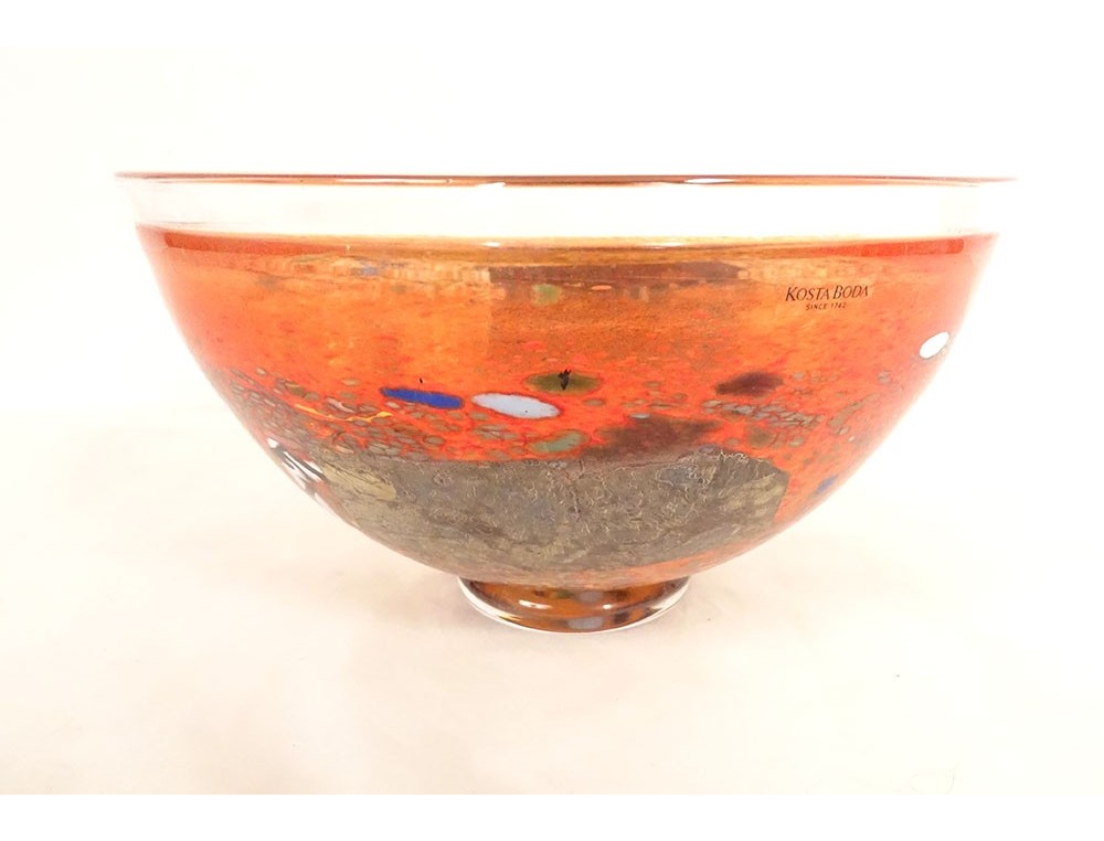 Blown glass bowl on pedestal with inclusions on an orange background, "Satellite" model by Bertil Vallien* for Kosta Boda** (Denmark), from the 1980s/20th century.