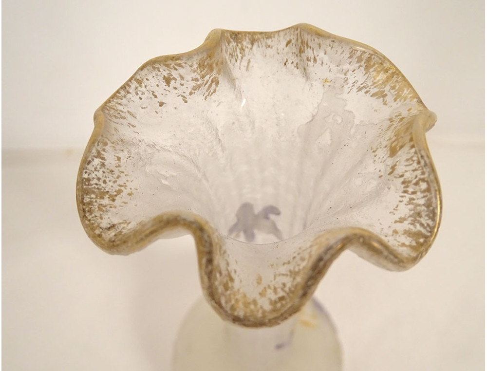 Legras Montjoye frosted enamelled glass soliflore vase with violets, Art Nouveau, 19th century