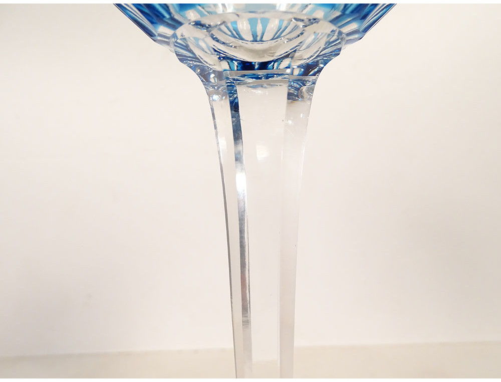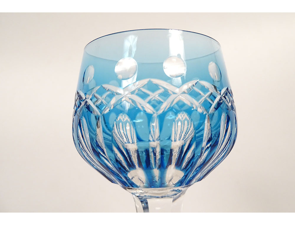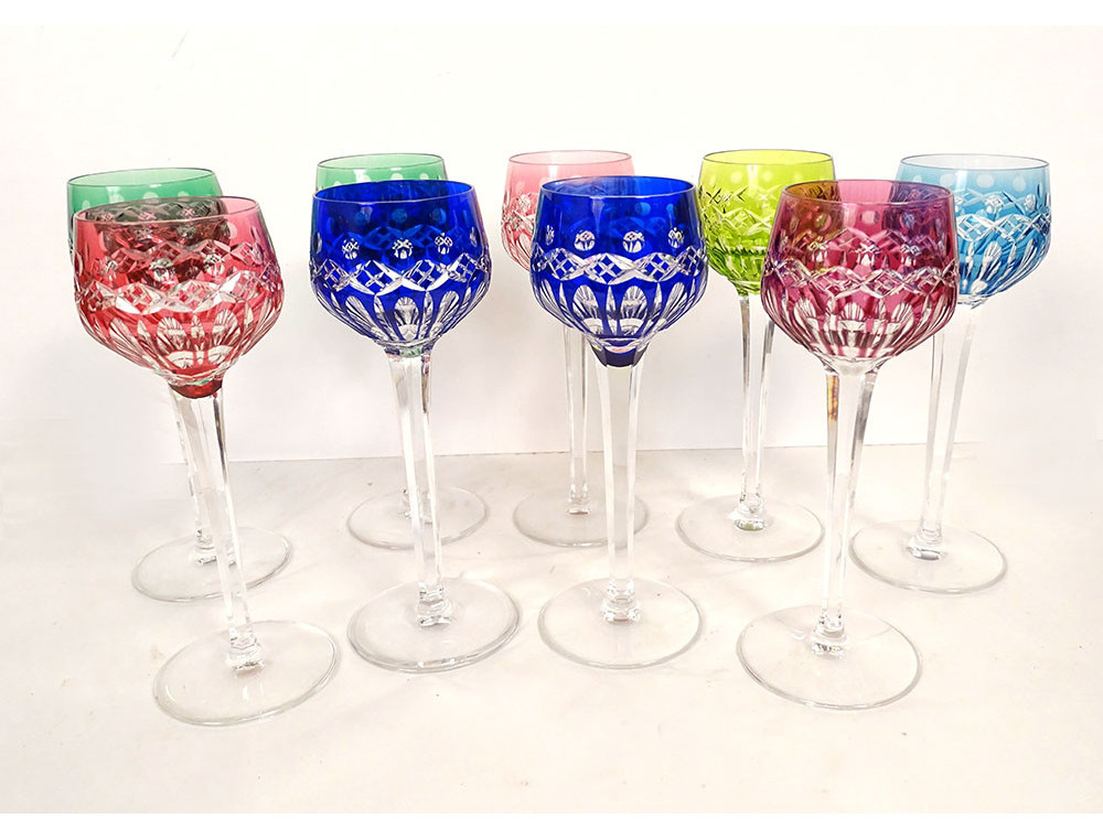Set of 9 Rhine wine glasses known as "Roemers" in cut crystal from Saint-Louis with cross-hatched decoration, Traminer model in colour, from the 20th century.
