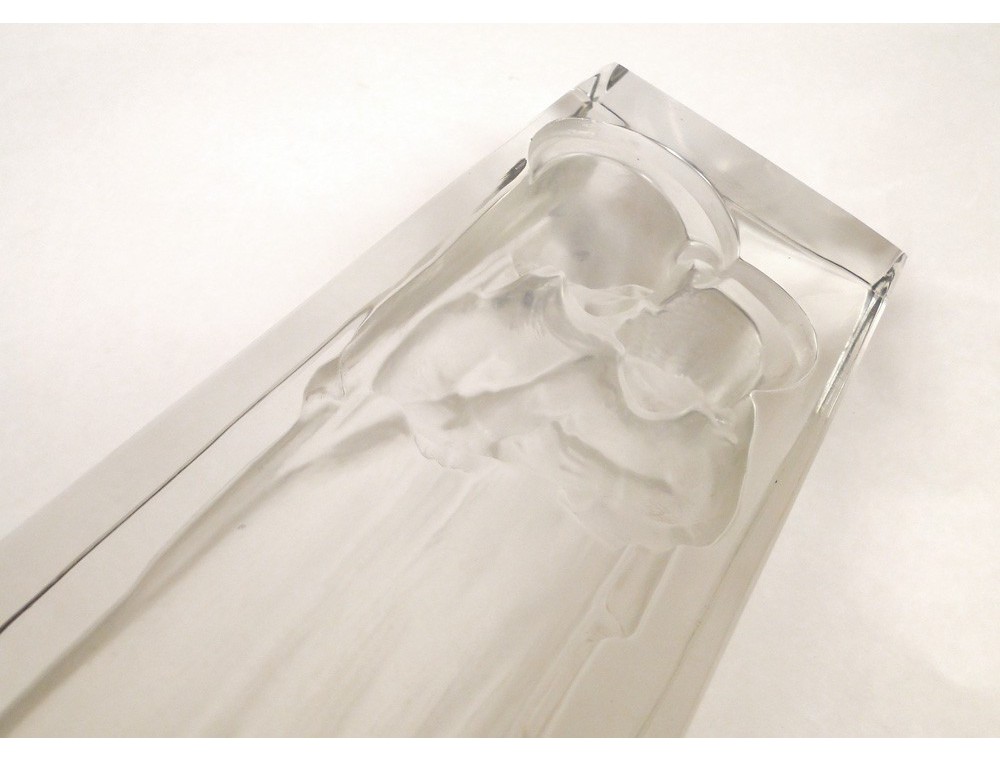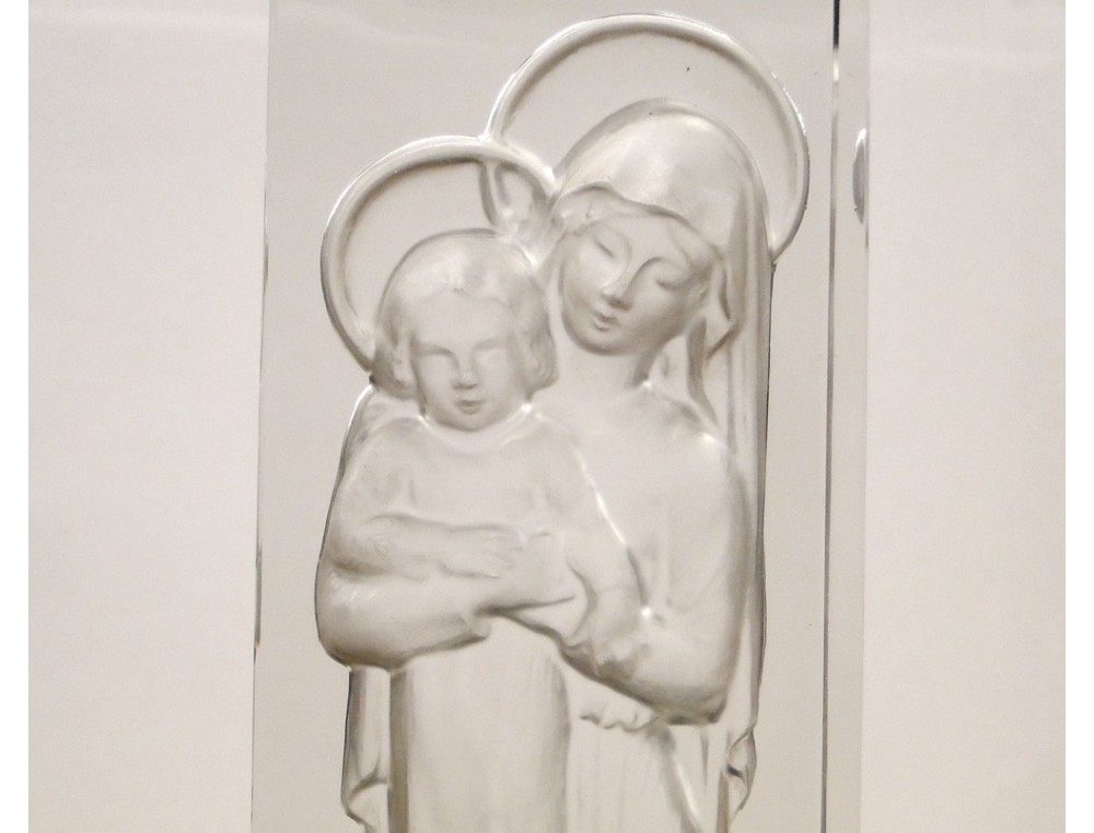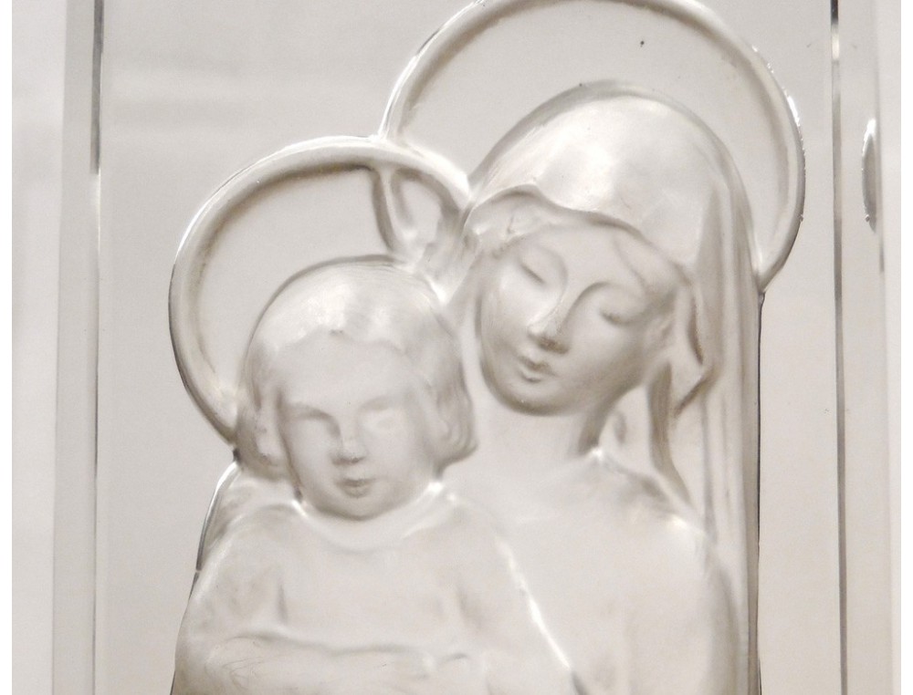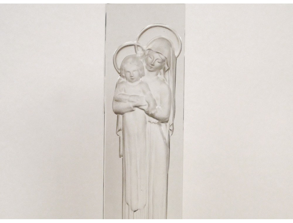 This sculpture is in very good condition. It is signed on the côté.Sujet religious "Virgin and Child" model created March 6, 1934, compression-molded white glass. (See catalog raisonné by Marcilhac).