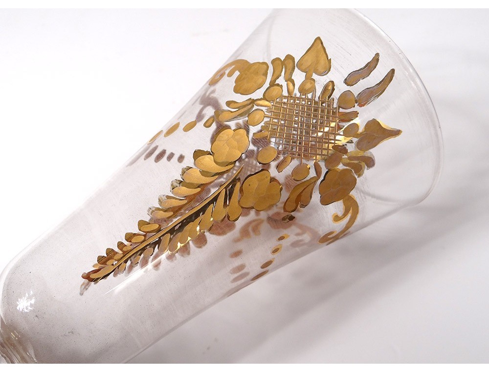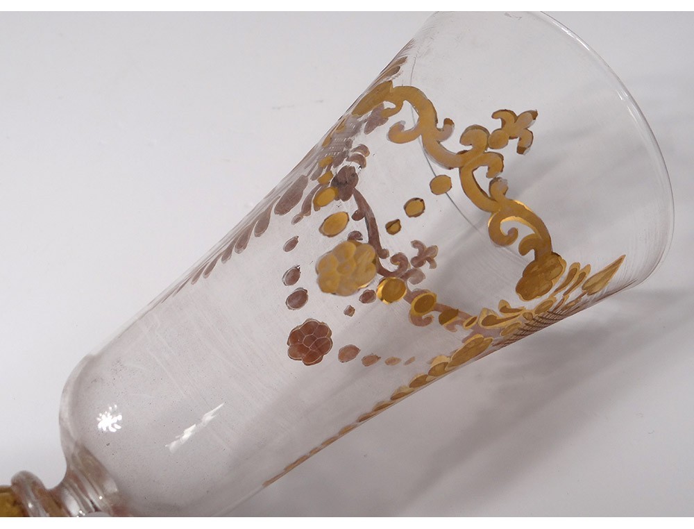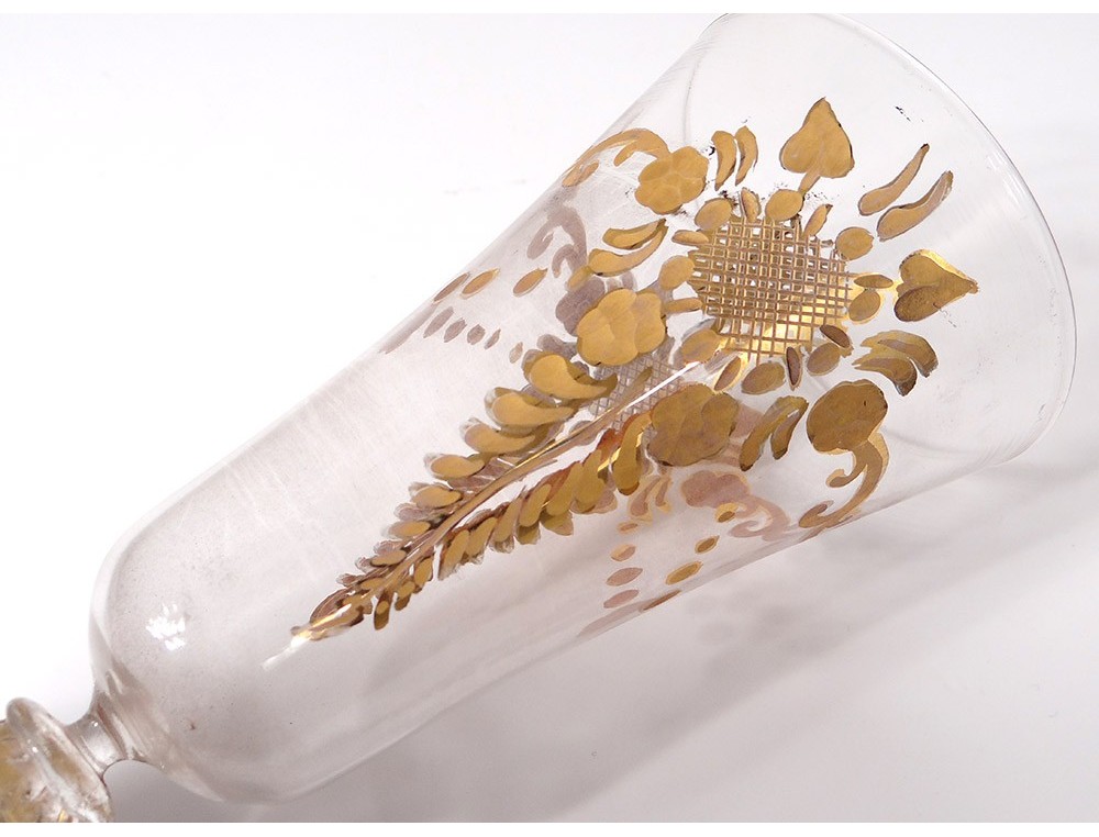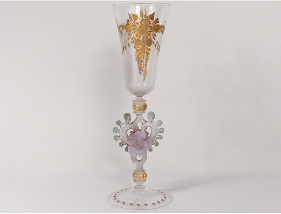 Goblet glassware from Murano (Venice, Italy), finely decorated with stylized vegetal pattern, shape flower colored applications and leaves on foot twisted, vintage late XIXème- early twentieth centuries.
