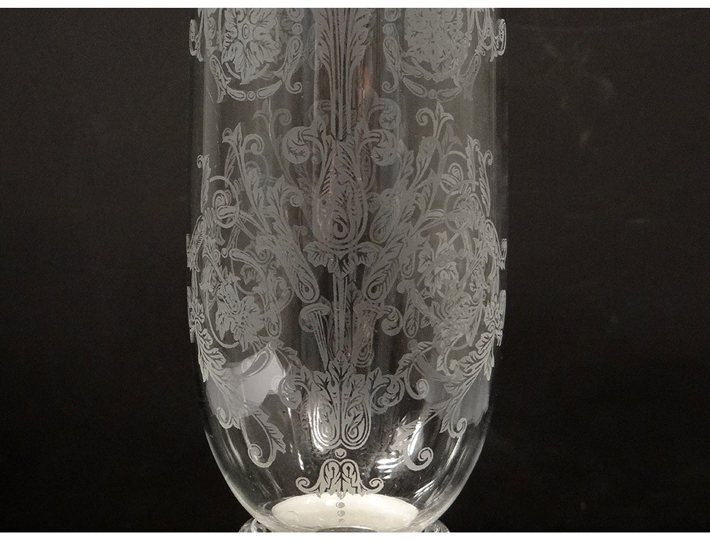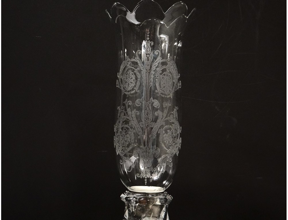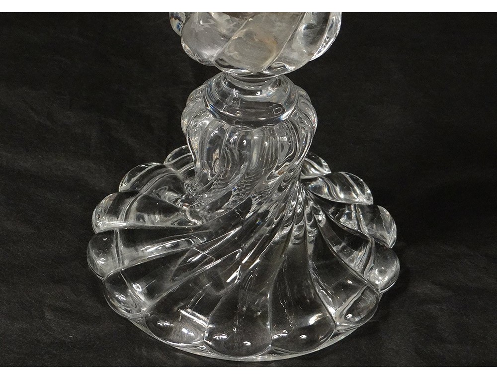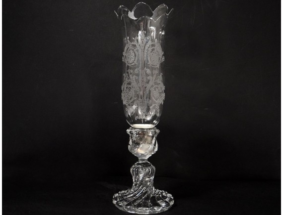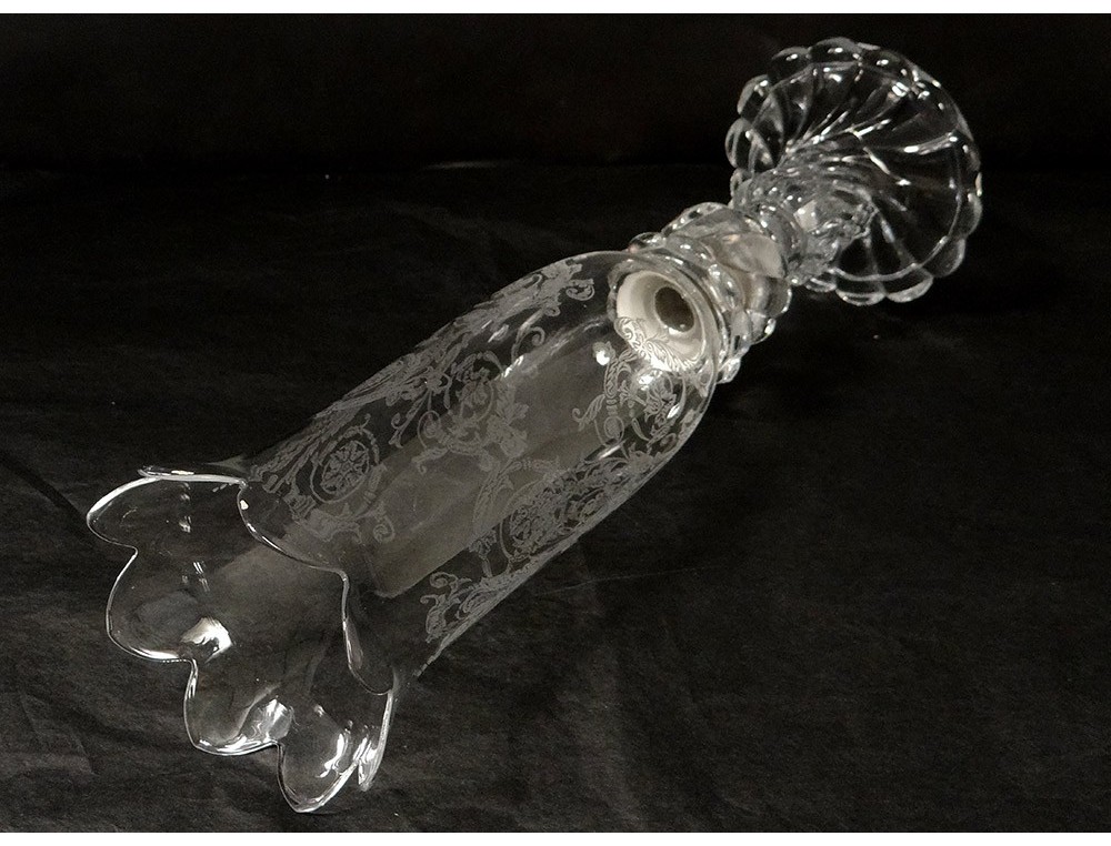 Crystal tealight signed Baccarat France, bamboo pattern, horn engraved with plant arabesques, twisted foot, vintage twentieth century.