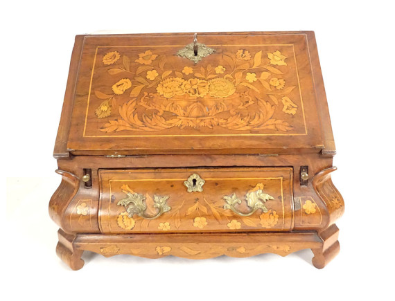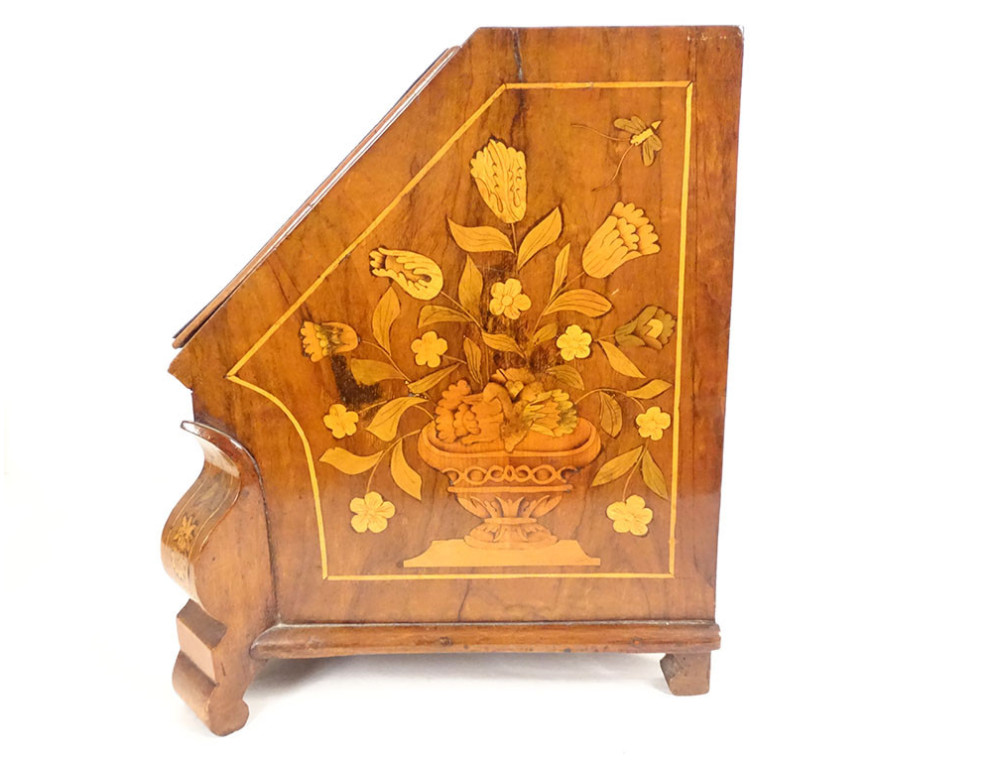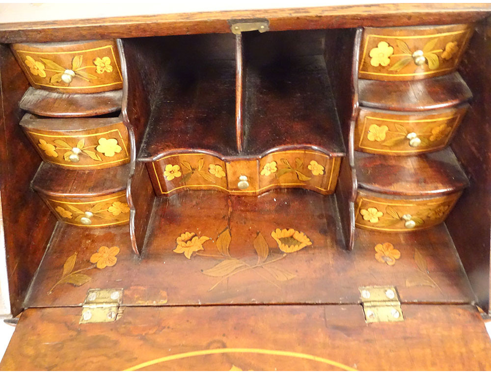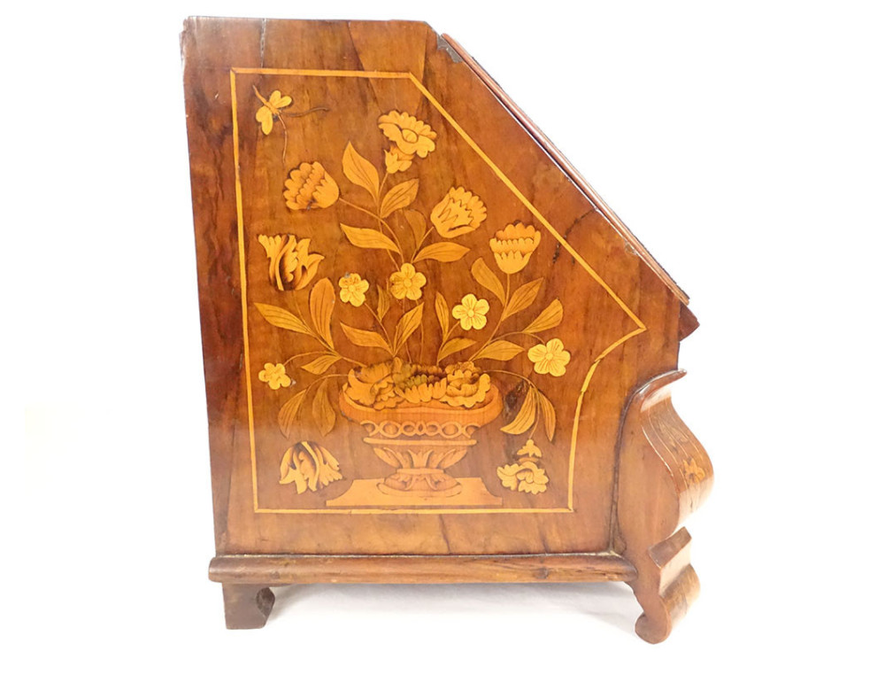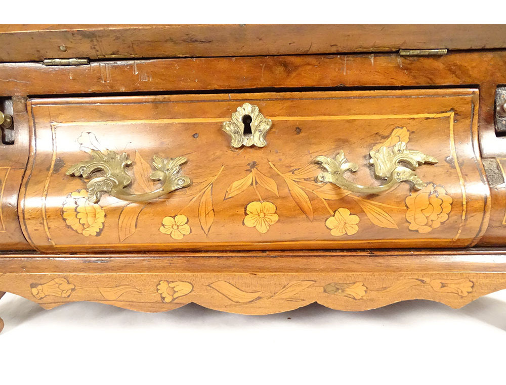 Dutch master cabinet/scriban desk, in rosewood marquetry and various wood veneers, with rich decoration of flowered baskets as well as various other flowers and foliage, opening to a drawer at the bottom, drop-front revealing compartments and small drawers, ornamentation in finely chiseled gilt bronze, early 19th century period.