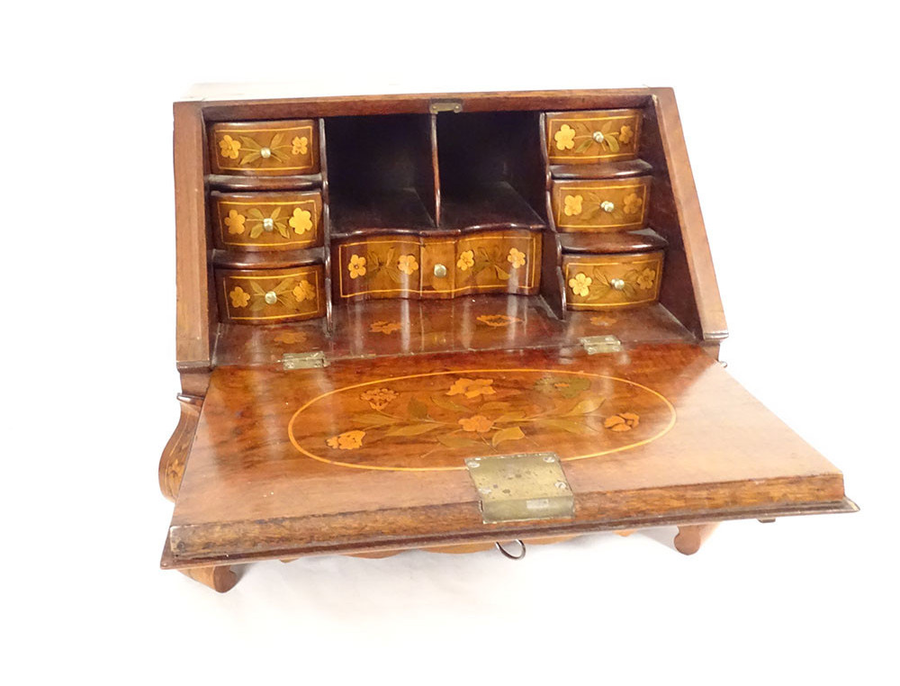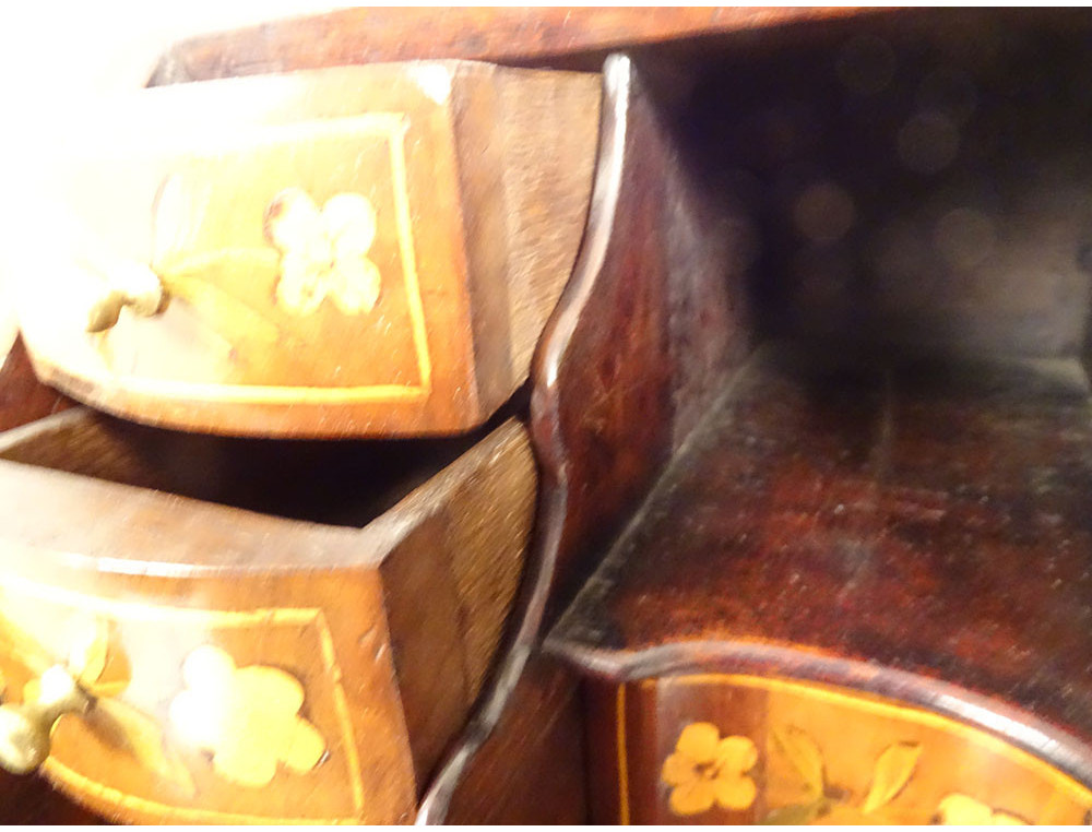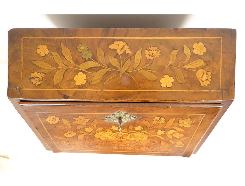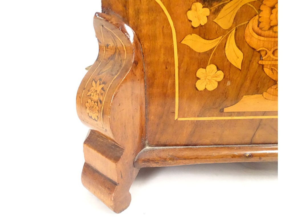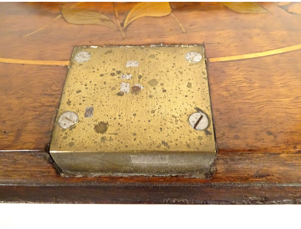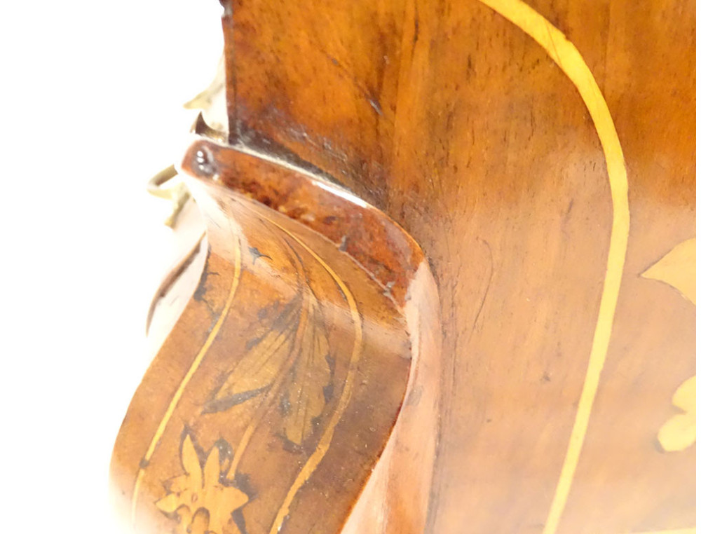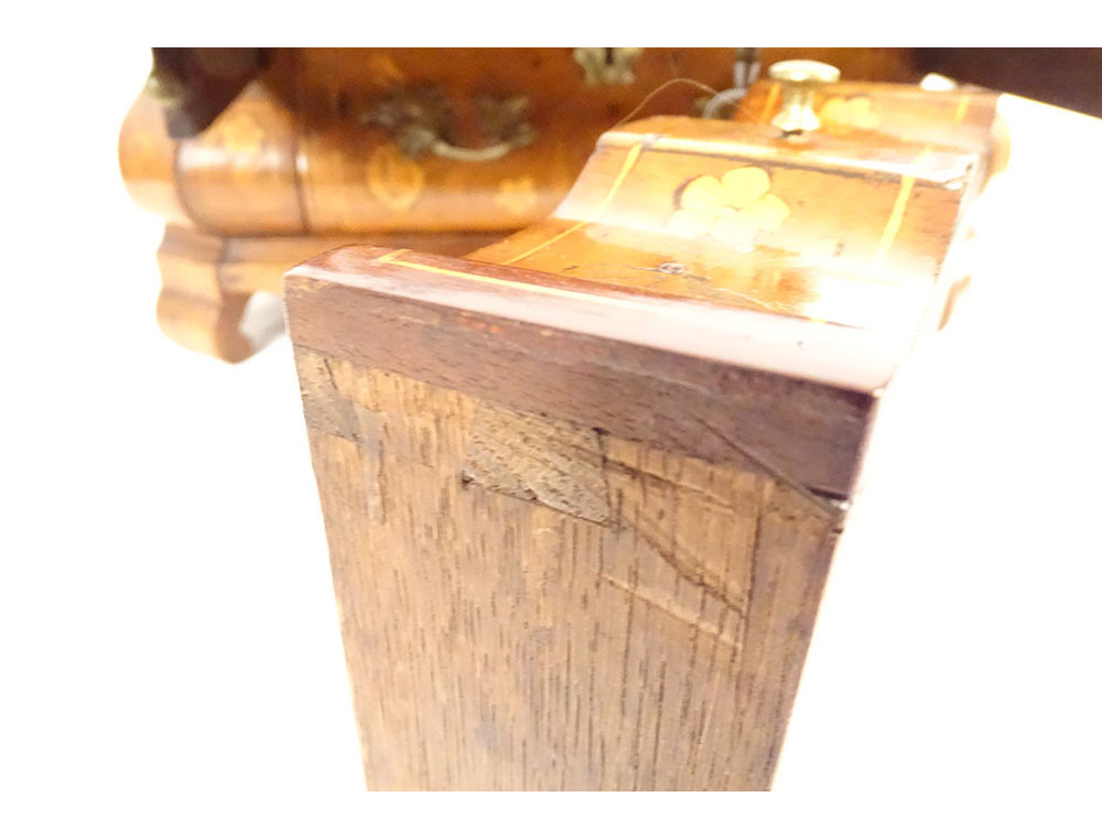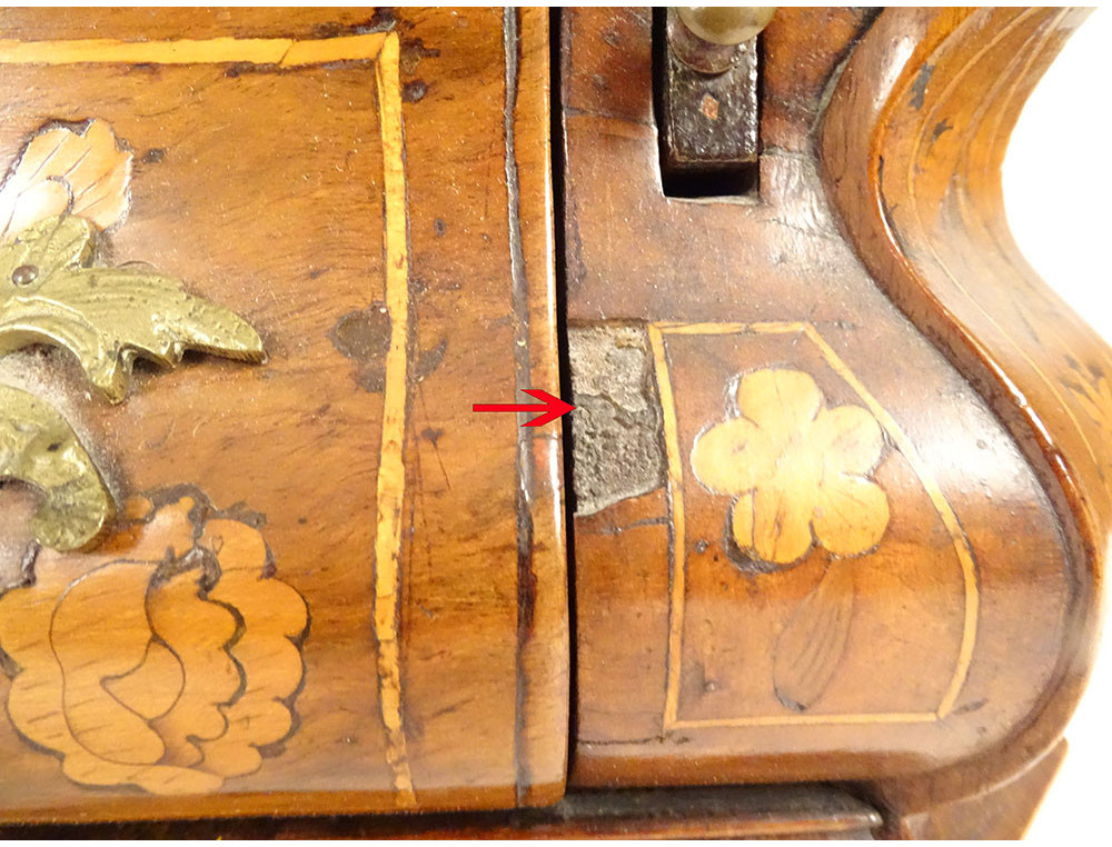 Please note: there is a small accident and missing veneer on the front side of the drawer, a few small cracks, tiny missing marquetry, scratches and wear consistent with age, please look carefully at the photos.