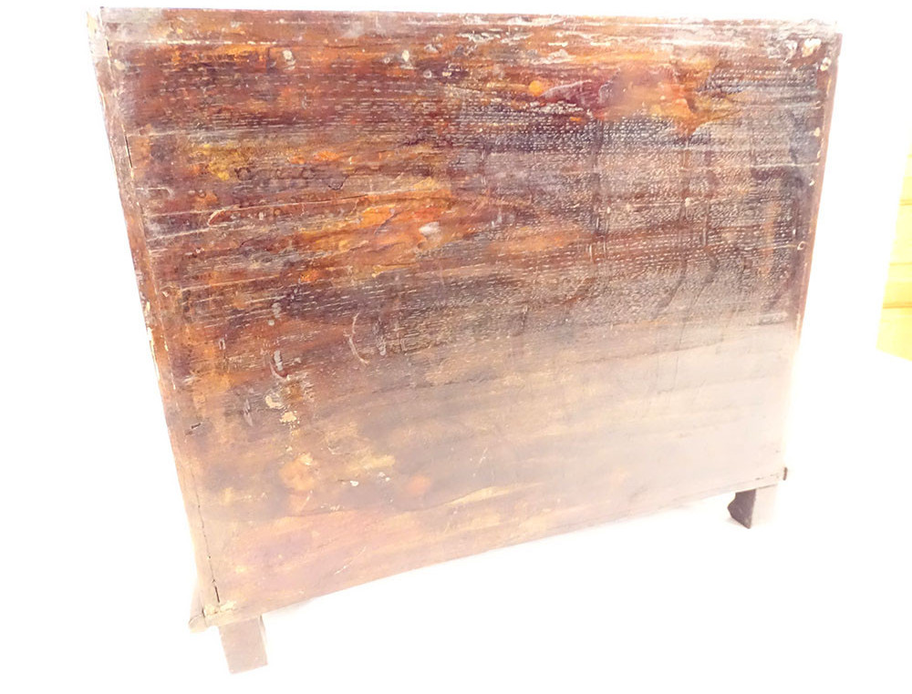 This piece of furniture is in good condition and of remarkable quality. We have its key. Two pull tabs protrude from the front to support the open drop-leaf.