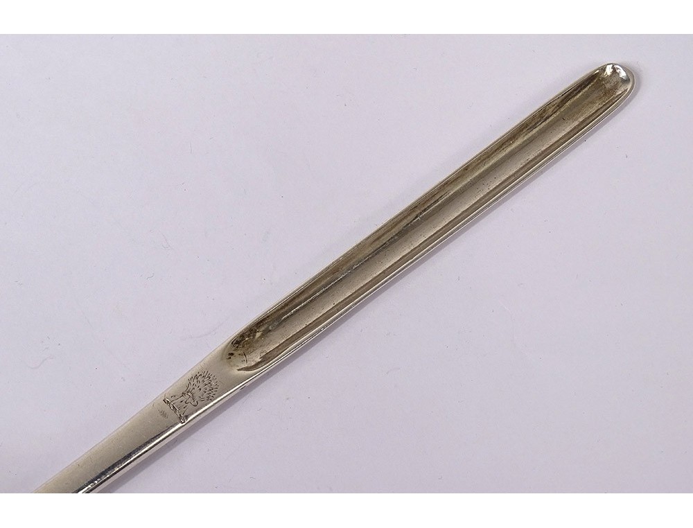 Maroon spoon in English sterling silver finely chiseled with a sheaf of wheat on the handle, hallmark of the passing lion and crowned Leopard head (London), silversmith JL for John Lampfert (around 1749-1771), from the 18th century.